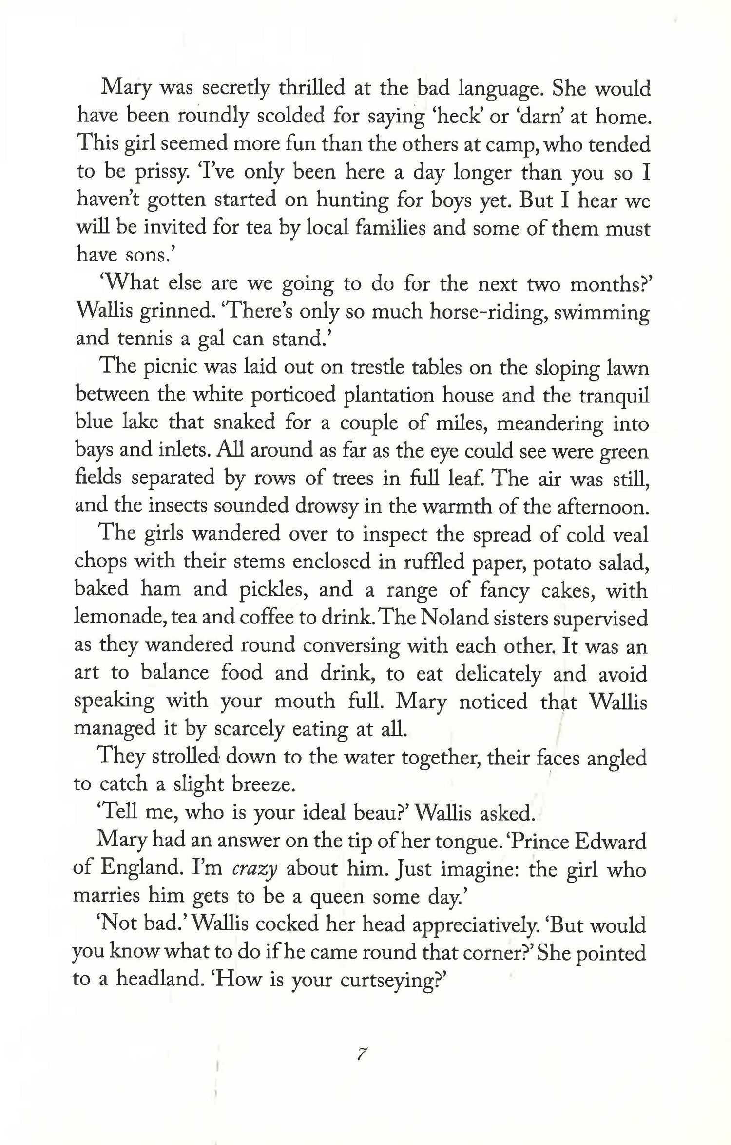 At the age of fifteen, carefree Mary Kirk and indomitable Wallis Warfield meet at summer camp. Their friendship will survive heartbreaks, separation and the demands of the British Crown until it is shattered by one unforgivable betrayal.