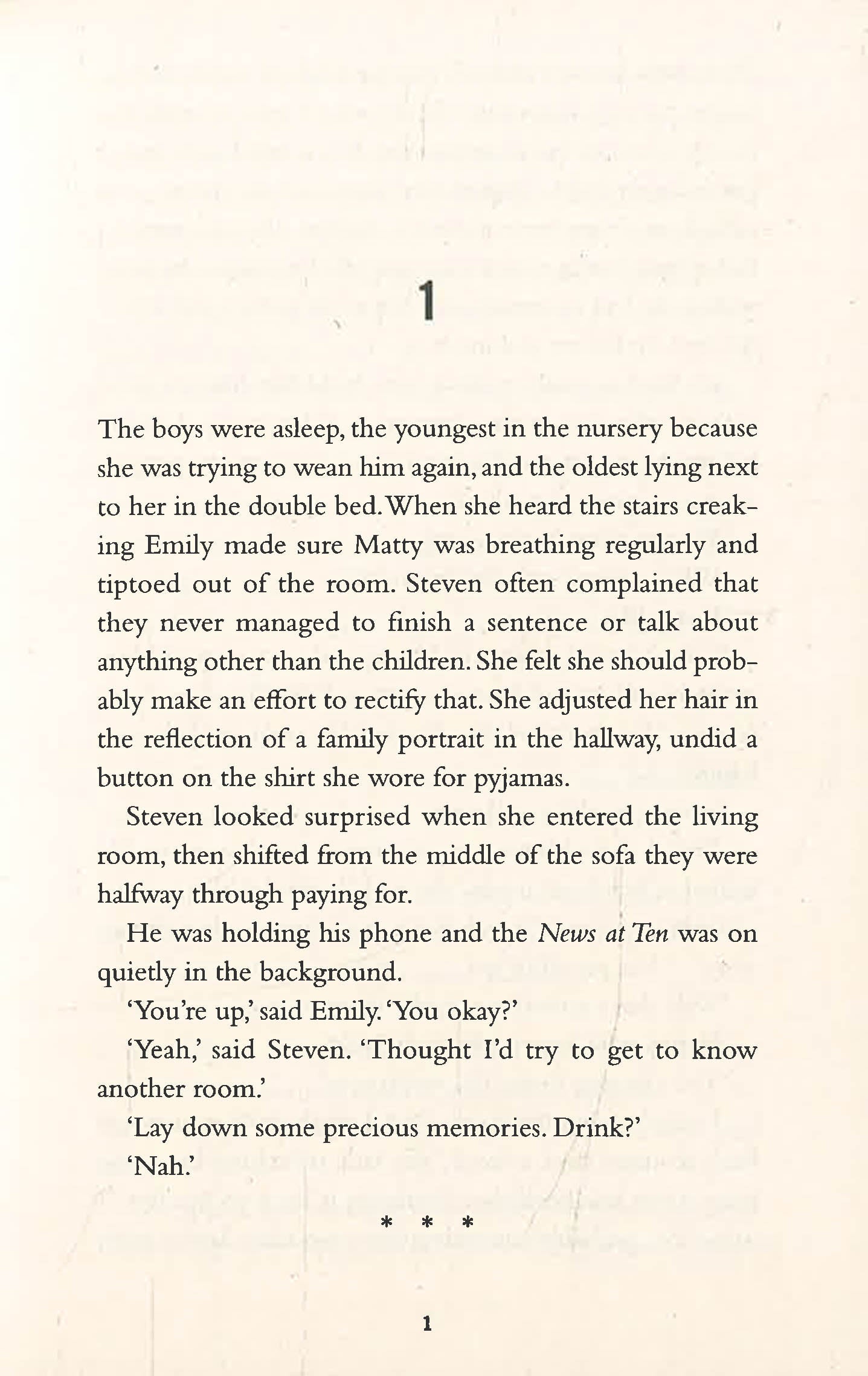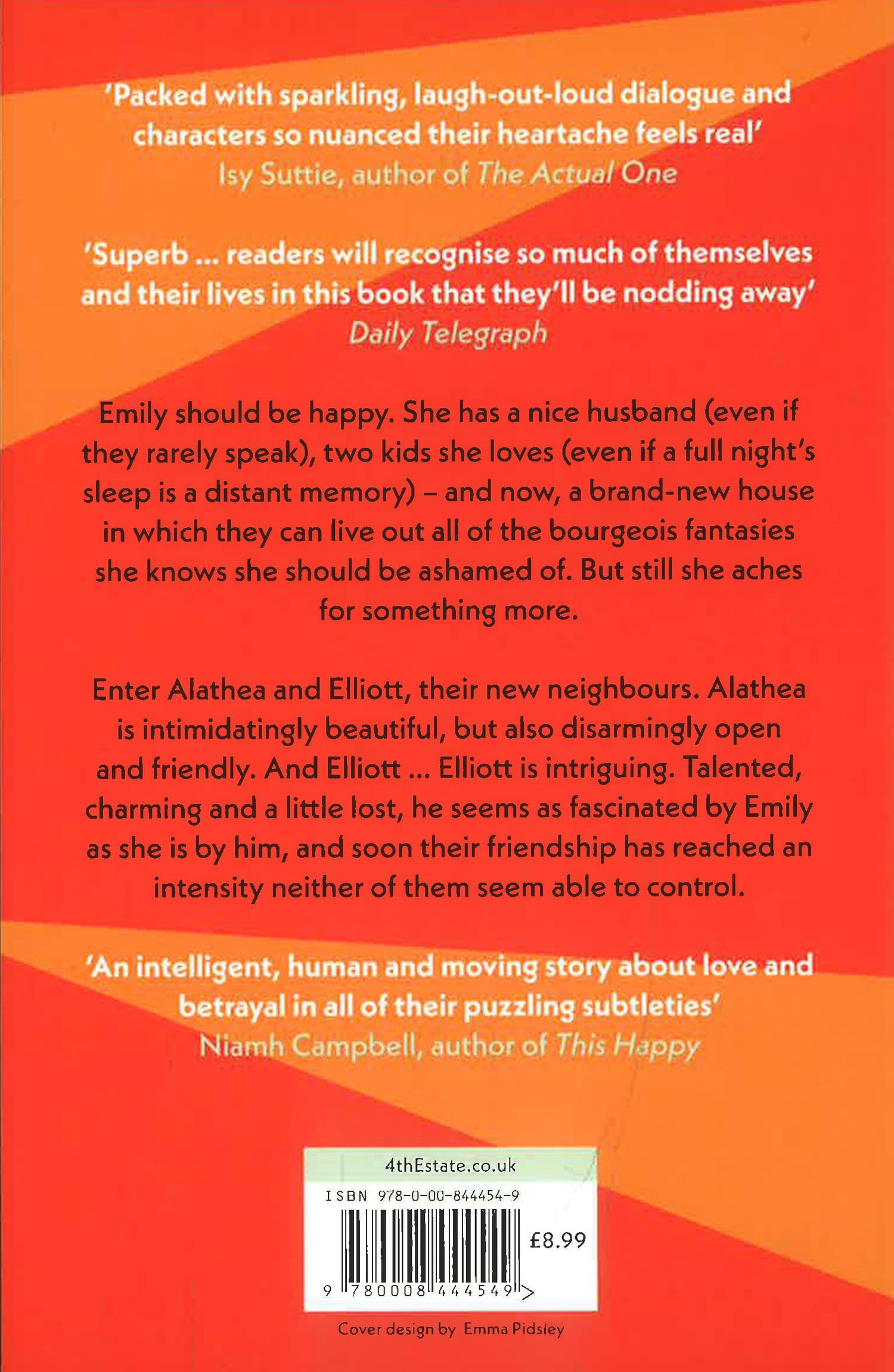 Enter Alathea and Elliott, their new neighbours, and also parents of two young boys. Alathea is intimidatingly confident and beautiful, but also disarmingly open and friendly. And Elliott … Elliott is intriguing. Dishevelled, talented, charming and a little lost, he seems as fascinated by Emily as she is by him, and soon their friendship has reached an intensity neither of them seem able to control.