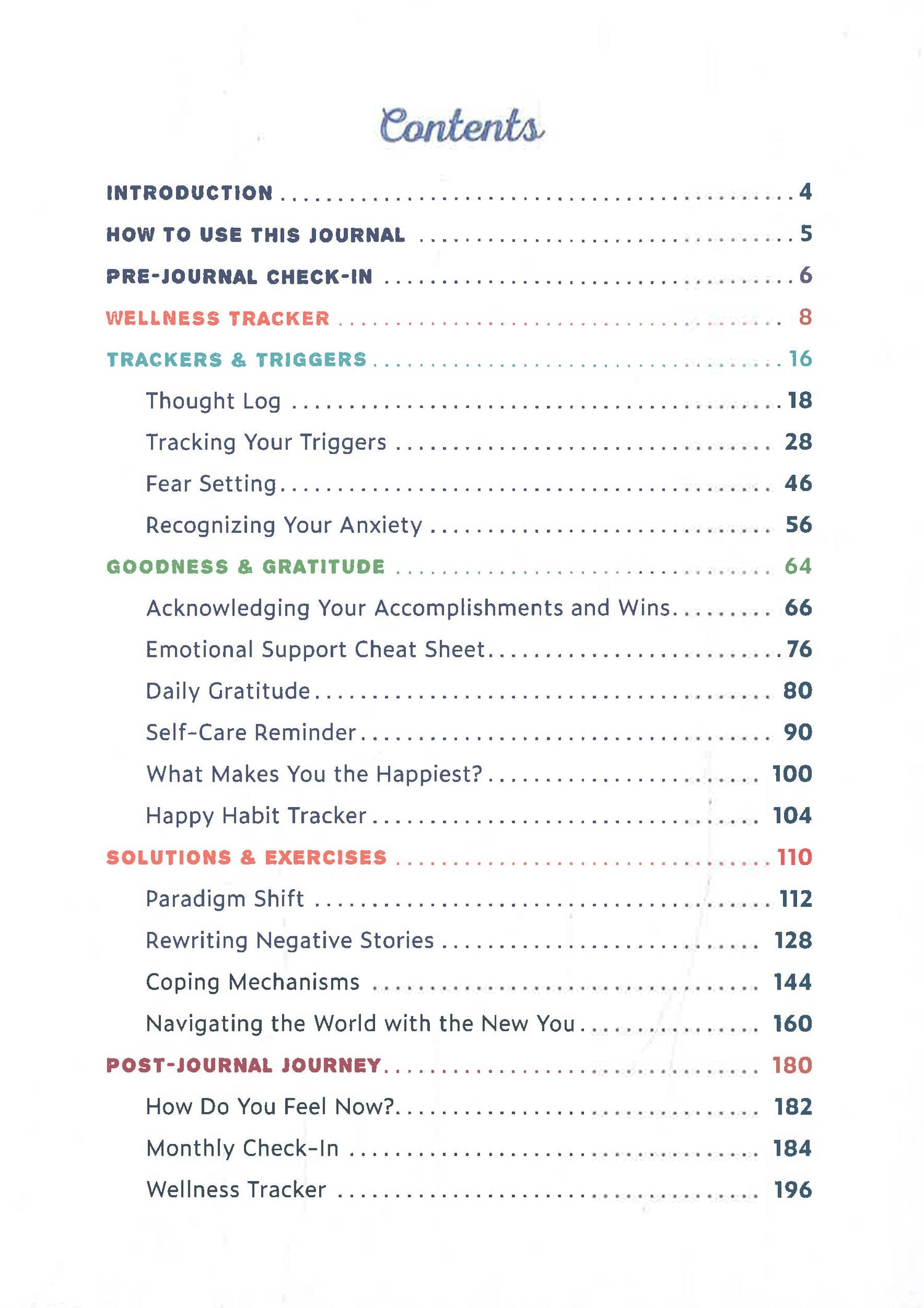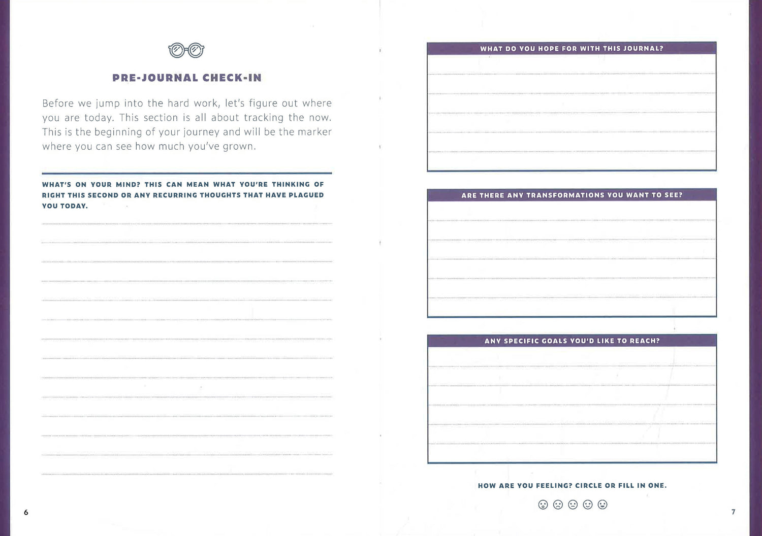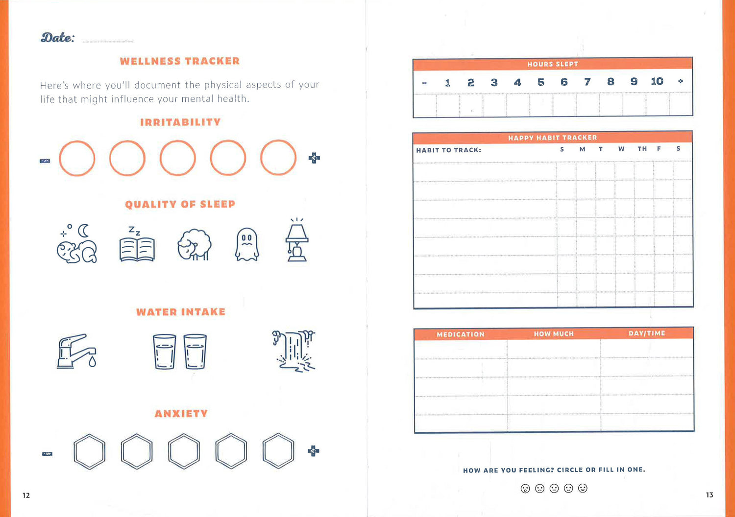 Within these pages, you'll find mood and wellness trackers to show how your feelings change over time. They'll track you physical activity, your water intake, your overall sleep quality and anxiety levels. Be patient with yourself as your work through your emotions, and remember, you