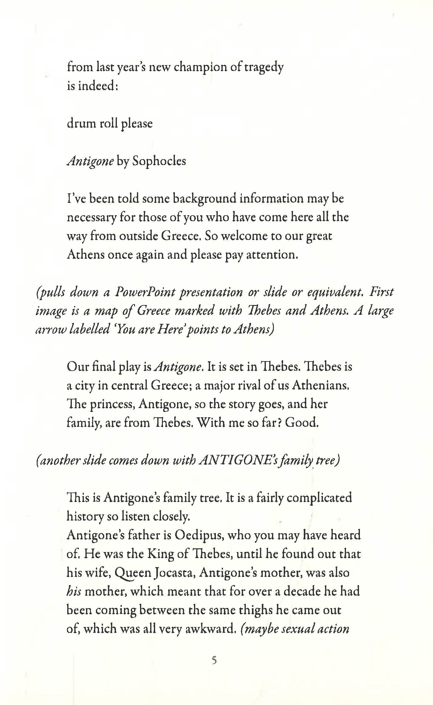 As the daughter of Oedipus, Antigone was dealt a cruel hand at birth - even within the bounds of Grecian tragedy. When her brothers are slain fighting for the throne of Thebes, Antigone finds herself pitted against her uncle, the newly crowned King Creon. In defiance of the king, Antigone buries her brother's body, a choice she may pay for dearly.