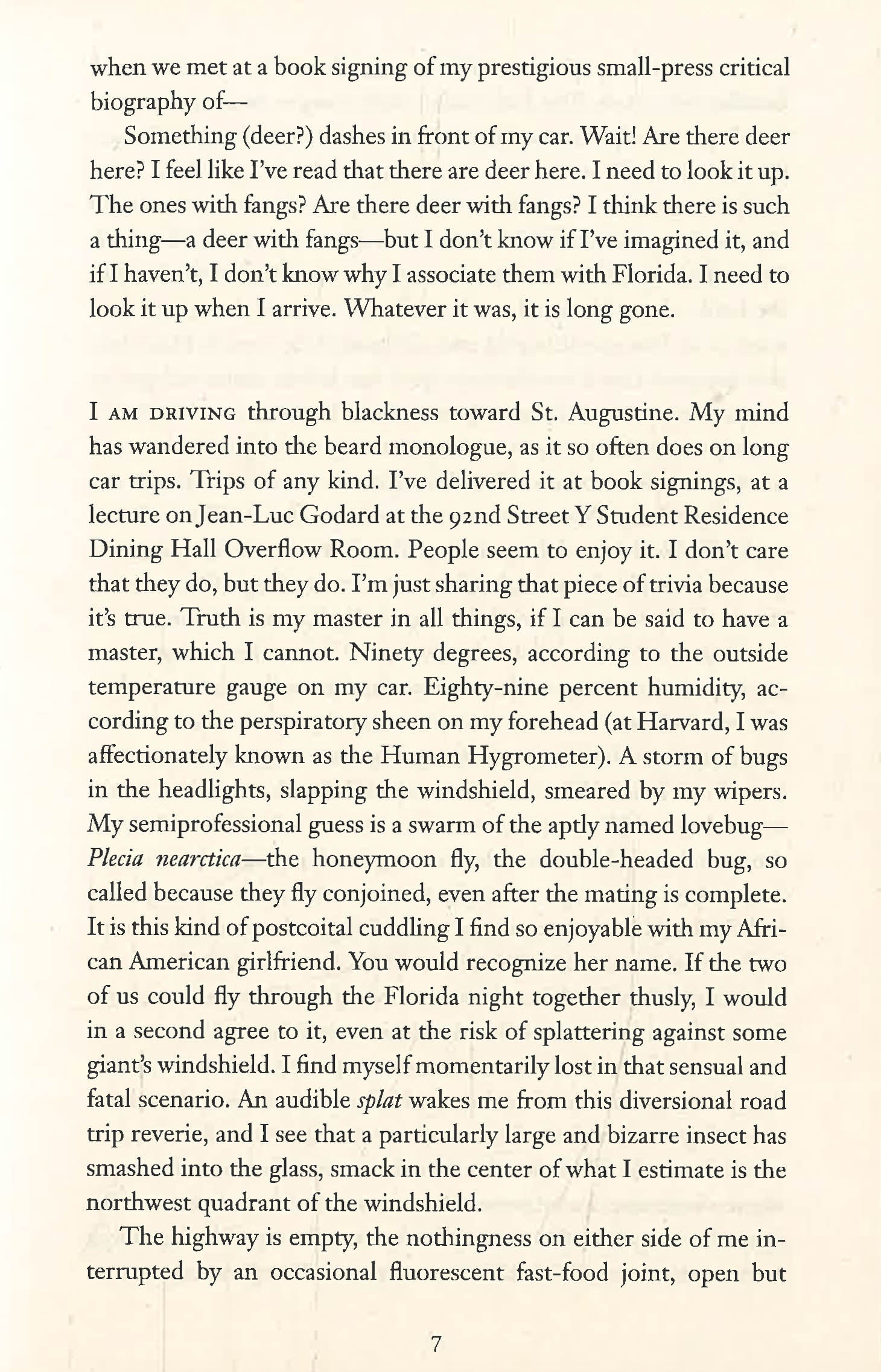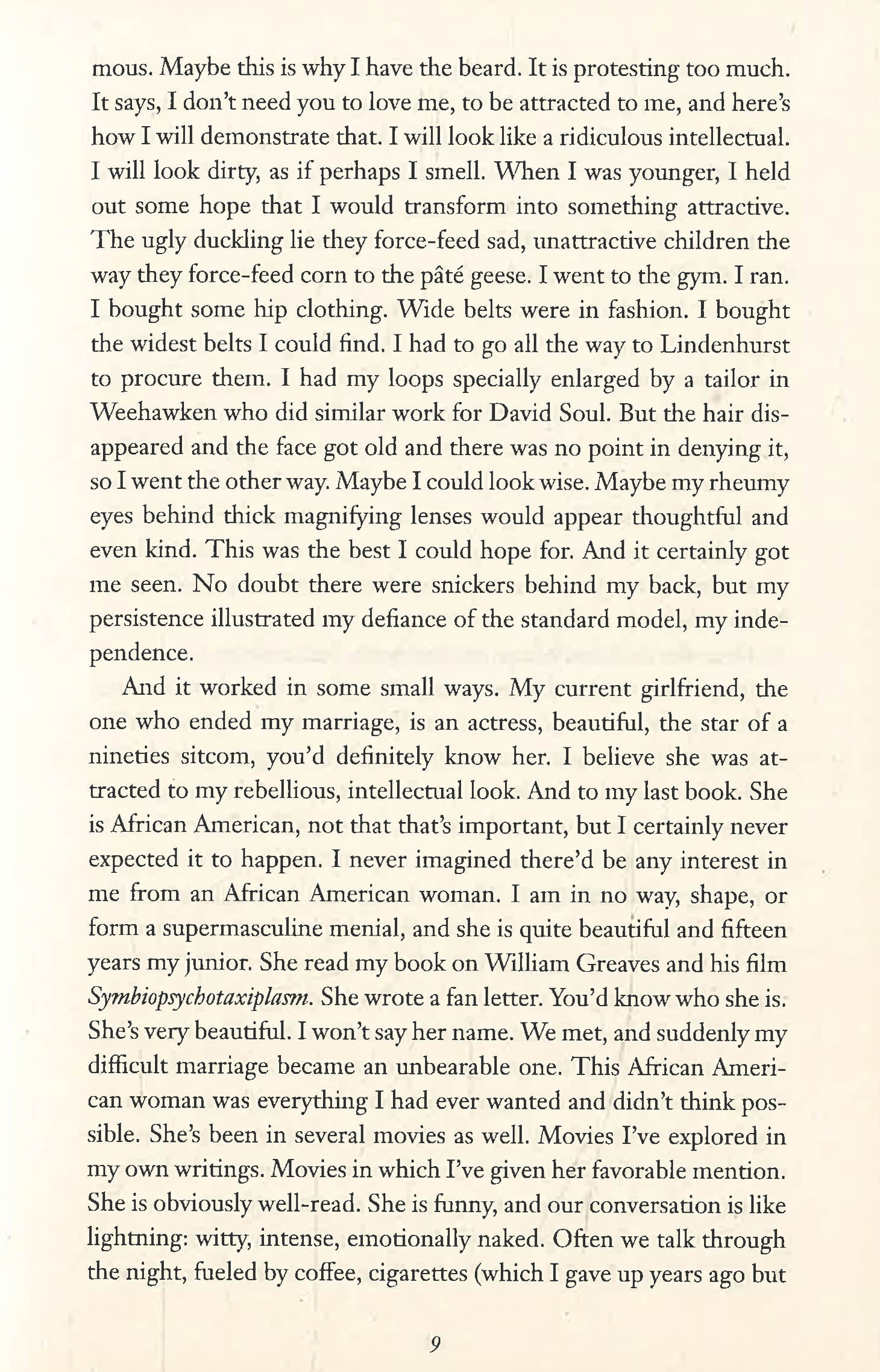 All that’s left is a single frame from which B. must somehow attempt to recall the work of art that just might be the last great hope of civilization. Thus begins a mind-boggling journey through the hilarious nightmarescape of a psyche as lushly Kafkaesque as it is atrophied by the relentless spew of Twitter. Desperate to impose order on an increasingly nonsensical existence, trapped in a self-imposed prison of aspirational victimhood and degeneratively inclusive language, B. scrambles to re-create the lost masterwork while attempting to keep pace with an ever-fracturing culture of “likes” and arbitrary denunciations that are simultaneously his bête noire and his raison d’être.