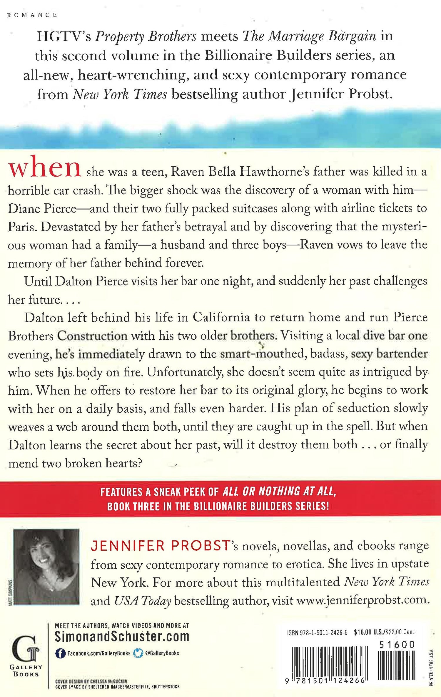HGTV's Property Brothers meets The Marriage Bargain in this second volume in the Billionaire Builders series, an all-new heart-wrenching and sexy contemporary romance from New York Times bestselling author Jennifer Probst. When she was a teen, Raven Bella Stratton's father was killed in a horrible car crash. The bigger shock was the discovery of a woman with him--Diana Pierce--and their two fully packed suitcases with airline tickets to Paris. Devastated by her father's betrayal, Raven went to live with her aunt, never truly overcoming the traumatic event. When she discovers that the mysterious woman had a family with a husband and three boys, Raven vows to leave the memory of her father behind. Until Dalton Pierce visits one night and suddenly her past challenges her future... Leaving his life in California behind to run Pierce Construction with his two older brothers, Dalton Pierce has enjoyed returning home and studying his passion of woodworking. But when he visits the local bar with his brothers one evening, he's immediately drawn to the smart-mouthed, badass, sexy bartender who sets his body on fire. Unfortunately, she doesn't seem as intrigued by him, and his multiple advances are met with rejection. When he offers to restore the bar back to its original glory, he begins to work with her on a daily basis, and falls harder. His plan of seduction slowly weaves a web around them both, until they are caught up in the spell. But Dalton doesn't know the secret that can either destroy them both...or finally mend two broken hearts.