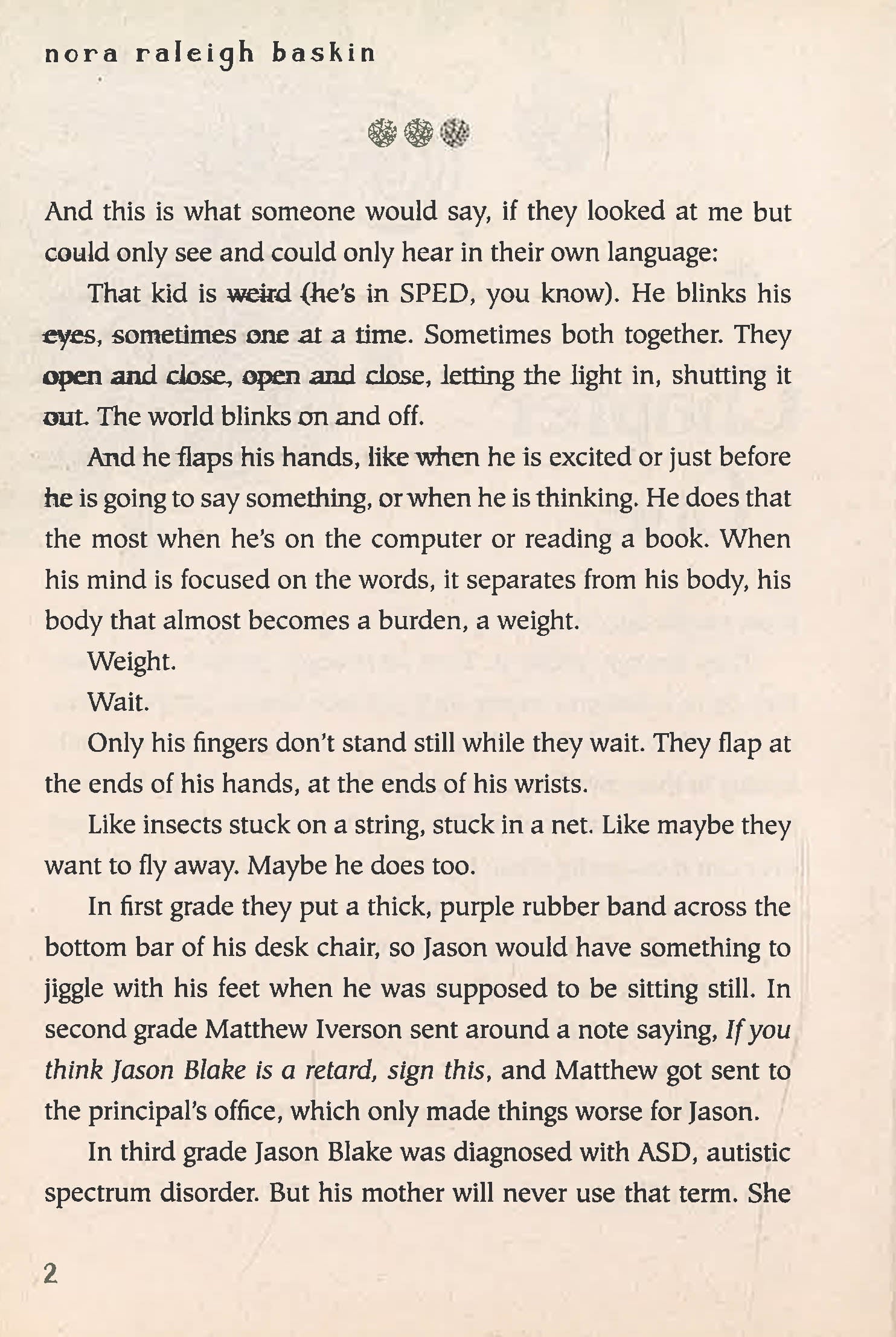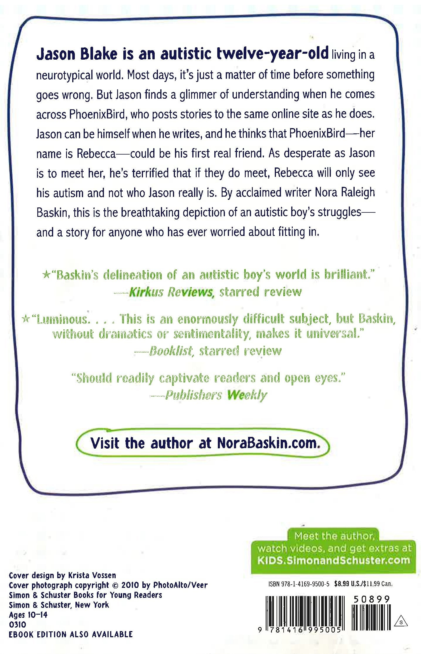 Jason Blake is an autistic 12-year-old living in a neurotypical world. Most days it's just a matter of time before something goes wrong. But Jason finds a glimmer of understanding when he comes across PhoenixBird, who posts stories to the same online site as he does. Jason can be himself when he writes and he thinks that PhoenixBird - her name is Rebecca - could be his first real friend. But as desperate as Jason is to met her, he's terrified that if they do meet, Rebecca will only see his autism and not who Jason really is.