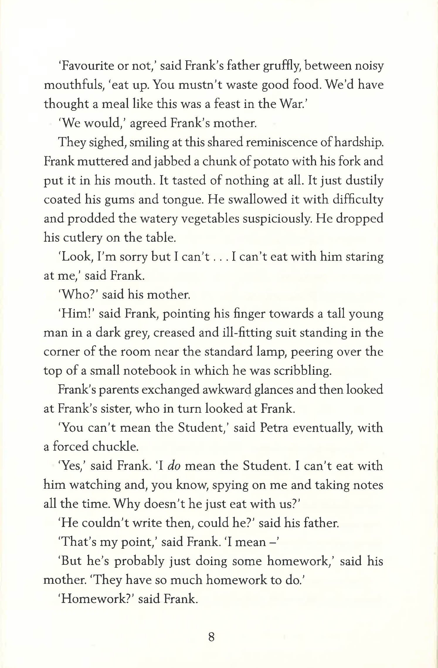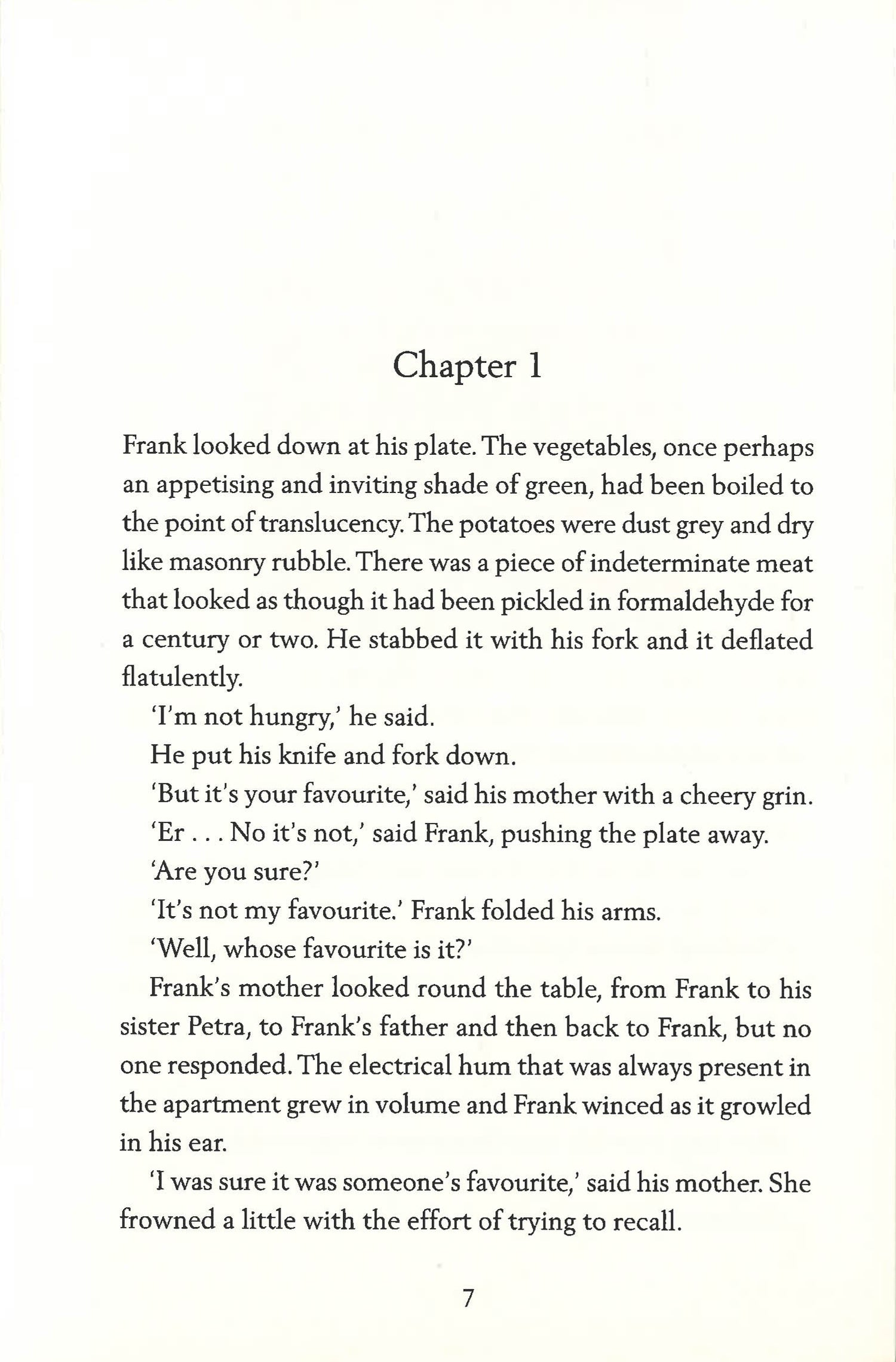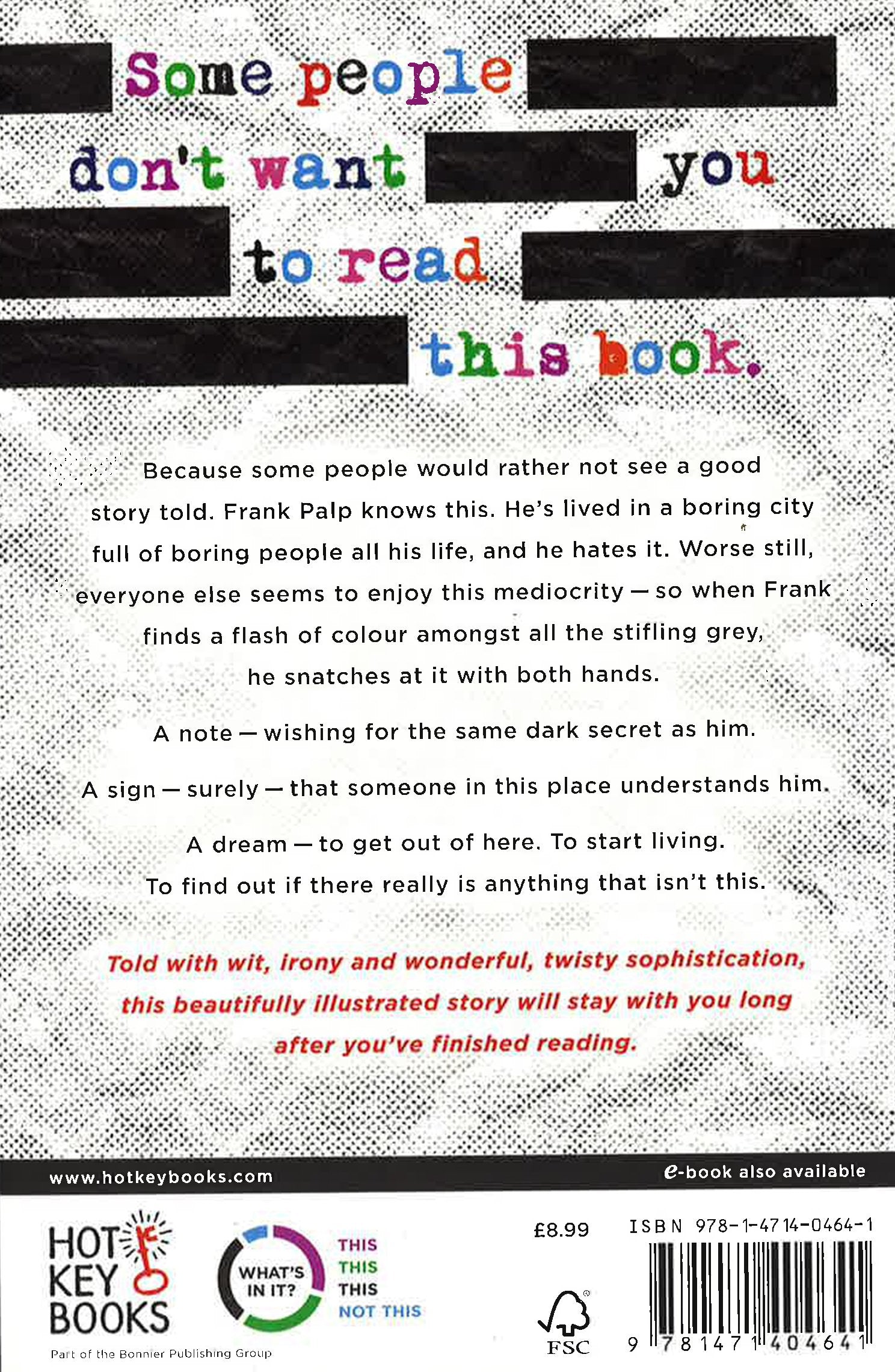 Shortlisted for the Peters Book of the Year. Seventeen year old Frank Palp lives in a grim little apartment, in a grim little building, in an exceedingly grim and rather large city. Cobbled streets and near-destroyed bridges lead one through Old Town and Old New Town, and war damaged houses stand alongside post war characterless, concrete hutches. Most people walk hunched over, a habit from avoiding snipers, but others are proud to stand tall and make the world take notice ...This is a city full of contradictions, and Frank is no exception. He mostly hates his life, he definitely hates the ludicrous city he is forced to live in and he absolutely with complete certainty hates the idiots he's surrounded by ...and yet he is in love. A love so pure and sparkling and colourful, Frank feels sure it is 'meant to be'. His love is a reward for all the terrible grey that he is surrounded by which would be great, if the girl in question knew he existed and then one day, the perfect sign lands in his lap. A message, in a bottle. A wish, for 'anything that isn't this'. The girl who wrote this is surely his soulmate - and now he just needs to find her.