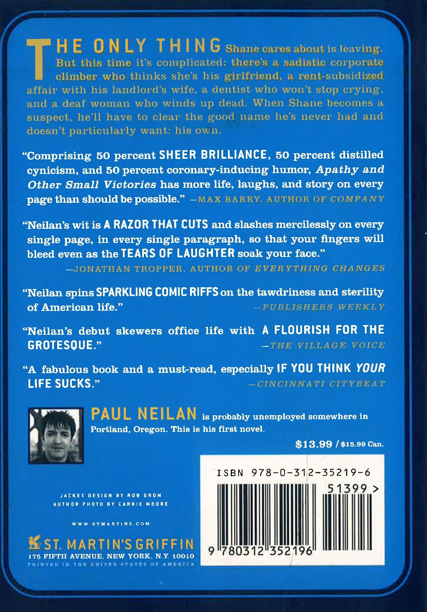 A scathingly funny debut novel about disillusionment, indifference, and one man's desperate fight to assign absolutely no meaning to modern life. The only thing Shane cares about is leaving. Usually on a Greyhound bus, right before his life falls apart again. Just like he planned. But this time it's complicated: there's a sadistic corporate climber who thinks she's his girlfriend, a rent-subsidized affair with his landlord's wife, and the bizarrely appealing deaf assistant to Shane's cosmically unstable dentist. When one of the women is murdered, and Shane is the only suspect who doesn't care enough to act like he didn't do it, the question becomes just how he'll clear the good name he never had and doesn't particularly want: his own. "The malaise of cubicle culture may be well-trodden comedic territory by now, but Neilan's debut skewers office life with a flourish for the grotesque." --The Village Voice