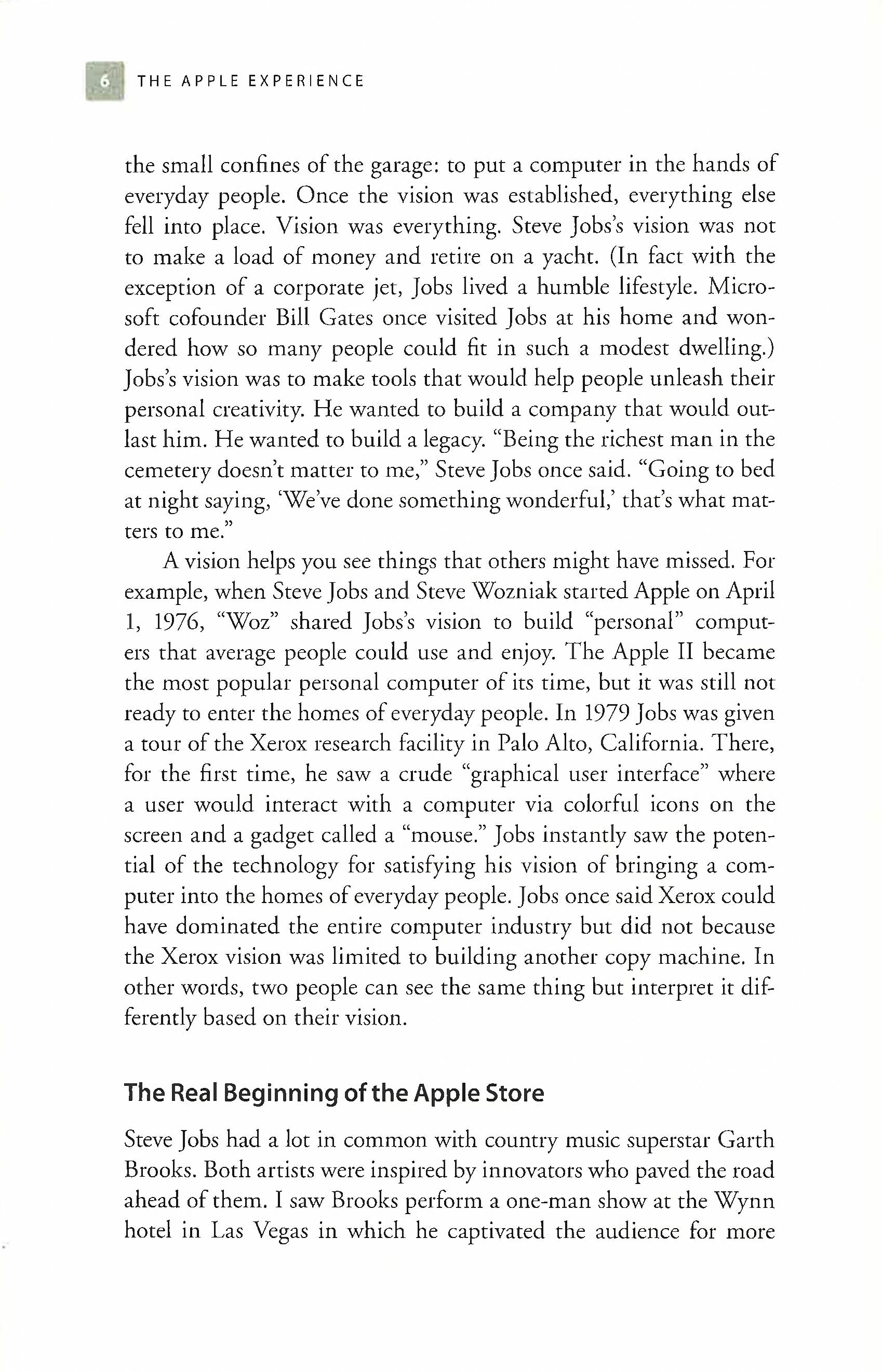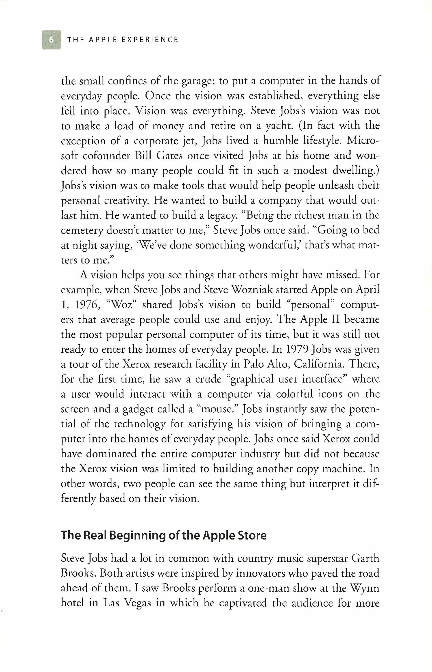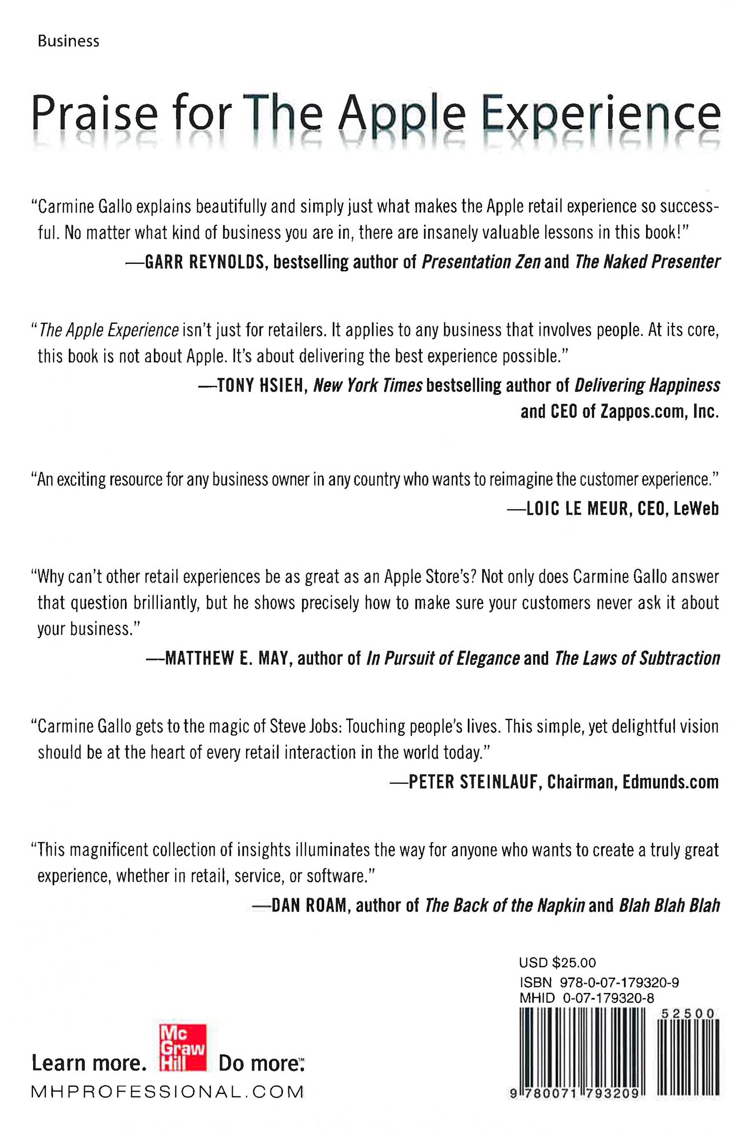 Apple's 5 Core Principles - Now in the Palm of Your Hand!Steve Jobs and Apple re-imagined retail in their iconic Apple Stores. The Apple Experience reveals the secrets to the pioneering brand's unparalleled success during one of the most difficult retail environments in decades.A global expert on the business methods of Steve Jobs, Carmine Gallo uncovers the five steps of service that the company's customer-facing employees follow in Apple Stores to engage customers.Any business that deals with people, both employees and customers, can adopt these techniques initiated by Steve Jobs to achieve Apple-like market dominance by enriching lives, building loyalty, and reimagining the customer experience."If you have a retail business then this is a must read...business owners and managers in any industry can benefit from the lessons" Strategist, April 2012