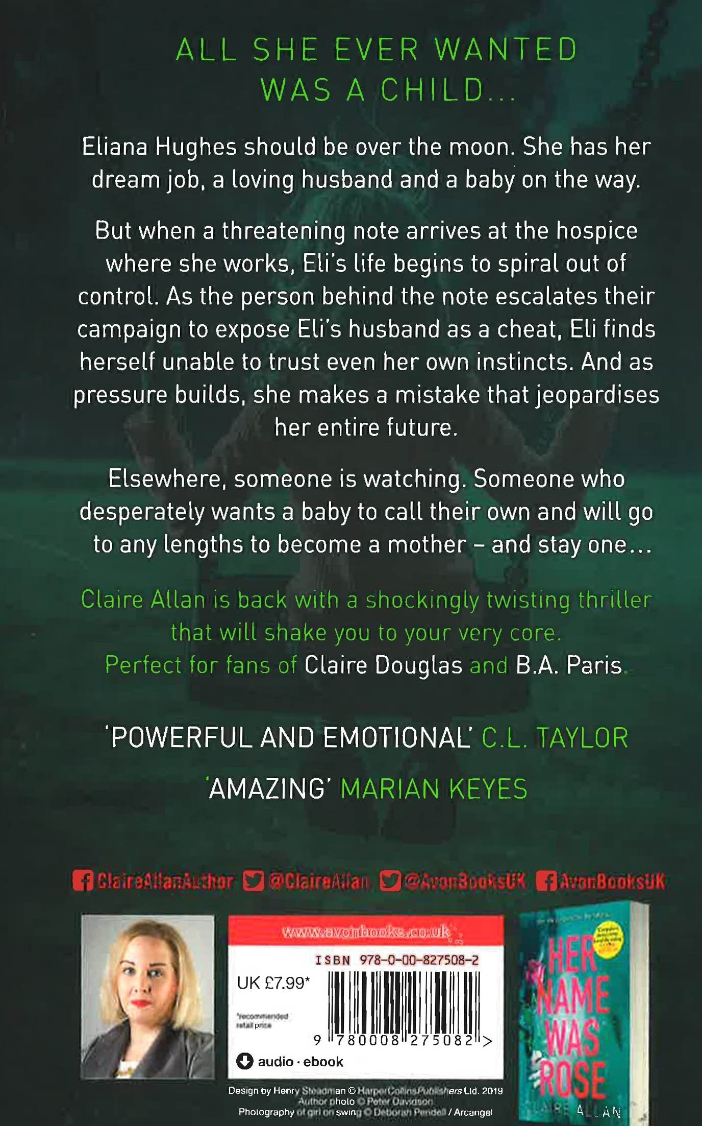 Just how far is a mother willing to go? When a mysterious note arrives for seven months pregnant nurse Eliana Hughes, she begins to doubt every aspect of her life - from her mixed feelings about motherhood to her marriage to Martin, who has become distant in recent months. As the person behind the note escalates their campaign to out Eli's husband as a cheat, she finds herself unable to trust even her own instincts, and as pressure builds she makes a mistake that jeopardises her entire future. Elsewhere, someone is watching. Someone who desperately wants a baby to call their own and will go to any lengths to become a mother - and stay a mother... A compelling psychological thriller that's perfect for fans of Rachell Abbott's The Shape of Lies and K.L. Slater's Finding Gracie.