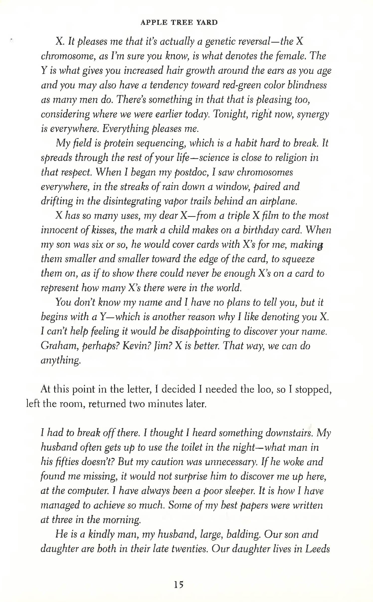 Yvonne Carmichael sits in the witness box. The charge is murder. Before all of this, she was happily married, a successful scientist, a mother of two. Now she is a suspect, squirming under florescent lights and the penetrating gaze of the alleged accomplice who is sitting across from her, watching: a man who is also her lover. As Yvonne faces hostile questioning, she must piece together the story of her affair with this unnamed figure who has charmed and haunted her. It is a tale of sexual intrigue and ruthless urges--and of danger, which has blindsided her from a seemingly innocuous angle. Here, in the courtroom, everything hinges on one night in a dark alley called Apple Tree Yard.