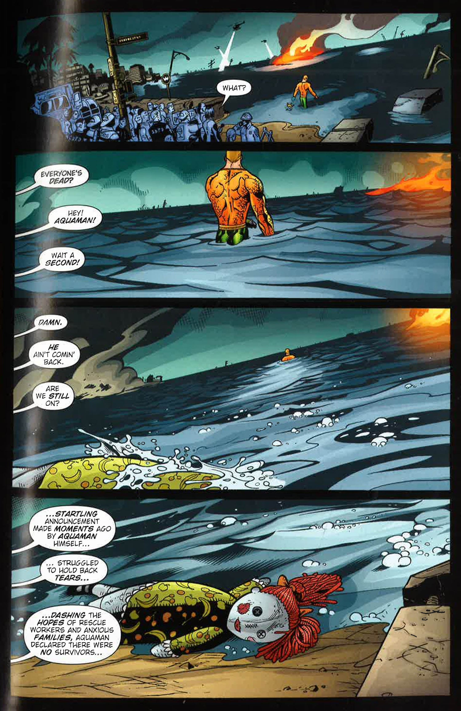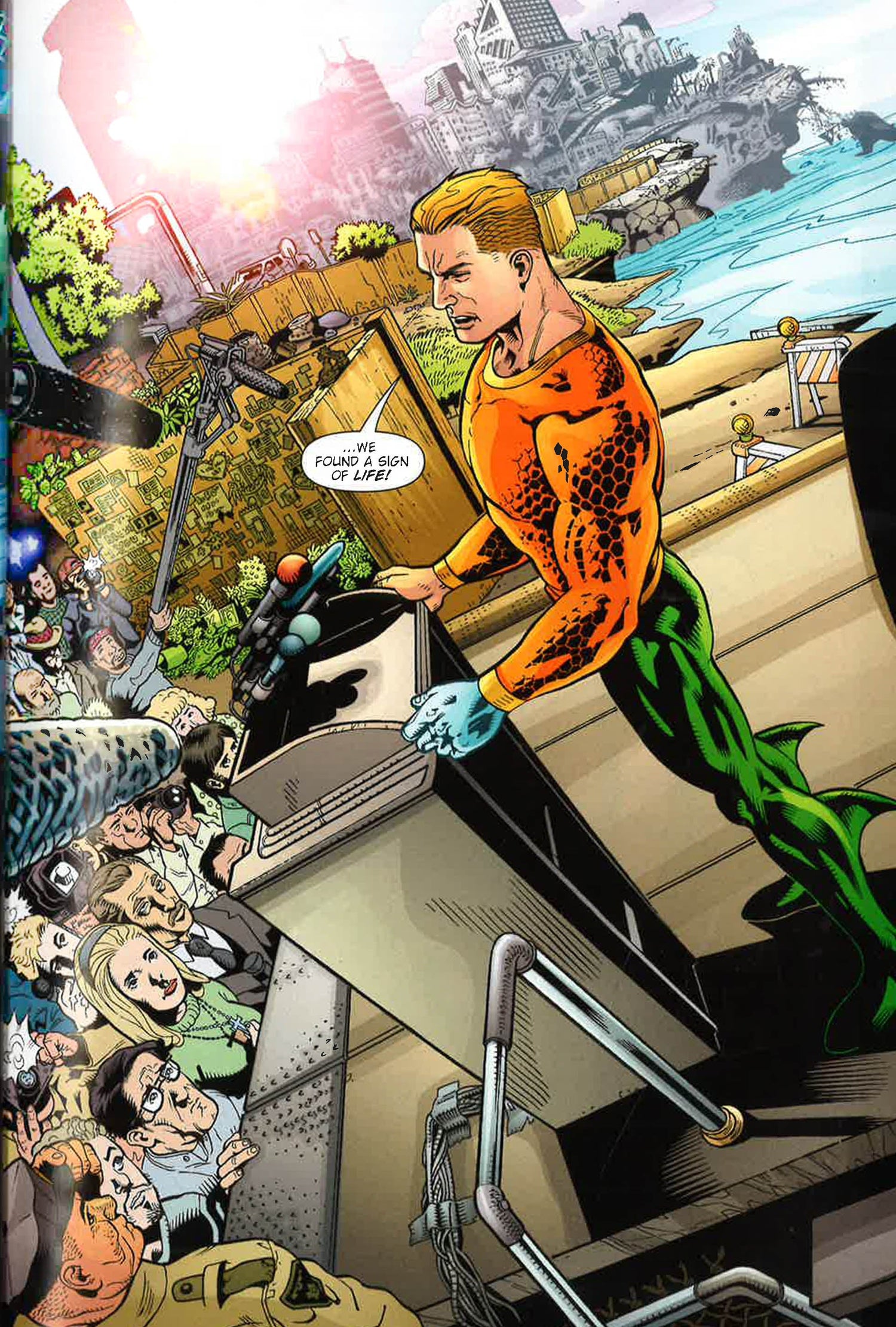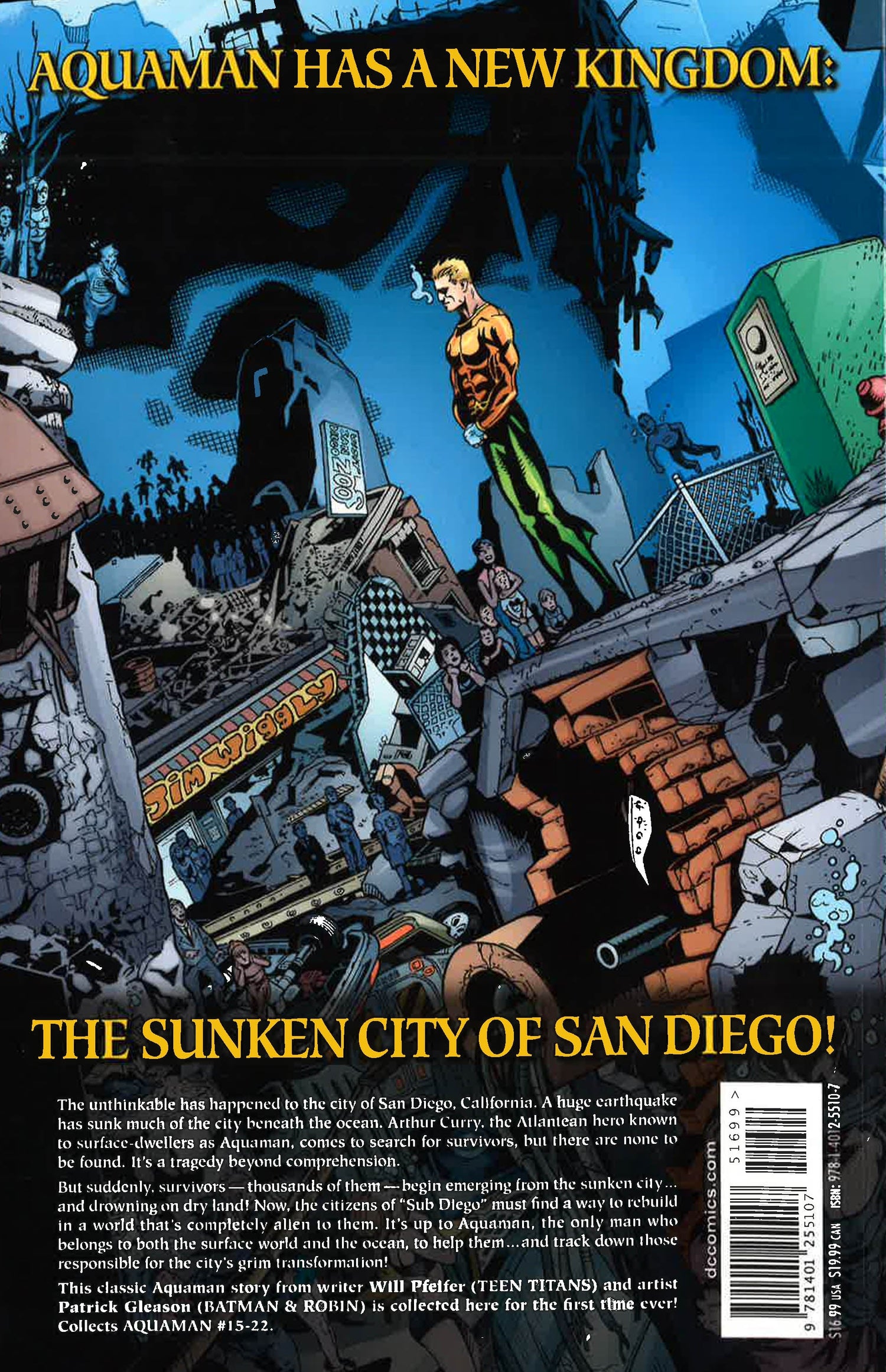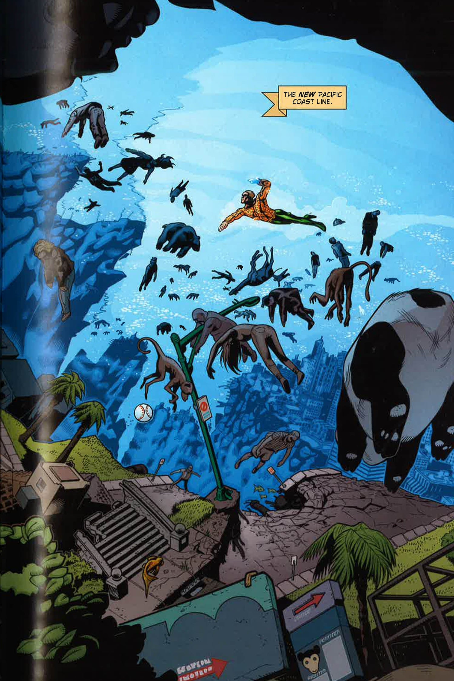 The unthinkable has happened to the city of San Diego, California: a huge earthquake has sank much of the city beneath the ocean. Arthur Curry, the Atlantean hero known to surface-dwellers as Aquaman, comes to search for survivors, but there are none to be found. It?s a tragedy beyond comprehension.But suddenly, survivors begin emerging from the sunken city...and drowning on dry land! There are survivors, hundreds or thousands of them, but they?ve been changed, robbed of their ability to breathe air. Now, the citizens ?Sub Diego? must find a way to rebuild in a world that?s completely alien to them. It?s up to Aquaman, the only man who belongs to both the surface world and the ocean to help them? and track down those responsible for the city?s grim transformation!