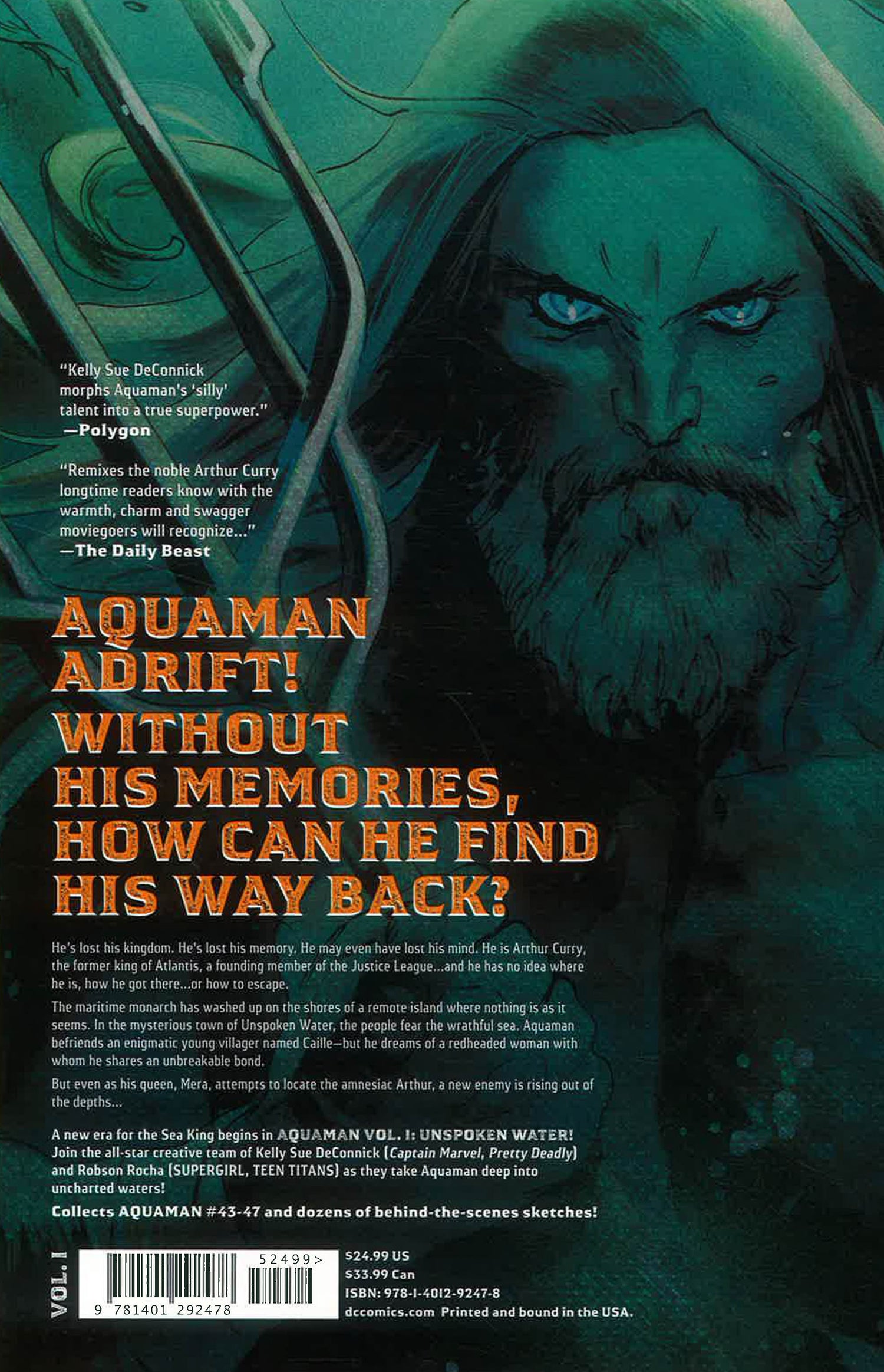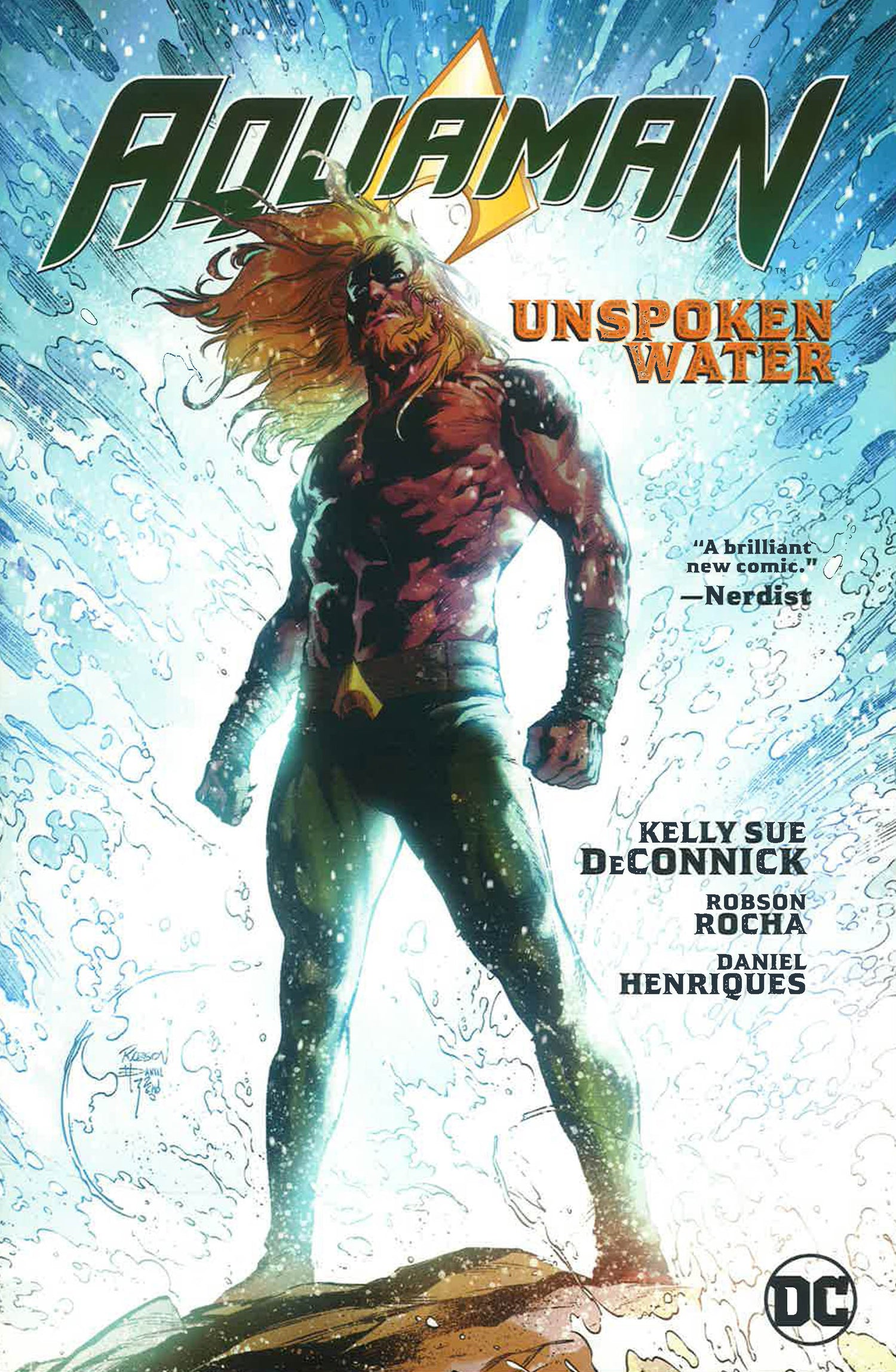A new era for the Sea King begins in Aquaman Vol. 1: Unspoken Water! Join the all-star creative team of Kelly Sue DeConnick (Captain Marvel, Pretty Deadly) and Robson Rocha (Supergirl, Teen Titans) as they take Aquaman deep into uncharted waters!