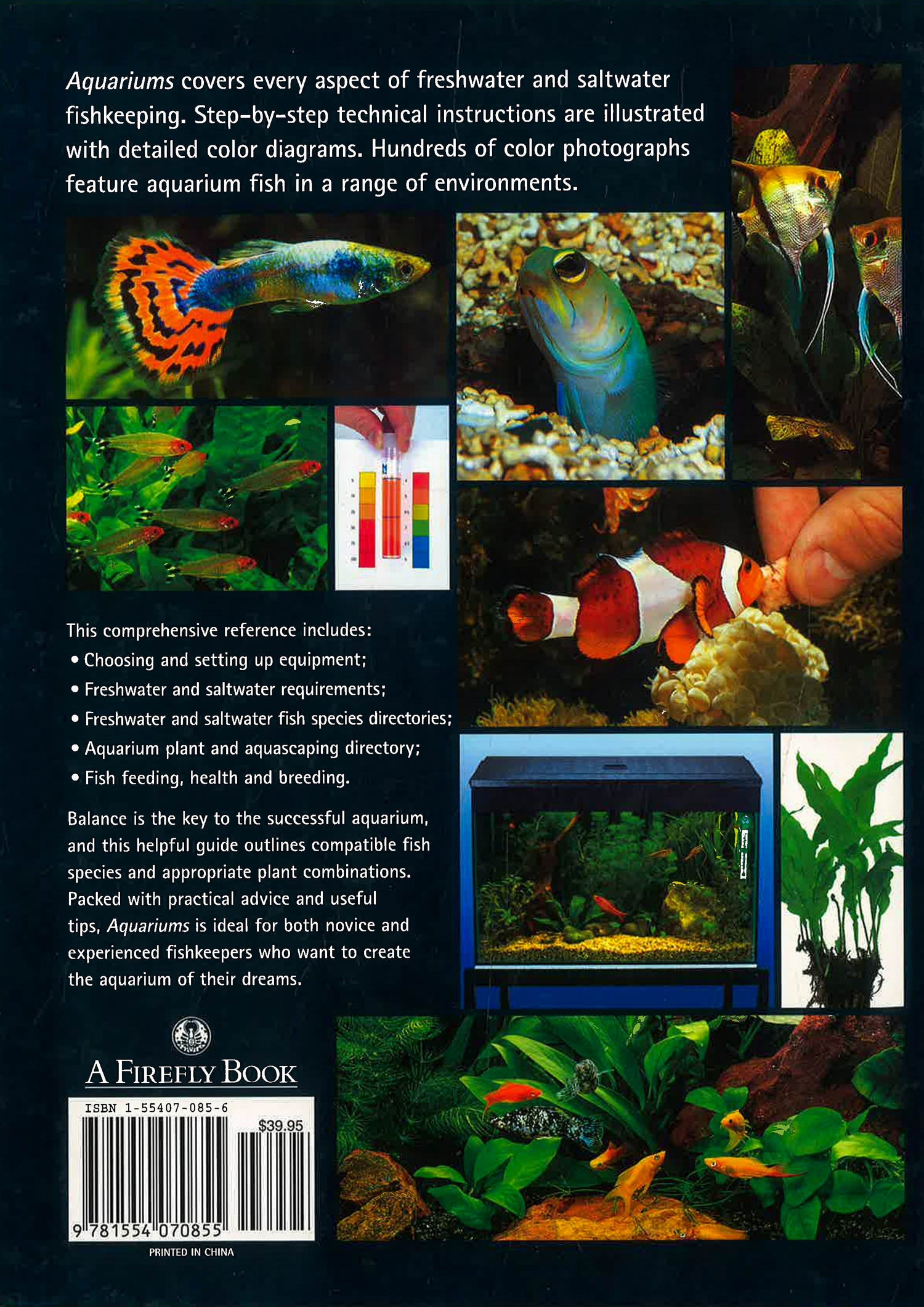Aquariums is a big book that covers every aspect a fishkeeper needs to know. Step-by-step technical instructions are illustrated with hundreds of color diagrams as well as hundreds of color photographs of fish in their natural habitats.
