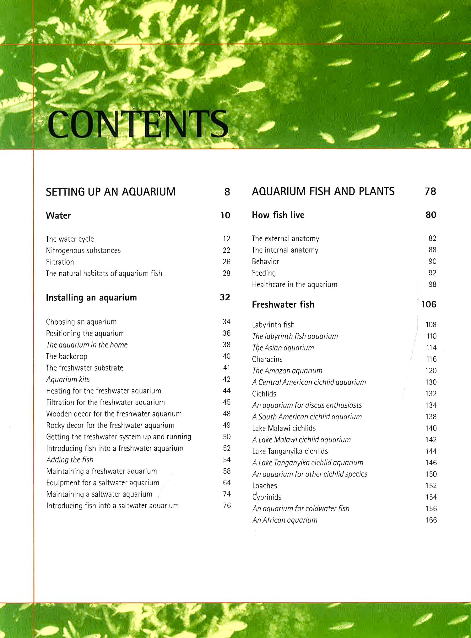 The book features: Choosing equipment Preparing the water and setting up the aquarium Saltwater and freshwater requirements Types of fish and their families Freshwater fish directory Saltwater fish directory Fish reproduction Plants for the aquarium.