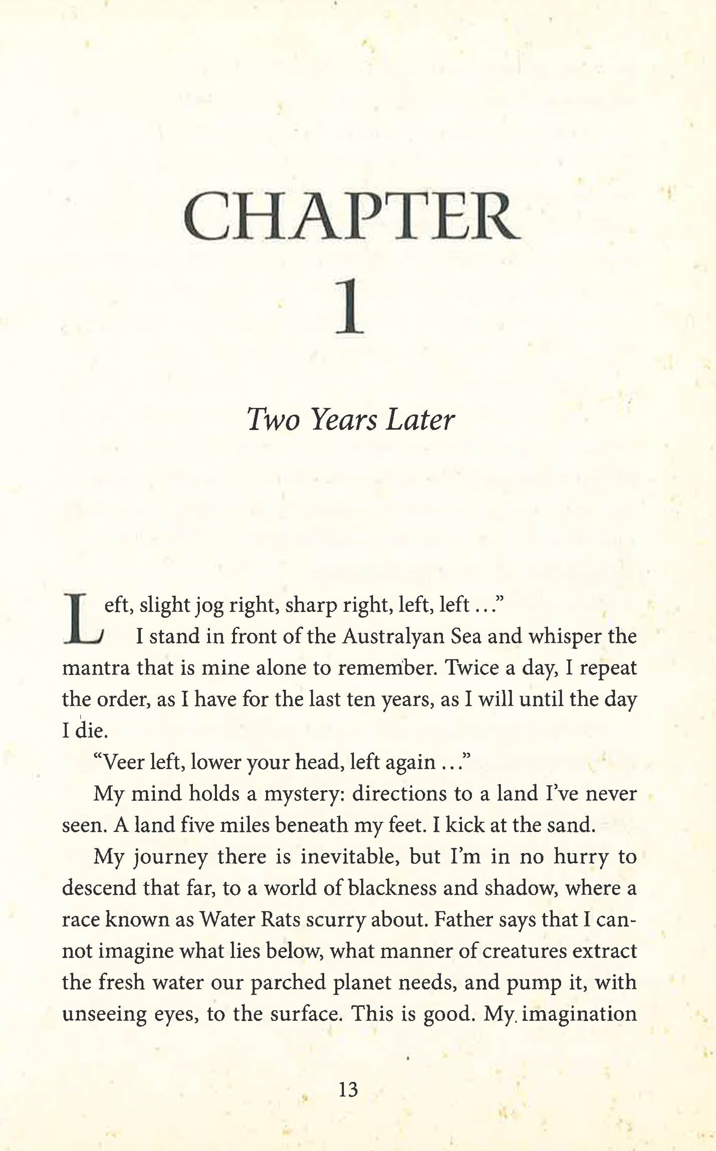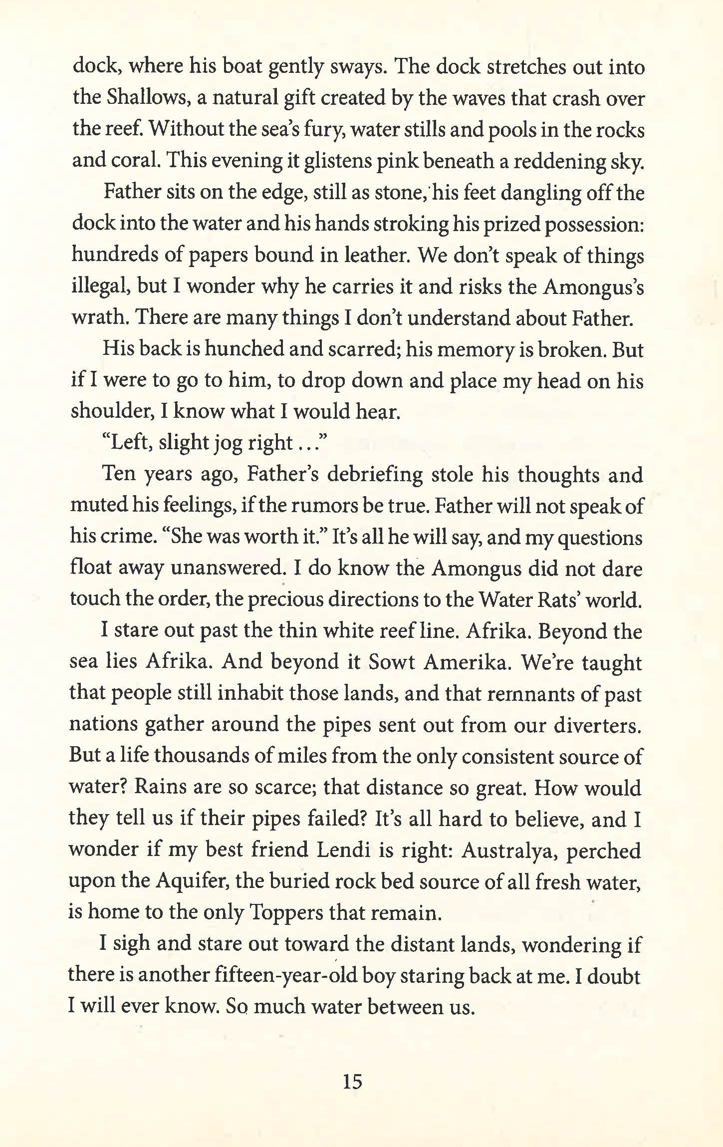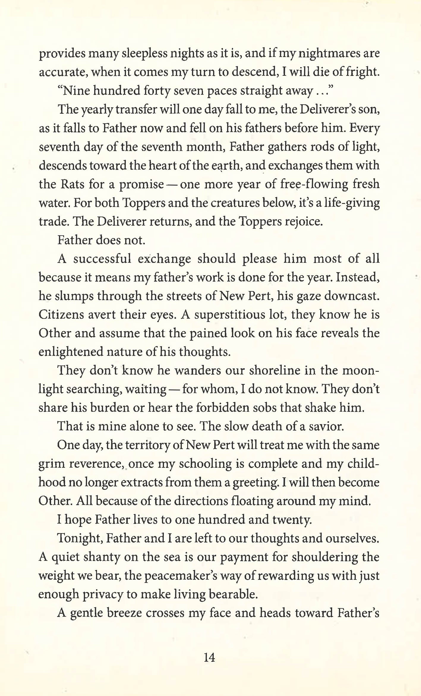 In the year 2250, water is scarce, and those who control it control everything. Sixteen-year-old Luca has struggled with this truth, and what it means, his entire life. As the son of the Deliverer, he will one day have to descend to the underground Aquifer each year and negotiate with the reportedly ratlike miners who harvest the world's fresh water. But he has learned the true control rests with the Council aboveground, a group that has people following without hesitation, and which has forbidden all emotion and art in the name of keeping the peace. And this Council has broken his father's spirit, while also forcing Luca to hide every feeling that rules his heart. But when Luca's father goes missing, everything shifts. Luca is forced underground, and discovers secrets, lies, and mysteries that cause him to reevaluate who he is and the world he serves. Together with his friends and a very alluring girl, Luca seeks to free his people and the Rats from the Council's control. But Luca's mission is not without struggle and loss, as his desire to uncover the truth could have greater consequences than he ever imagined.