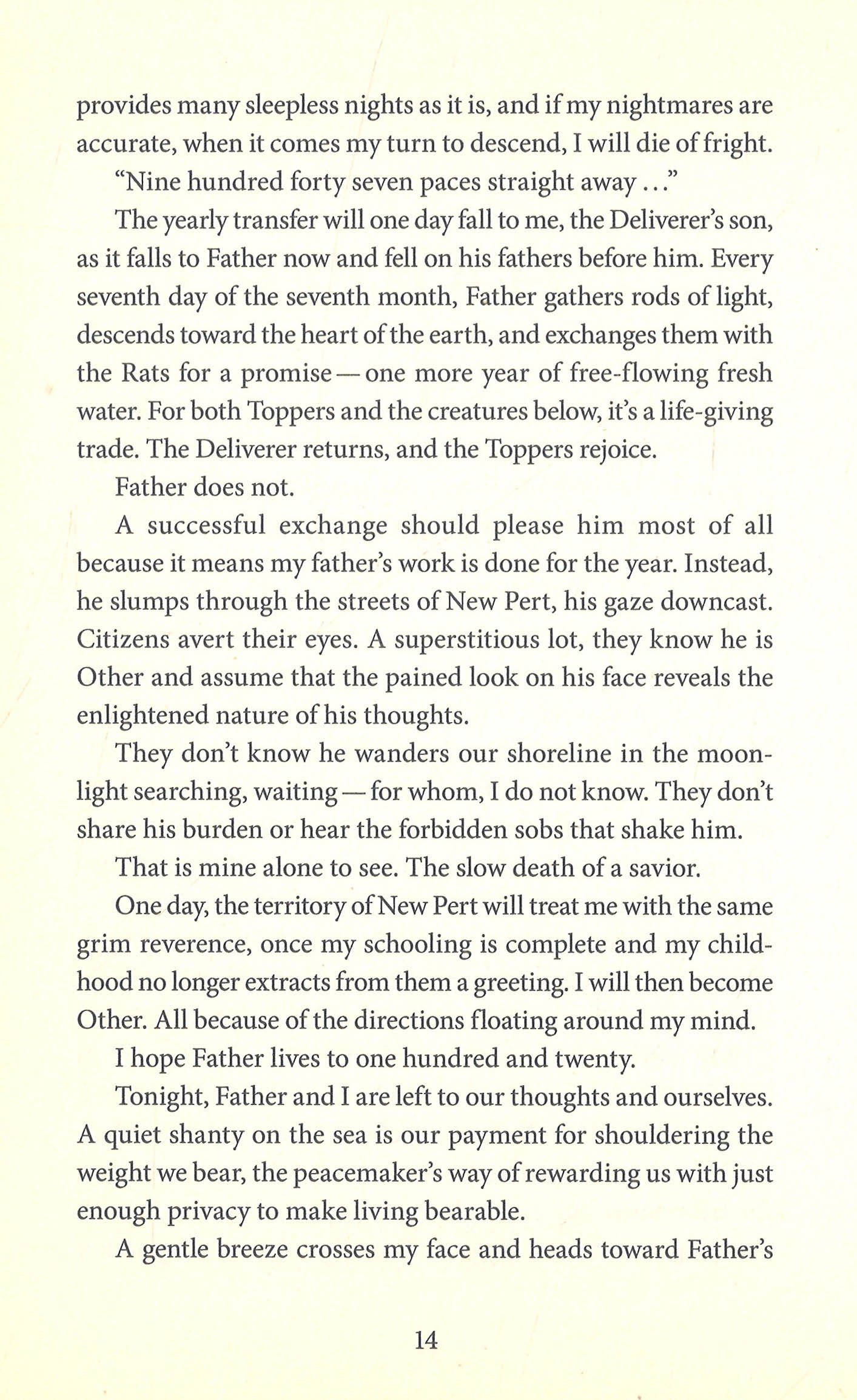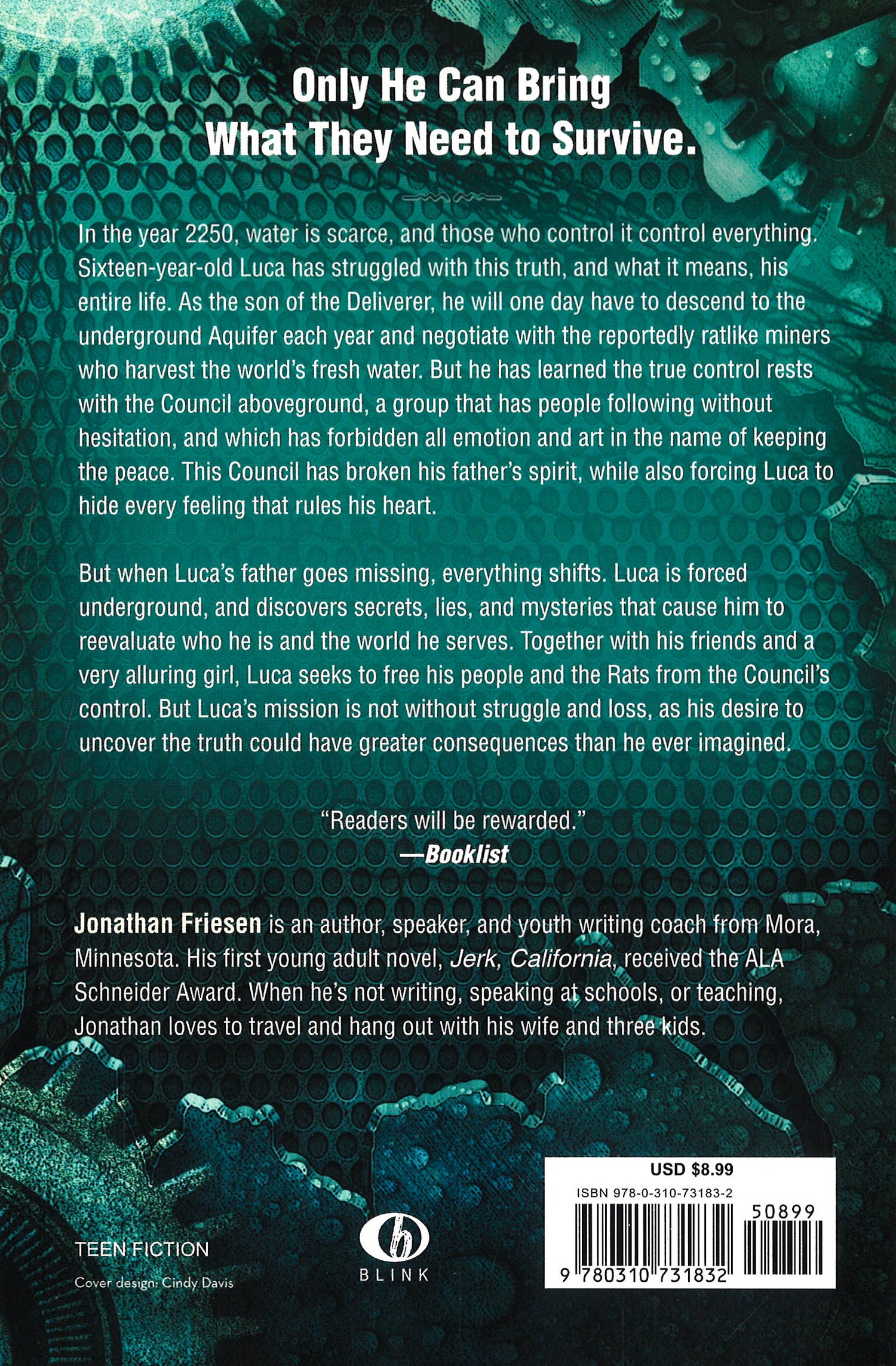 Only He Can Bring What They Need to Survive. In the year 2250, water is scarce, and those who control it control everything. Sixteen-year-old Luca has struggled with this truth, and what it means, his entire life. As the son of the Deliverer, he will one day have to descend to the underground Aquifer each year and negotiate with the reportedly ratlike miners who harvest the world's fresh water. But he has learned the true control rests with the Council aboveground, a group that has people following without hesitation, and which has forbidden all emotion and art in the name of keeping the peace. And this Council has broken his father's spirit, while also forcing Luca to hide every feeling that rules his heart. But when Luca's father goes missing, everything shifts. Luca is forced underground, and discovers secrets, lies, and mysteries that cause him to reevaluate who he is and the world he serves. Together with his friends and a very alluring girl, Luca seeks to free his people and the Rats from the Council's control. But Luca's mission is not without struggle and loss, as his desire to uncover the truth could have greater consequences than he ever imagined.