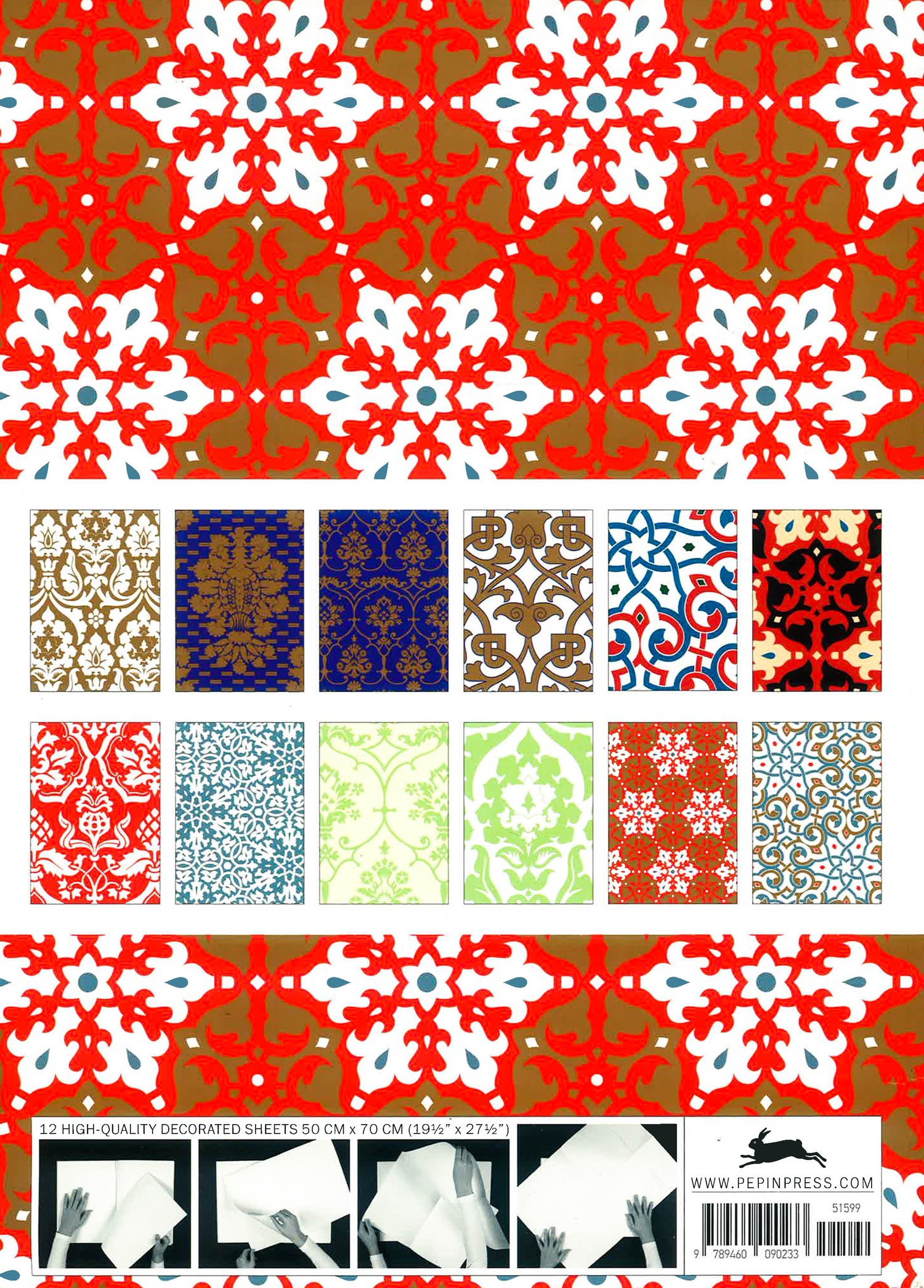 PEPIN gift & creative paper books all contain 4 pages of introduction and 12 large sheets of very high-quality wrapping paper. These sheets can easily be removed from the books by tearing them along a perforated line. The wrapping papers are folded to fit into the book; when removed and opened they measure 50 cm x 70 cm (191/2 inch x 271/2 inch; a standard size for gift wrapping papers). Depending on the theme, we have selected a suitable light-weight paper quality. For example, papers with designs in gold, silver or bronze are printed on silky art paper on which the inks show to their best advantage. Designs with an antique or hand-made feel are printed on high-quality creamy paper. PEPIN papers make your gift package look very special. In addition, our papers are suitable for scrap booking and all sorts of craft projects. Each volume contains 12 different, exceptional designs.