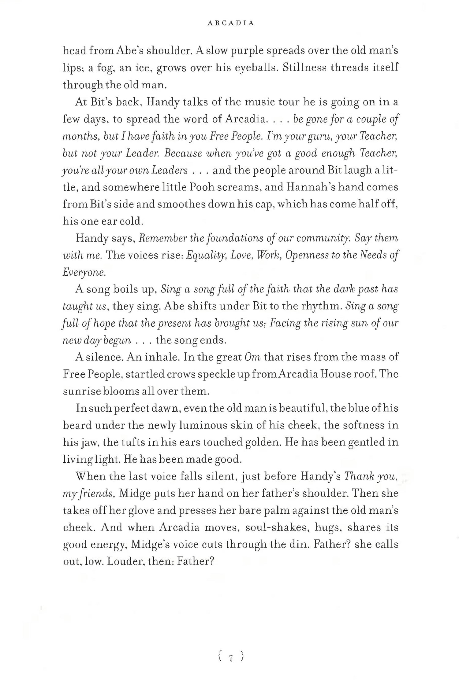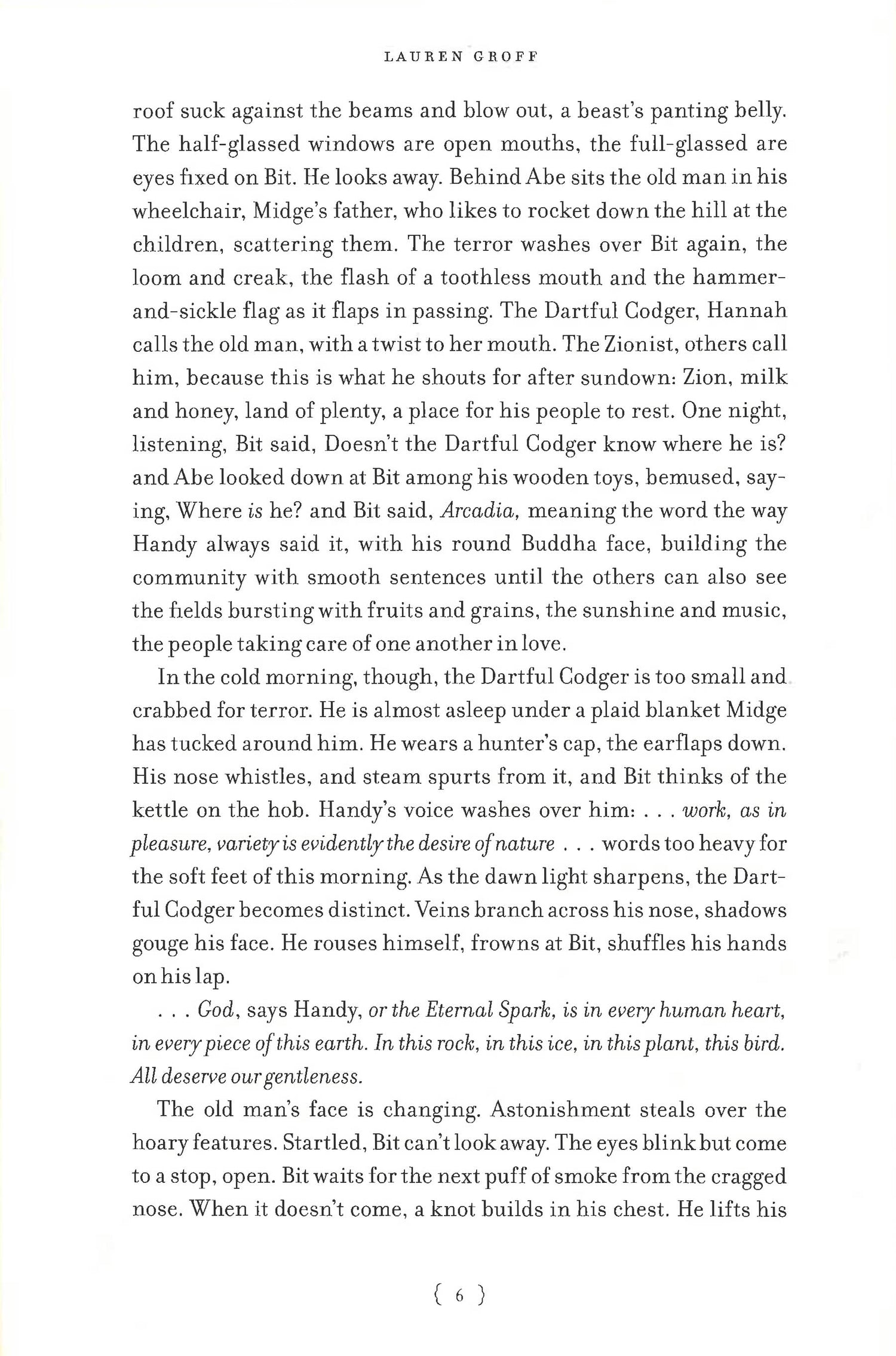 From the bestselling author of The Monsters of Templeton comes a lyrical and gripping story of a great American dream. In the fields of western New York State in the 1970s, a few dozen idealists set out to live off the land, founding what would become a commune centered on the grounds of a decaying mansion called Arcadia House. Arcadia follows this romantic, rollicking, and tragic utopian dream from its hopeful start through its heyday and after. Arcadia's inhabitants include Handy, a musician and the group's charismatic leader; Astrid, a midwife; Abe, a master carpenter; Hannah, a baker and historian; and Abe and Hannah's only child, the book's protagonist, Bit, who is born soon after the commune is created. While Arcadia rises and falls, Bit, too, ages and changes. If he remains in love with the peaceful agrarian life in Arcadia and deeply attached to its residents - including Handy and Astrid's lithe and deeply troubled daughter, Helle - how can Bit become his own man? How will he make his way through life and the world outside of Arcadia where he must eventually live? With Arcadia, her first novel since her lauded debut, The Monsters of Templeton, Lauren Groff establishes herself not only as one of the most gifted young fiction writers at work today but also as one of our most accomplished literary artists.