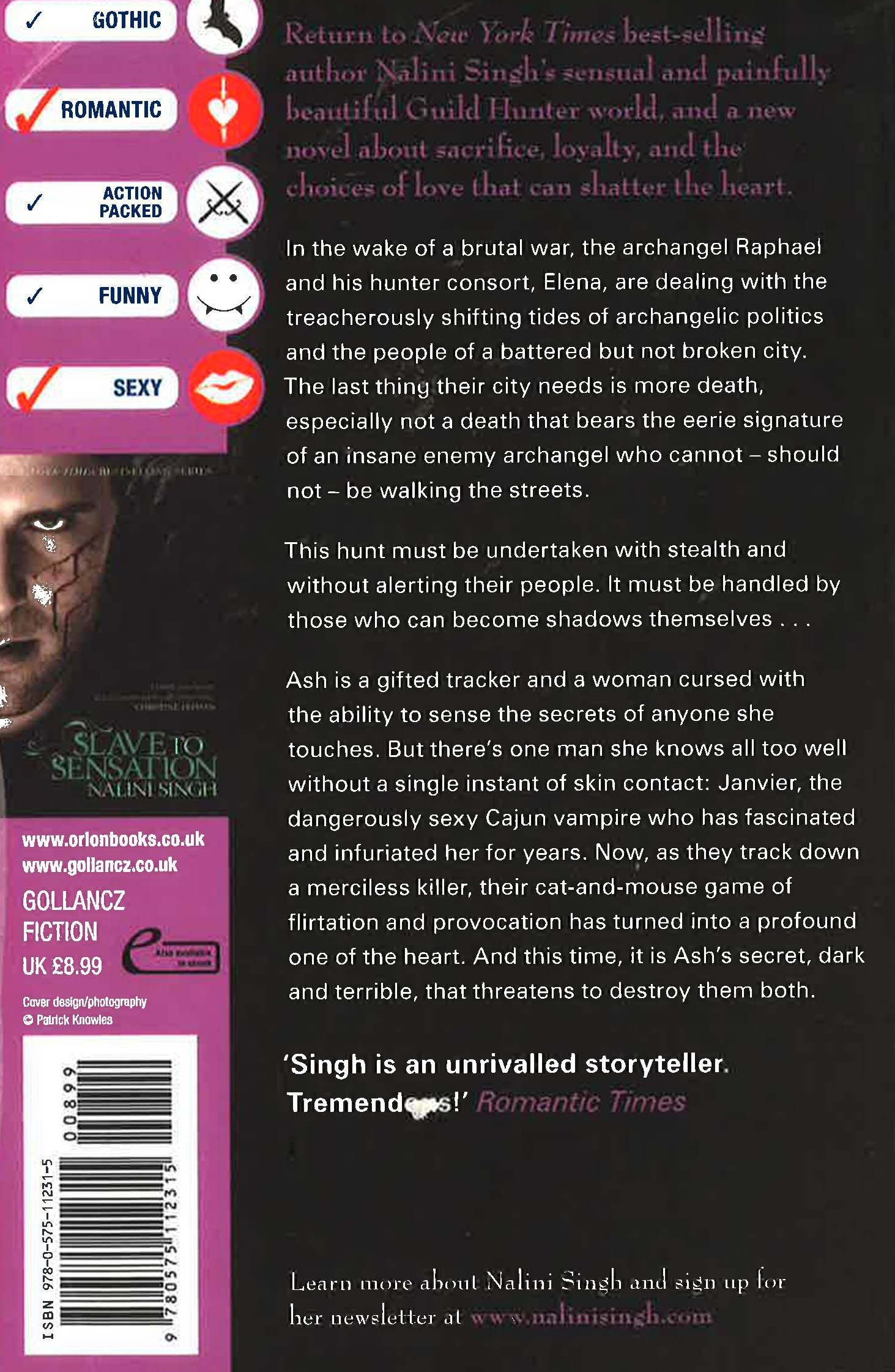 Return to the sensual and painfully beautiful Guild Hunter world, with a new novel about sacrifice, loyalty and the choices of love that can shatter the heart.In the wake of a brutal war, the archangel Raphael and his hunter consort Elena are dealing with the treacherously shifting tides of archangelic politics and the people of a battered but not broken city. The last thing their city needs is more death, especially not a death that bears the eerie signature of an insane enemy archangel who cannot - should not - be walking the streets. This hunt must be undertaken with stealth and without alerting their people. It must be handled by those who can become shadows themselves ...Ash is a gifted tracker and a woman cursed with the ability to sense the secrets of anyone she touches. But there's one man she knows all too well without a single instant of skin contact: Janvier, the dangerously sexy Cajun vampire who has fascinated and infuriated her for years. Now, as they track down a merciless killer, their cat-and-mouse game of flirtation and provocation has turned into a profound one of the heart. And this time, it is Ash's secret, dark and terrible, that threatens to destroy them both.Nalini Singh, the NEW YORK TIMES bestselling 'alpha author of paranormal romance' (BOOKLIST), returns to her stunning world, as it braces itself for destruction.