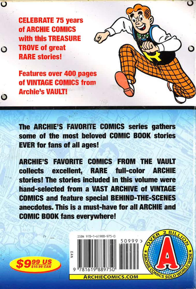 Celebrate 75 years of Archie Comics with this treasure trove of great rare stories! Features over 400 pages of vintage comics from Archie s vault! The Archies Favourite Comics series gathers some of the most beloved COMIC BOOK stories ever for fans of all ages! Archies Favourite Comics from the vaults collects excellent, RARE full-color Archie stories! The stories included in this volume were hand-selected from a vast archive of vintage comics and feature special behind-the-scenes anecdotes. This is a must-have for all Archie and comic book fans everywhere! *This book may have a minor shelfware.