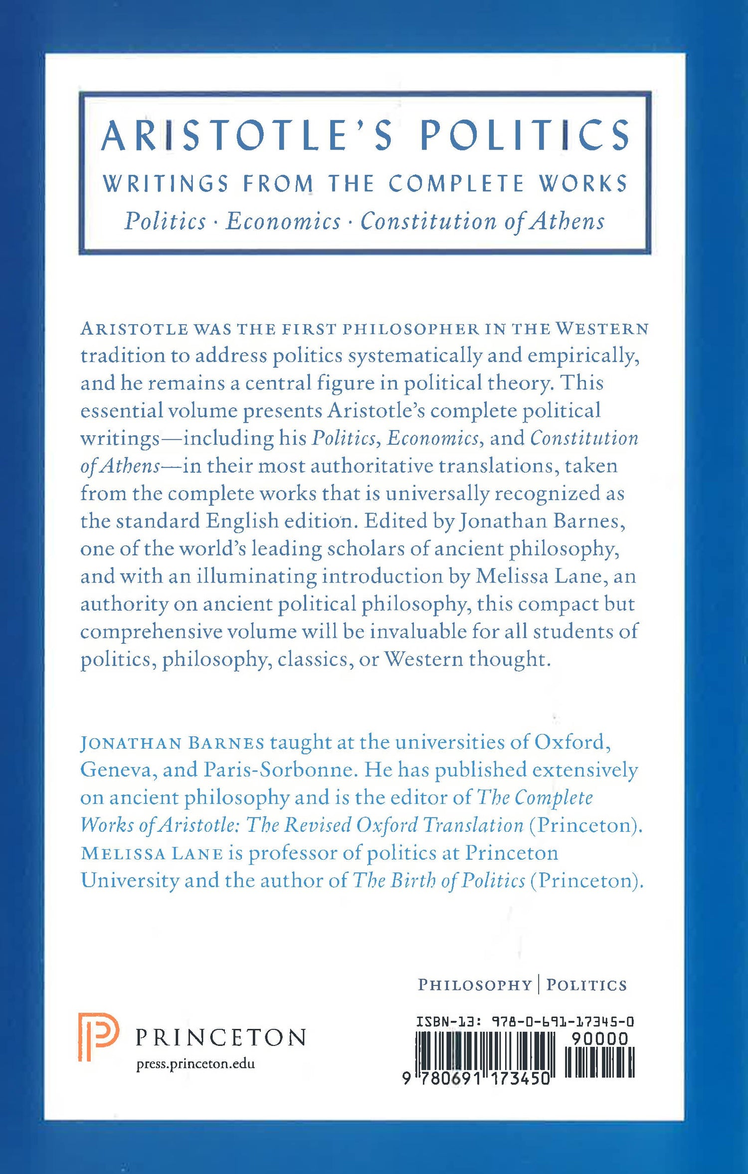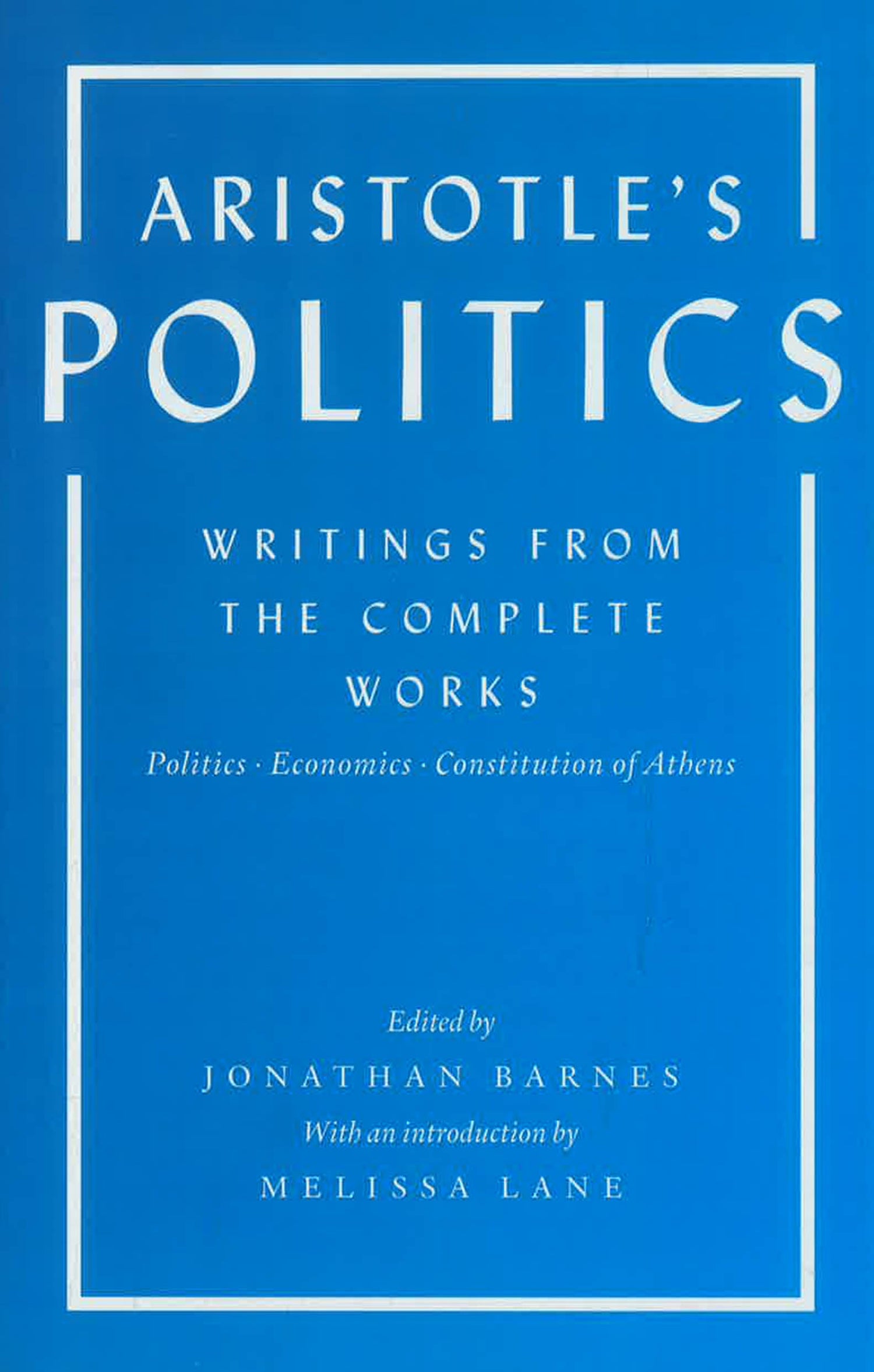 Aristotle was the first philosopher in the Western tradition to address politics systematically and empirically, and he remains a central figure in political theory. This essential volume presents Aristotle's complete political writings--including his Politics, Economics, and Constitution of Athens--in their most authoritative translations, taken from the complete works that is universally recognized as the standard English edition. Edited by Jonathan Barnes, one of the world's leading scholars of ancient philosophy, and with an illuminating introduction by Melissa Lane, an authority on ancient political philosophy, this compact but comprehensive volume will be invaluable for all students of politics, philosophy, classics, or Western thought.