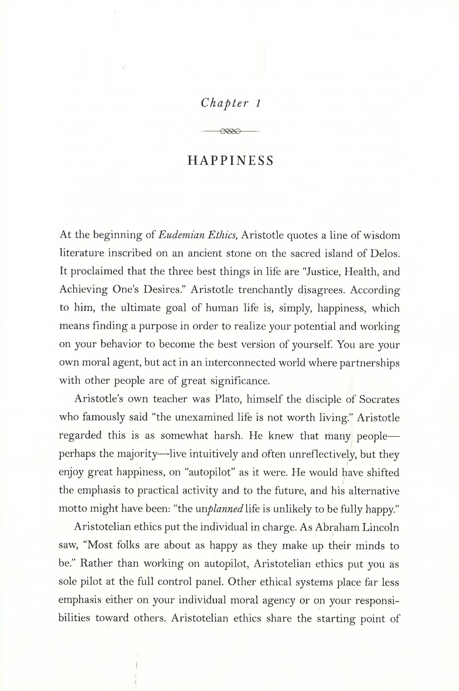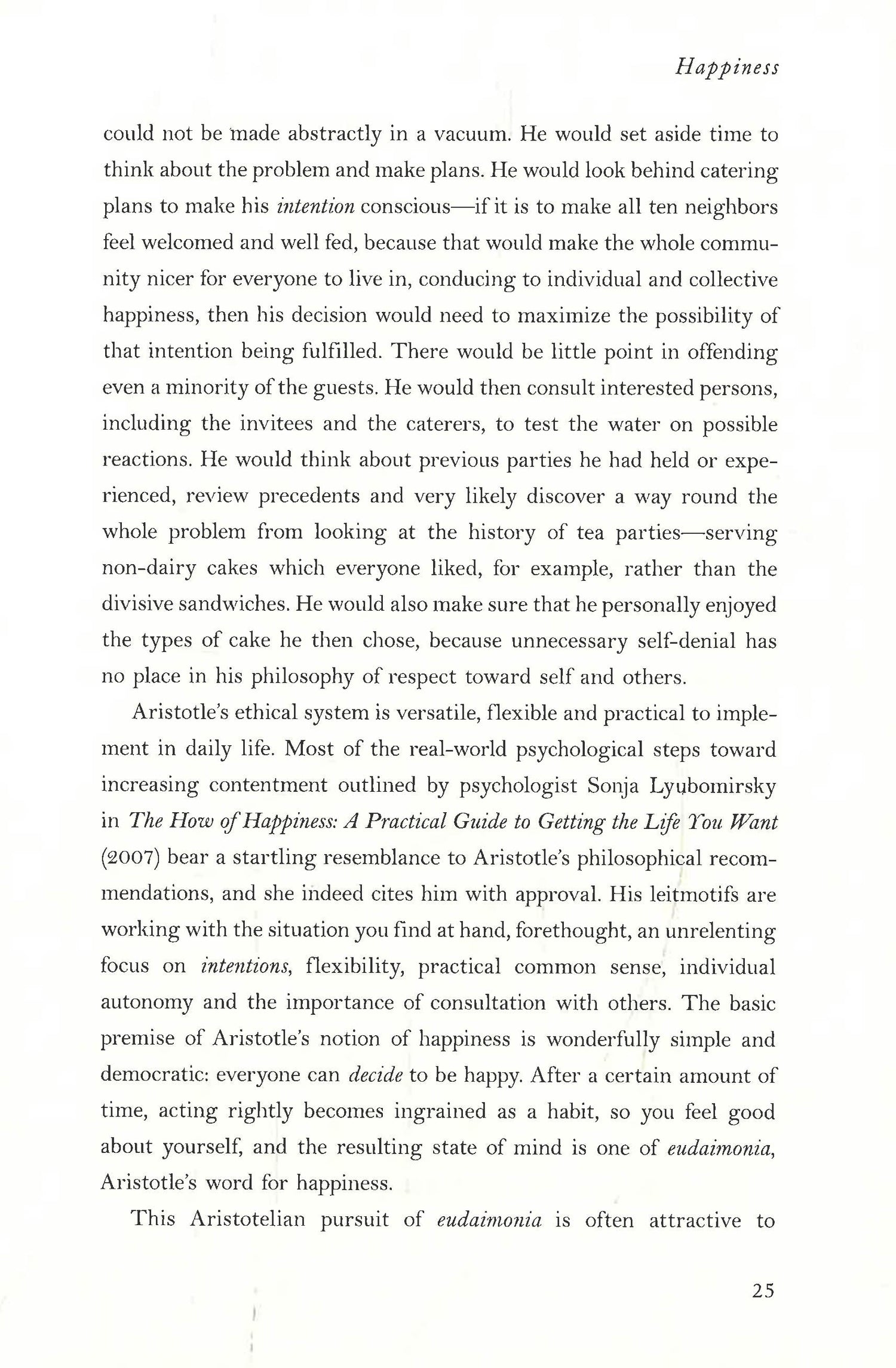 Aristotle was the first philosopher to inquire into subjective happiness, and he understood its essence better and more clearly than anyone since. According to Aristotle, happiness is not about well-being, but instead a lasting state of contentment, which should be the ultimate goal of human life. We become happy through finding a purpose, realizing our potential, and modifying our behavior to become the best version of ourselves. With these objectives in mind, Aristotle developed a humane program for becoming a happy person, which has stood the test of time, comprising much of what today we associate with the good life: meaning, creativity, and positivity. Most importantly, Aristotle understood happiness as available to the vast majority us, but only, crucially, if we decide to apply ourselves to its creation--and he led by example. As Hall writes, "If you believe that the goal of human life is to maximize happiness, then you are a budding Aristotelian."