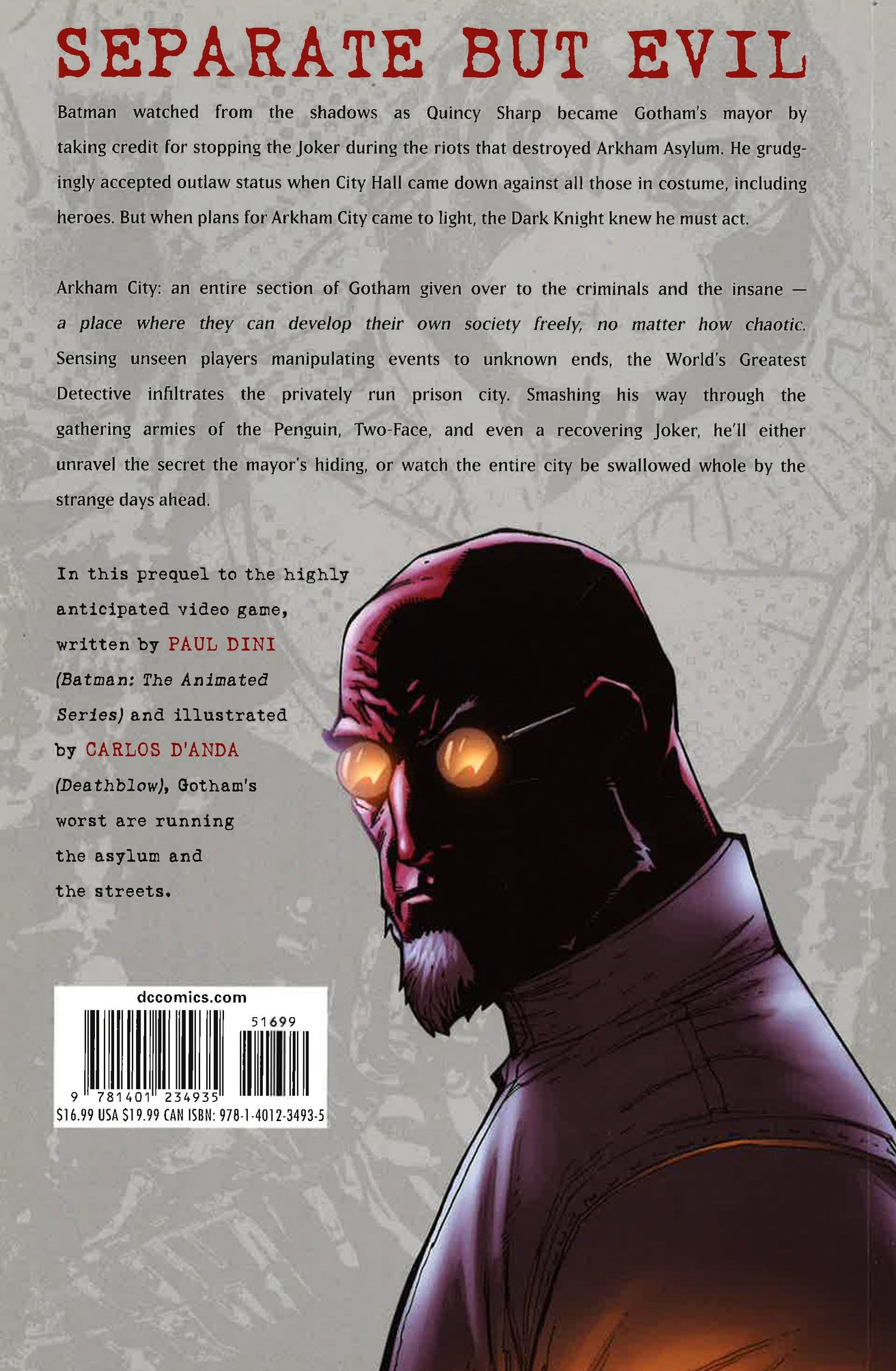 An all new epic bridging the gap between the hit game BATMAN: ARKHAM ASYLUM and its exciting, upcoming sequel BATMAN: ARKHAM CITY. Paul Dini (HARLEY QUINN, BATMAN: STREETS OF GOTHAM) is the game's writer and now tells this essential story that both gamers and Batman fans will want to read. Artist CARLOS D'ANDA provided visual concepts for the game and now brings his insider's expertise to this dark thriller.