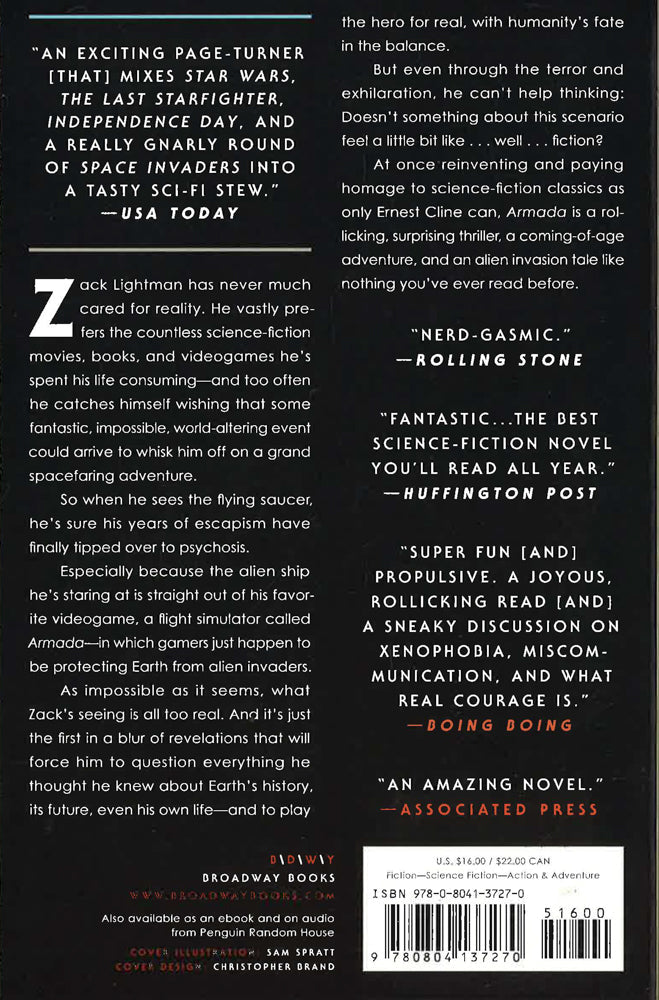 Zack Lightman has spent his life dreaming. Dreaming that the real world could be a little more like the countless science-fiction books, movies, and videogames he's spent his life consuming. Dreaming that one day, some fantastic, world-altering event will shatter the monotony of his humdrum existence and whisk him off on some grand space-faring adventure. But hey, there's nothing wrong with a little escapism, right? After all, Zack tells himself, he knows the difference between fantasy and reality. He knows that here in the real world, aimless teenage gamers with anger issues don't get chosen to save the universe. And then he sees the flying saucer. Even stranger, the alien ship he's staring at is straight out of the videogame he plays every night, a hugely popular online flight simulator called Armada-- in which gamers just happen to be protecting the earth from alien invaders. No, Zack hasn't lost his mind. As impossible as it seems, what he's seeing is all too real. And his skills--as well as those of millions of gamers across the world--are going to be needed to save the earth from what's about to befall it. It's Zack's chance, at last, to play the hero. But even through the terror and exhilaration, he can't help thinking back to all those science-fiction stories he grew up with, and wondering: Doesn't something about this scenario seem a little...familiar? At once gleefully embracing and brilliantly subverting science-fiction conventions as only Ernest Cline could, Armada is a rollicking, surprising thriller, a classic coming of age adventure, and an alien invasion tale like nothing you've ever read before--one whose every page is infused with the pop-culture savvy that has helped make Ready Player One a phenomenon.