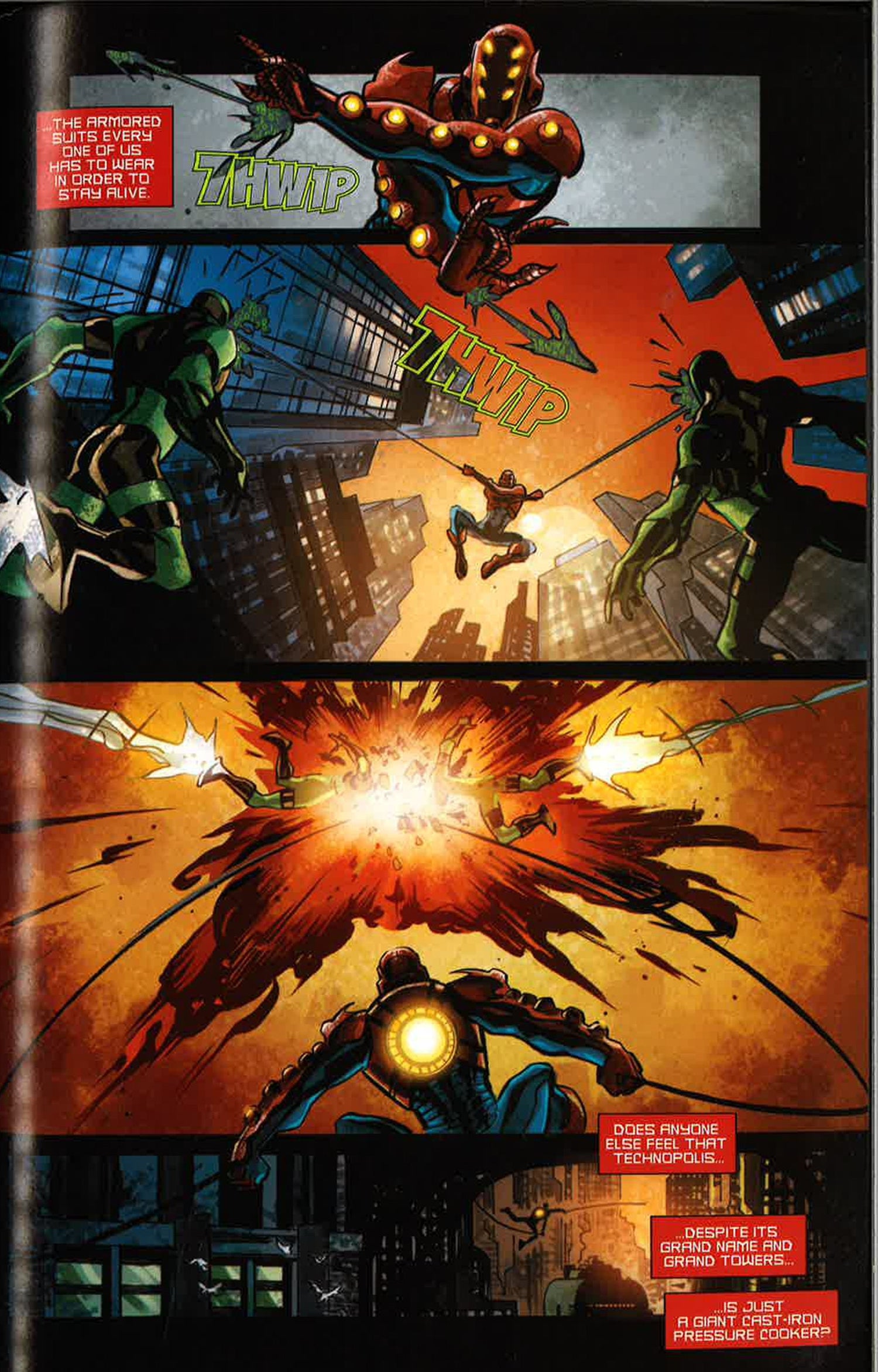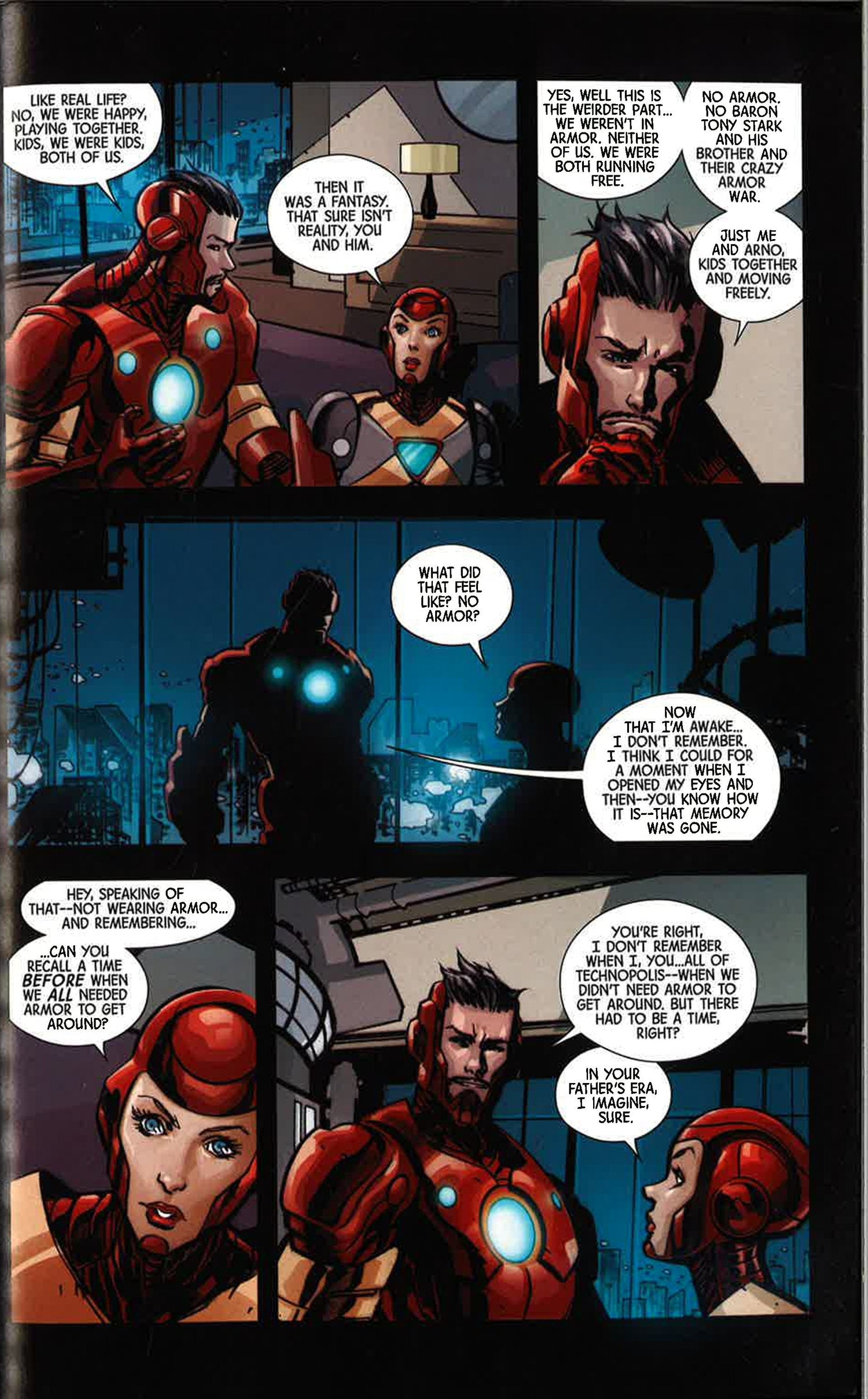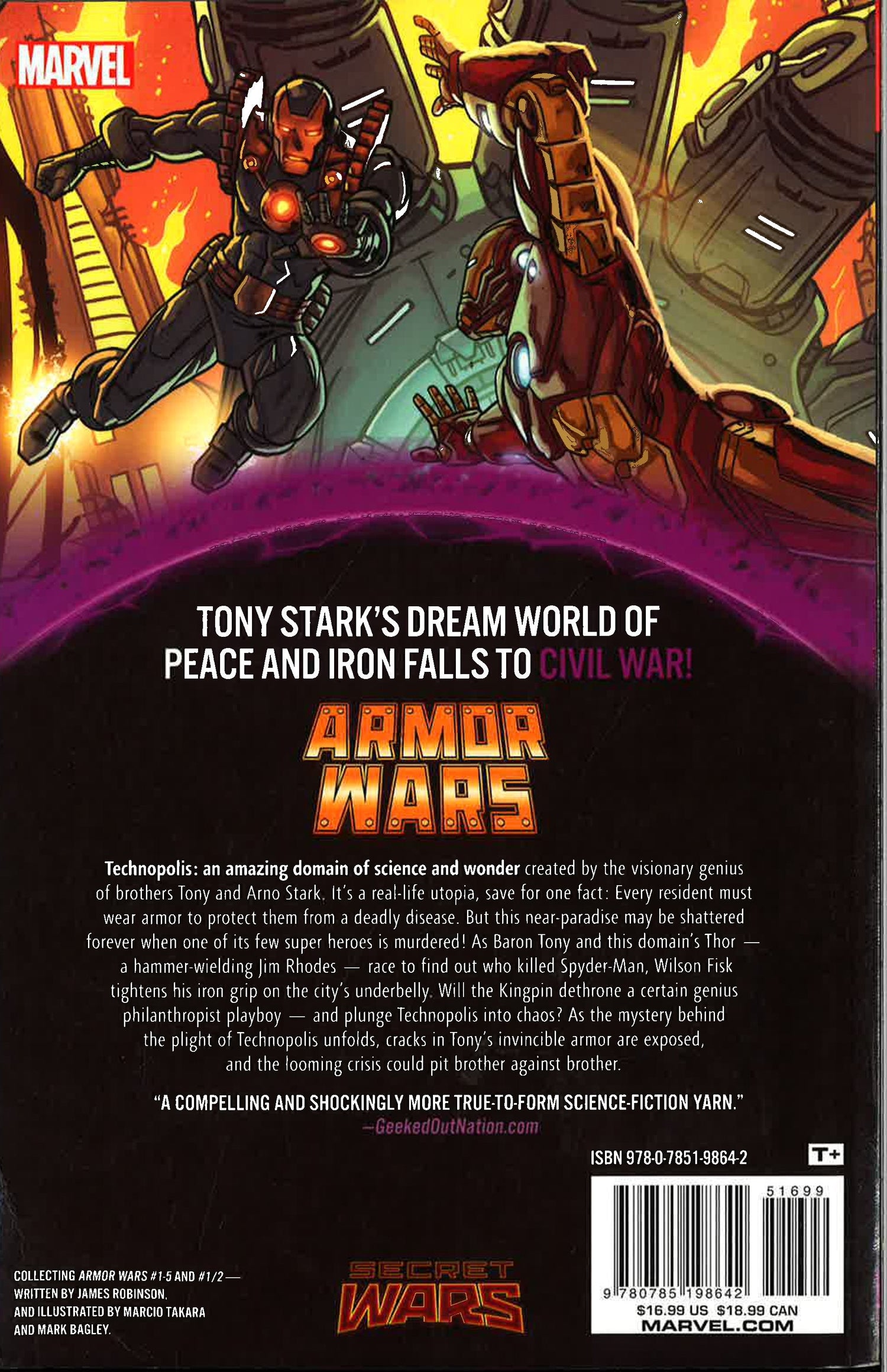 A SHADOW FALLS OVER AN ARMORED UTOPIA. TECHNOPOLIS: Amazing Domain of science and wonder created by rival genius brothers TONY AND ARNO STARK. A utopia except...a unique disease forces EVERYONE to wear armor to live and breathe. In this armored land a hero is murdered and the killer's identity a mystery Baron Tony Stark must solve. But in doing so, will Technopolis be forced into a civil war? COLLECTING: ARMOR WARS