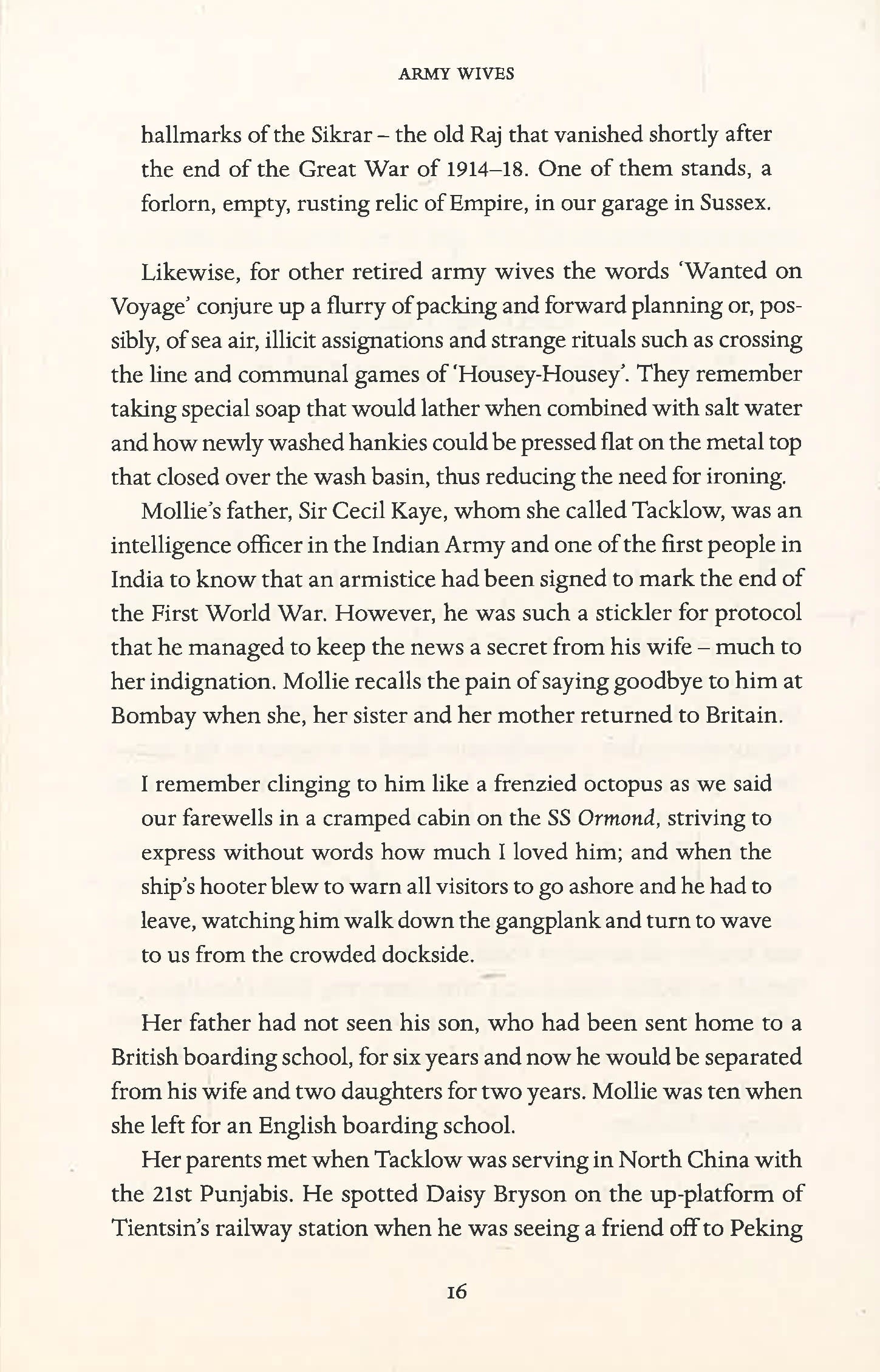 We meet the wives who made the arduous journey to the Crimean war and witnessed battle at close quarters. We hear the story of life in the Raj and the often terrifying experiences of the women who lived through its dying days. We explore the pressures of being a modern army wife - whether living in barracks or trying to maintain a normal home life outside 'the patch'.