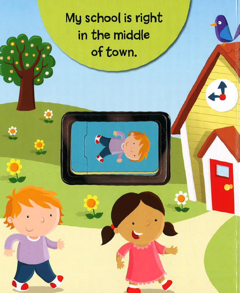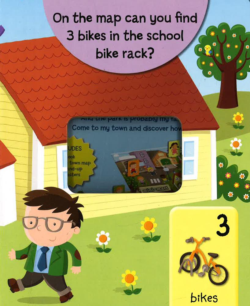 Contains a boardbook that tells of adventure in a city where children are invited to get to know various places like school, bakery, park, etc. On the right side of the book is a 7 page board (very thick quality board material) which can be opened into a city / city playmap (playmap size: 51 x 63 Cm) where the child can play 6 stand-up characters in the form of boy & girl characters on top of his playmap while making his own story. While reading the story from his book, children are also asked to search and count certain objects in the playmap, such as finding a tractor, finding 2 cherry pieces in the playmap, and so on.