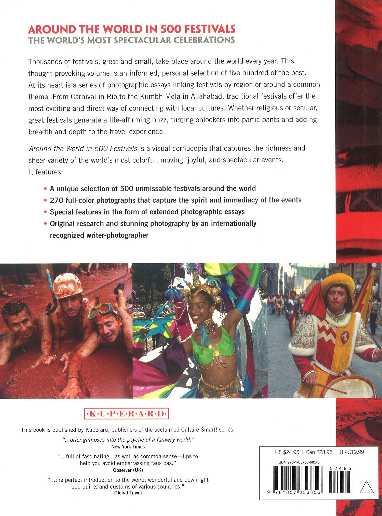 Around the World in 500 Festivals is a rare book that will fascinate and inspire. A large-format, beautifully illustrated coffee-table volume, it is a photographic exploration of the richness and variety of the world's most colourful, moving, joyful, and spectacular celebrations. Thousands of festivals, great and small, take place around the world every year. he book contains- unique selection of 500 unmissable festivals around the world ore than 200 full-colour photographs that capture the spirit and immediacy f the events pecial features in the form of extended photographic essays riginal research and stunning photography by an internationally recognized riter-photographer round the World in 500 Festivals takes this approach to a different level. It will help eople who want to plan their trip to coincide with a festival. It will also enthrall and inform rmchair travelers everywhere. Elegantly designed and lavishly produced, it is exceptional alue for money and makes a perfect gift for travellers and readers of all ages, ackgrounds, and cultures.