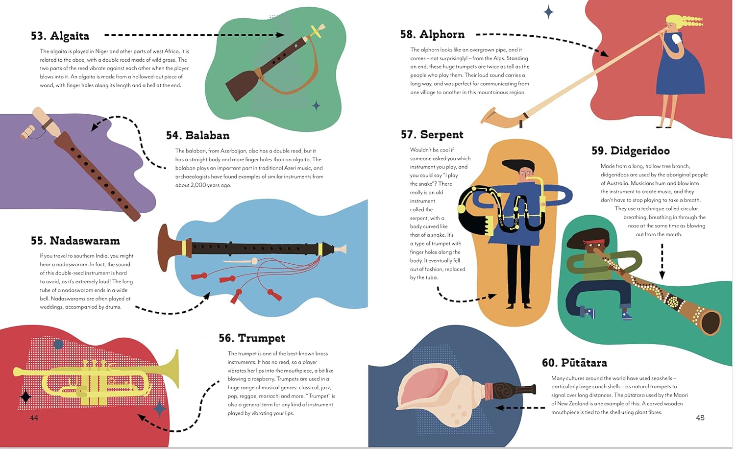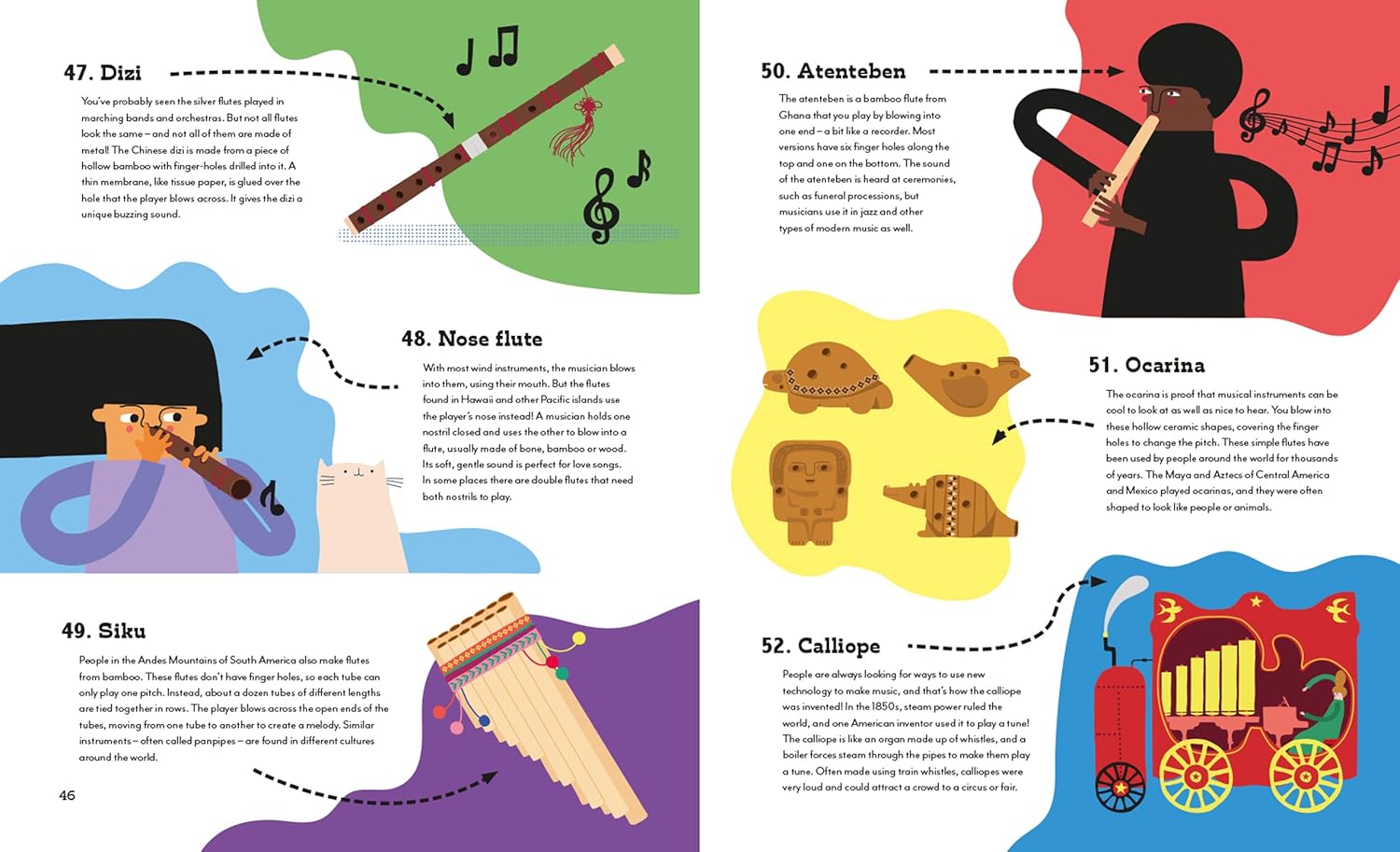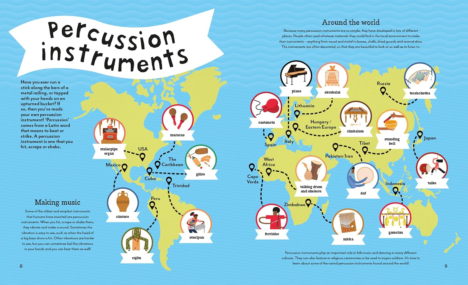 Including a stunning central gatefold that opens out to reveal the family tree of musical instruments, Around the World in 80 Musical Instruments is a visual celebration of the huge variety of instruments played across the world, from those you know to those you almost certainly don't. Discover traditional instruments from various cultures, such as the gamelan and mbira, as well as the creations of modern artists and musicians, such as the Wintergatan Marble Machine and the eerie-sounding Earth harp.