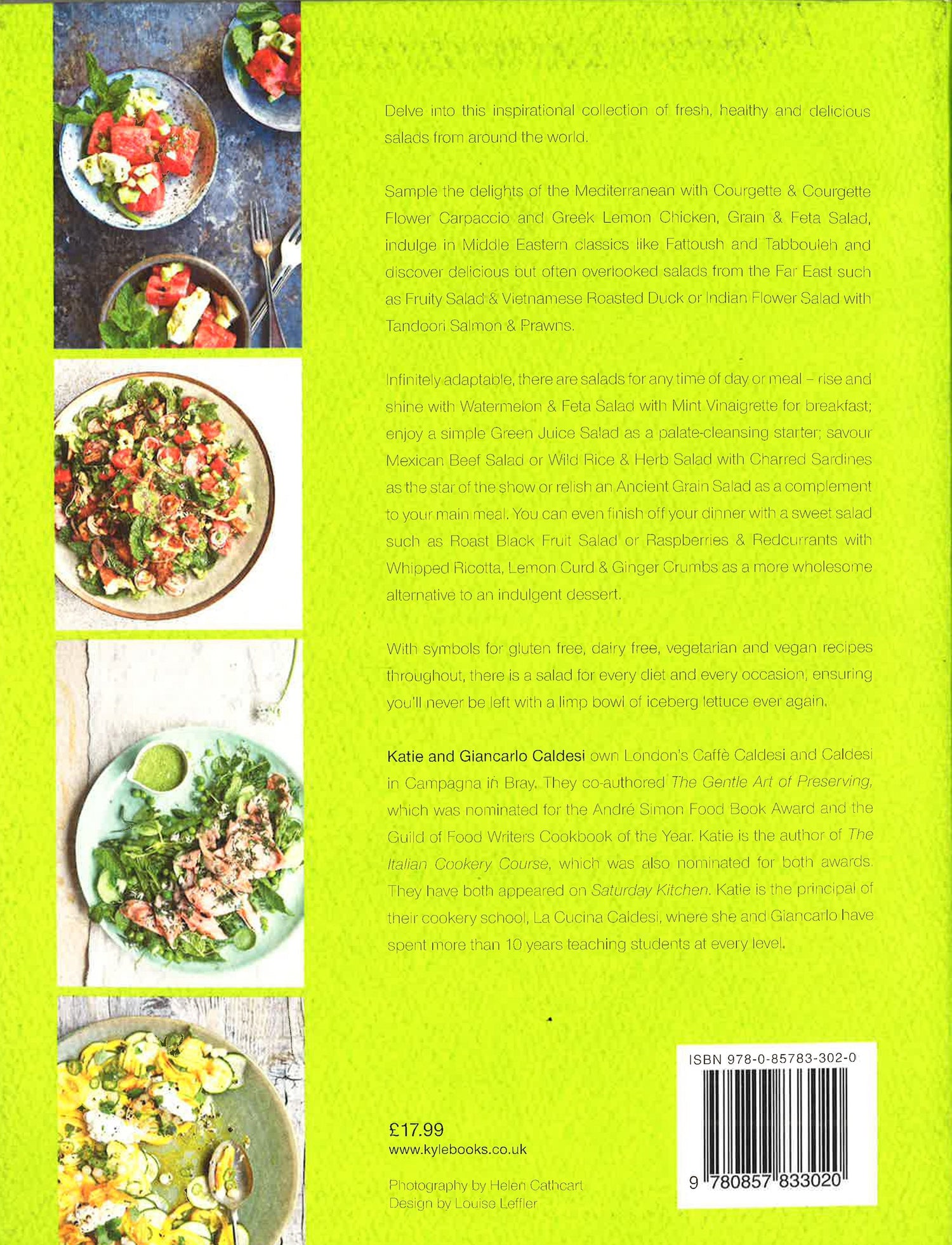 Salads are fresh, healthy and delicious - and infinitely adaptable. Katie and Giancarlo show how salads are perfect for any time of day and occasion - Watermelon, Feta and Mint for a refreshing breakfast, meat, fish and vegetable-based mains for a complete meal plus recipes for starters and side salads where salad plays a supporting role. They even cover sweet salads such as Roast Black Fruit Salad or Raspberries and Redcurrants with Whipped Ricotta for a healthier alternative to an indulgent dessert. Featuring recipes from around the world you can enjoy Vietnamese Roasted Duck with Five-Spice Fruit Salad or a spicy Mexican Beef Salad, sample Mediterranean flavours with Courgette and Courgette Flower Carpaccio and Greek Lemon Chicken or savour Middle Eastern classics such as Fattoush and Tabbouleh. With a selection of essential dressings to compliment any salad this mouthwatering collection of inspirational recipes will ensure you'll never be stuck with a limp leaf of iceberg lettuce again.