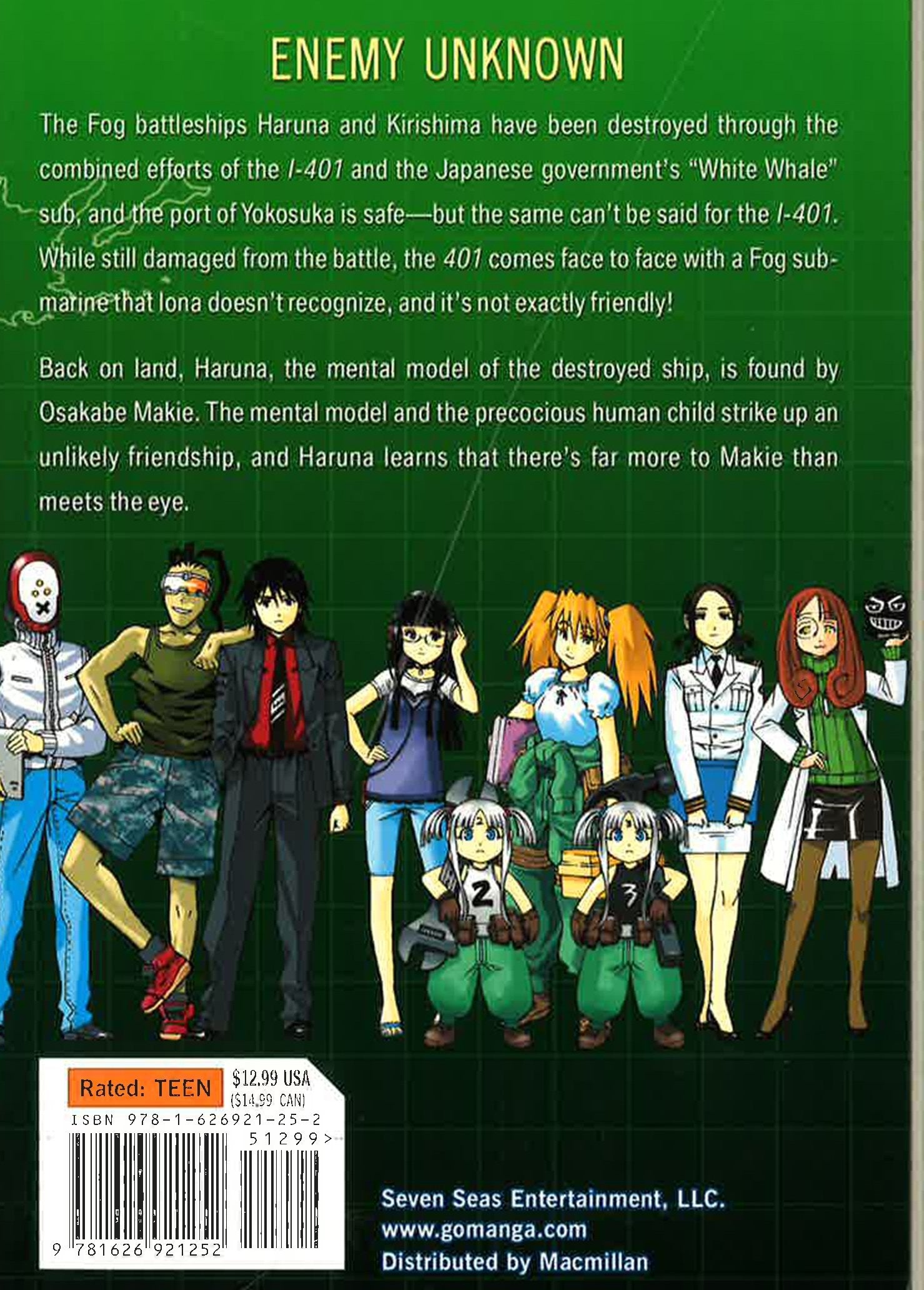 ENEMY UNKNOWN The Fog battleships Haruna and Kirishima have been destroyed through the combined efforts of the I-401 and the Japanese government's "White Whale" sub, and the port of Yokosuka is safe-but the same can't be said for the I-401. While still damaged from the battle, the 401 comes face to face with a Fog submarine that Iona doesn't recognize, and it's not exactly friendly! Back on land, Haruna, the mental model of the destroyed ship, is found by Osakabe Makie. The mental model and the precocious human child strike up an unlikely friendship, and Haruna learns that there's far more to Makie than meets the eye.