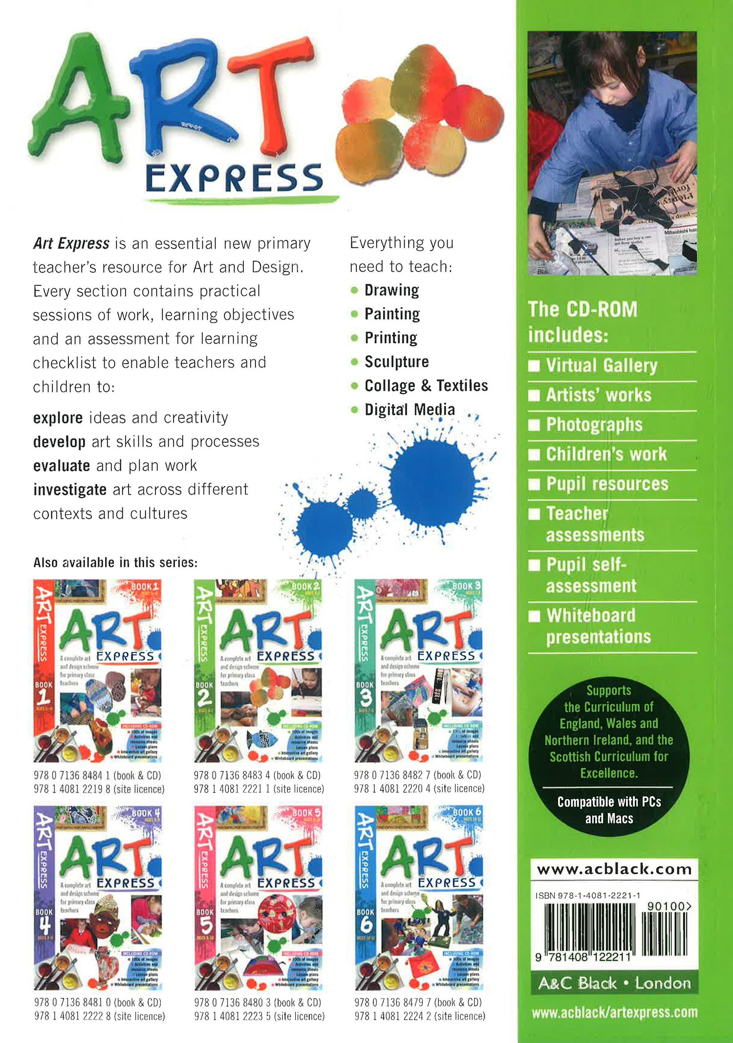 A new and complete Art and Design scheme for Primary Class Teachers. Everything you need to teach drawing, painting, printing, sculpture, collage and textiles and digital media. Every unit contains practical sessions of work, learning objectives, an AFL checklist and ideas for differentiation. Art Express enables teachers and children to: -Explore ideas and creativity -Develop art skills and processes -Evaluate and plan work -investigate art across different cultures The CD comes with a wealth of resources, including an interactive virtual gallery, examples of famous works, stimulus photographs, pupil resources, teacher assessment sheets, whiteboard presentations and examples of other children's work.