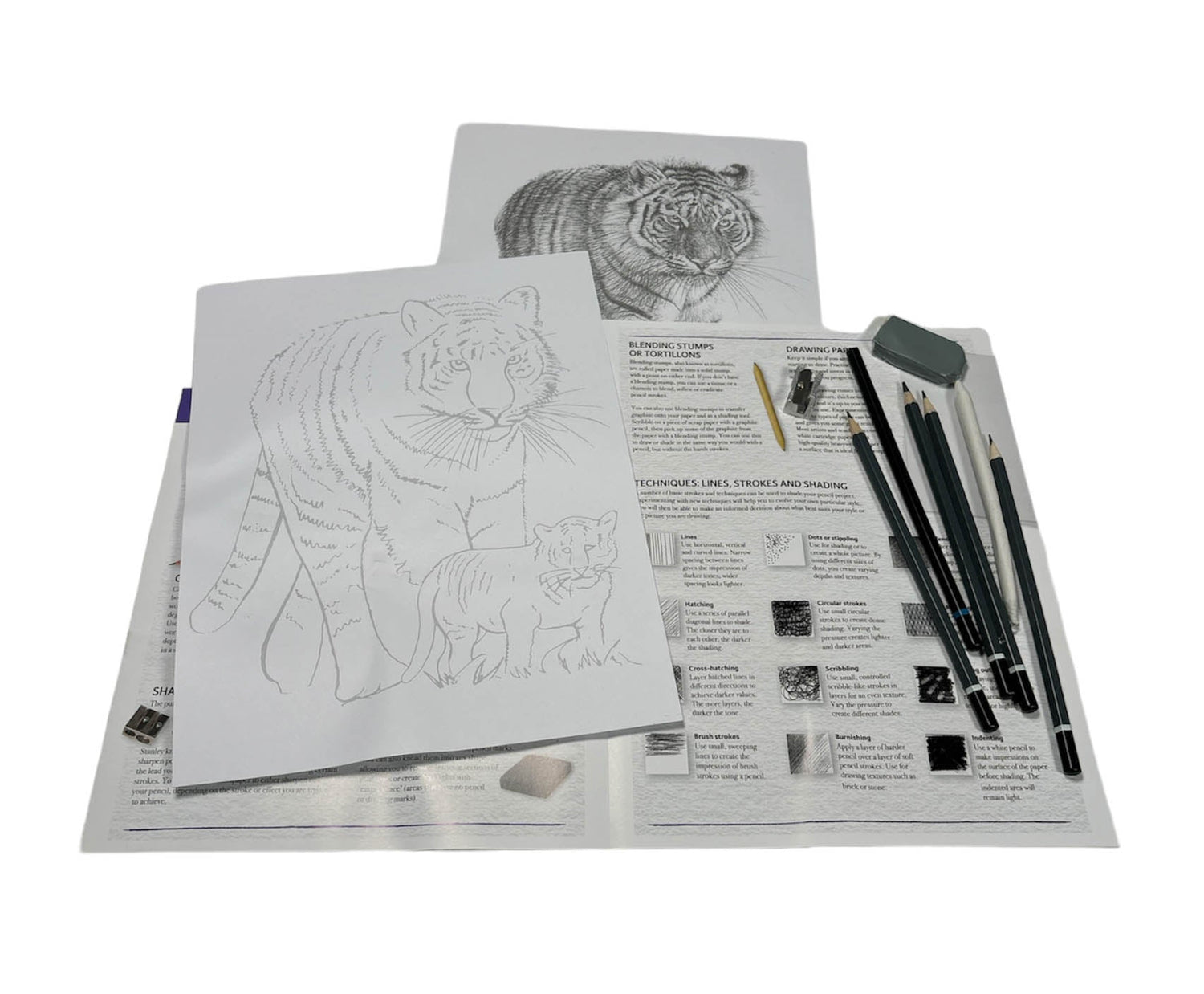 Package includes: 1 drawing board, 1 practice board, 1 reference board, 1 instruction manual (English language not guaranteed). 1 charcoal pencil, 4 grey pencils, 1 tortillon, 1 eraser, 1 metal sharpener
