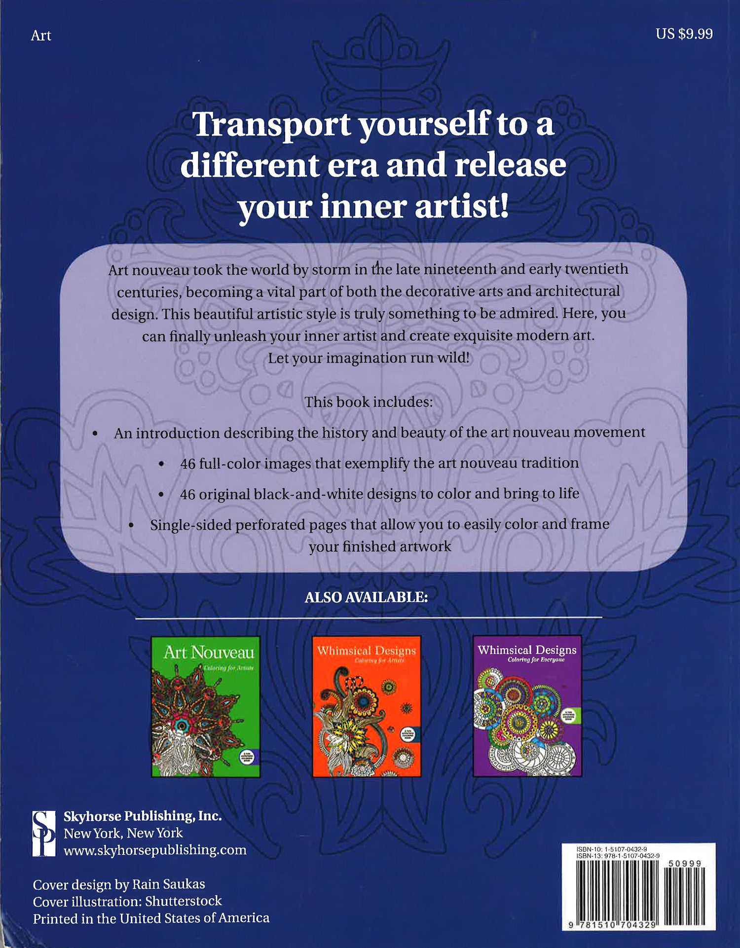 Art nouveau took the world by storm in the late nineteenth and early twentieth centuries, becoming a vital part of both the decorative arts and architectural design. This beautiful artistic style is truly something to be admired. Here, you can finally unleash your inner artist and create exquisite modern art. Let your imagination run wild. This book features forty-six unique black-and-white art nouveau motifs for readers to color, with perforations allowing them to be removed and displayed, and a gallery of forty-six inspiring, fully colored images. Enhanced with intricate floral detail, animal themes, unique patterns, and step-by-step instructions on how to best color and create modern art designs, this book has a little bit of something for everyone. Whether you're an artist looking to improve your craft, or simply just an average joe who finds coloring enjoyable and relaxing, this book is a must-have guaranteed to bring hours of vibrant, artistic fun. In summary, this compilation: Begins with an introduction describing the history and beauty of the art nouveau practice Features forty-six original black-and-white designs for readers to color on single-sided perforated pages, allowing them to remove and frame their artwork Includes forty-six full-color images that exemplify the art nouveau tradition