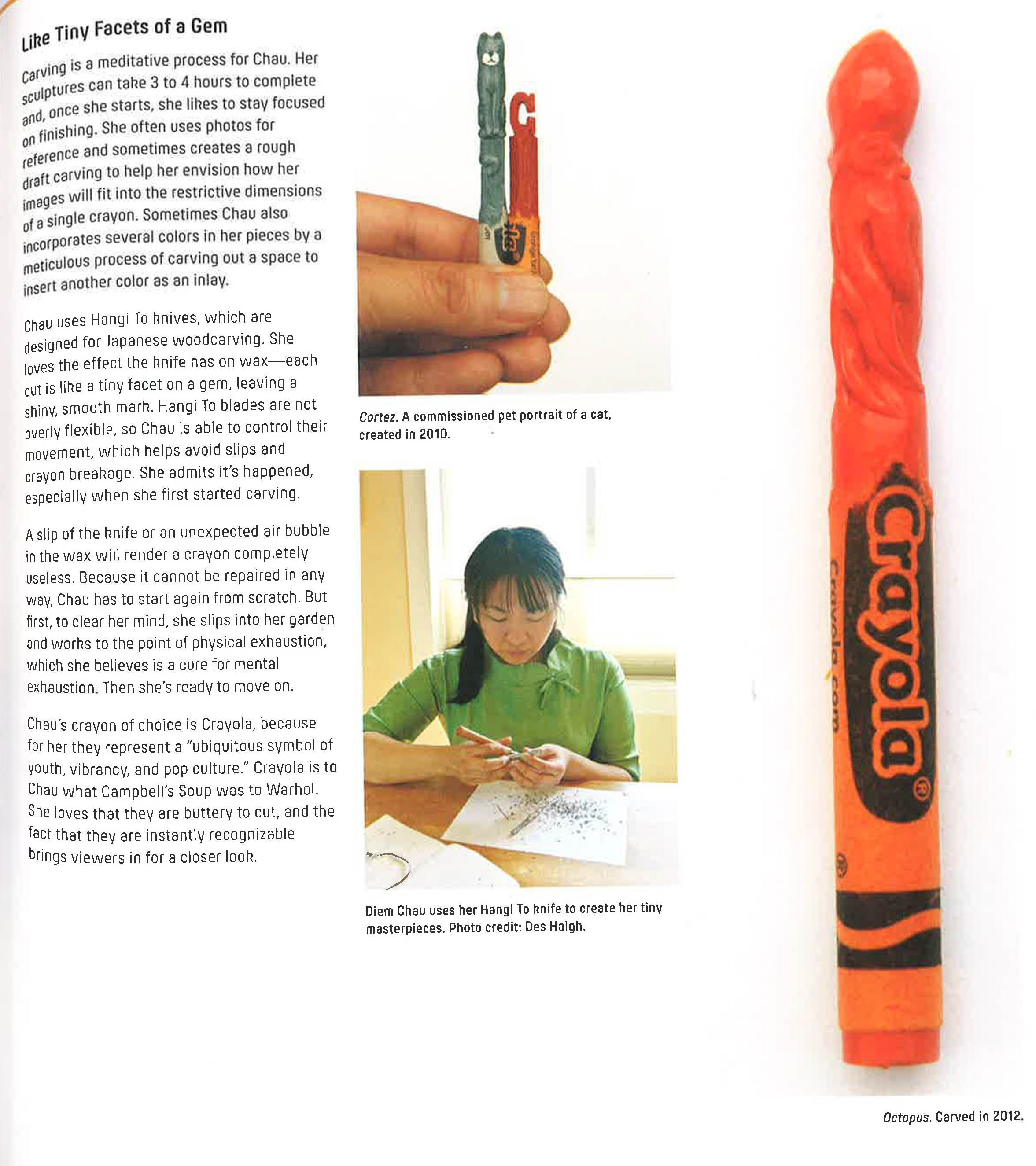 Crayons aren't just for kids anymore!Sculptors use them whole, bundling thousands of crayons to create environmental and installation-size sculptures. Carvers pierce and reshape crayons with scalpels, turning them into mini totems, helixes, and portrait busts. Landscape and still-life artists layer crayon shades in works on paper that rival paintings in their subtlety and depth. What will you do?!