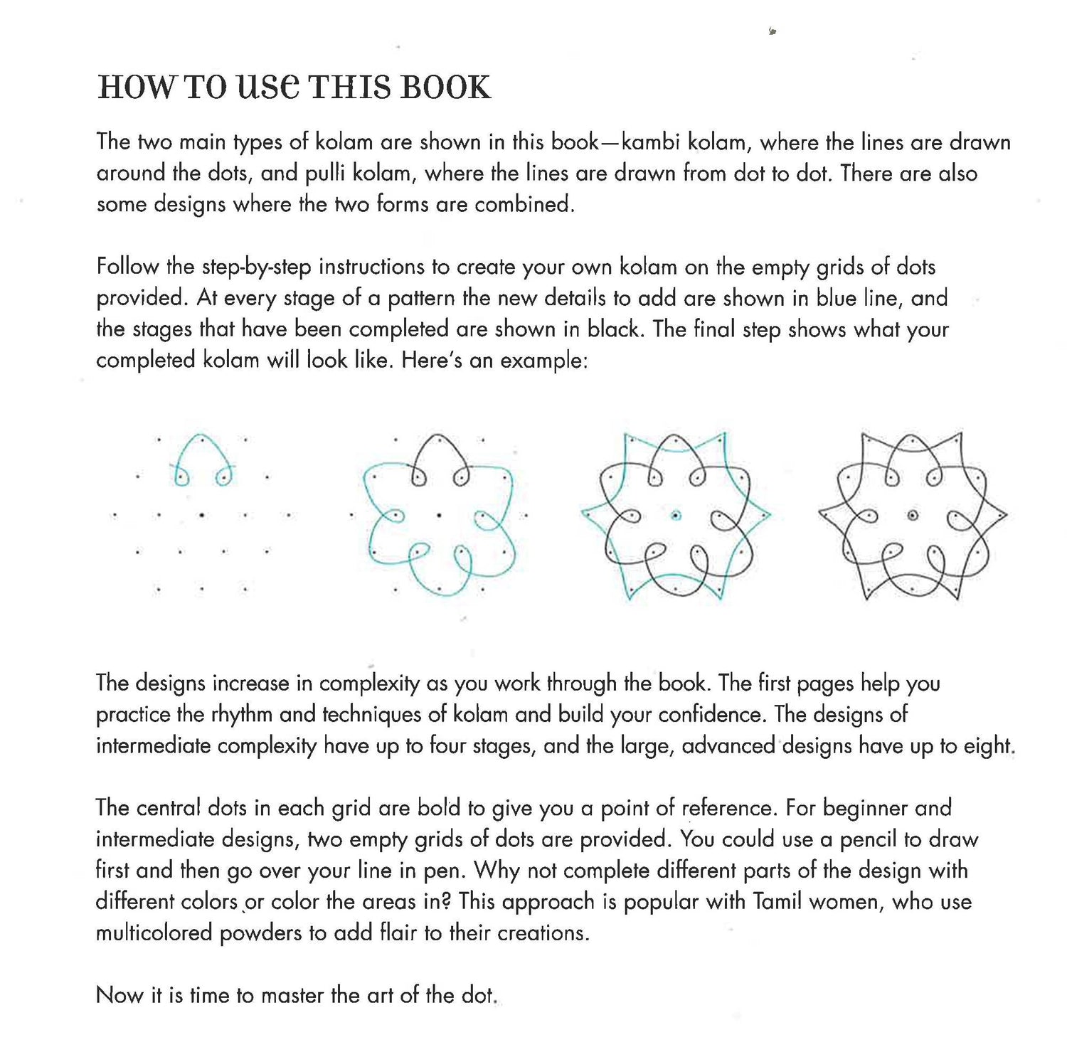 Kolam are beautiful patterns made up of lines that flow through and around grids of dots. Using the easy-to-follow instructions in this book, art lovers can create and color these gorgeous geometric designs, an ancient art form from India.