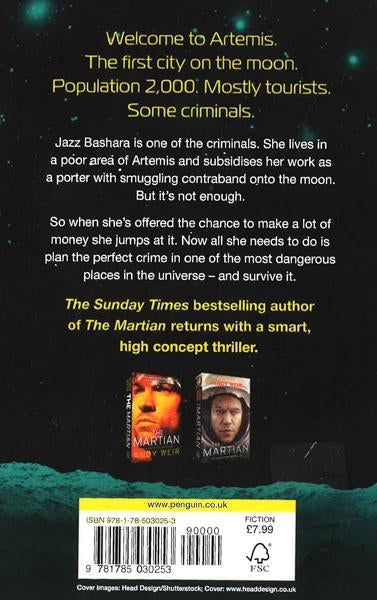 Ever had a bad day? Try having one on the moon...'Fascinating' Tim Peake, Sunday Times bestselling author of Ask an Astronaut------------------------------------------WELCOME TO ARTEMIS. The first city on the moon.Population 2,000. Mostly tourists.Some criminals.Jazz Bashara is one of the criminals. She lives in a poor area of Artemis and subsidises her work as a porter with smuggling contraband onto the moon. But it's not enough.So when she's offered the chance to make a lot of money she jumps at it. But though planning a crime in 1/6th gravity may be more fun, it's a lot more dangerous...------------------------------------------What everyone's saying about this smart, high concept thriller: 'A smart, fun, fast-paced adventure that you won't be able to put down' Ernest Cline, bestselling author of Ready Player One'What a page turner!' Milda on Goodreads, 5 stars'Fast paced, high octane and highly entertaining' Chrys on Netgalley, 5 stars'Artemis does for the moon what The Martian did for Mars' Guardian'A first rate thriller, this had me hooked from beginning to end' Robert on Netgalley, 5 stars'An absolute must read' Lauren on Goodreads, 5 stars'A clever and action-fuelled story' Culturefly'For those who loved The Martian, you won't be disappointed' Liz on Netgalley, 5 stars
