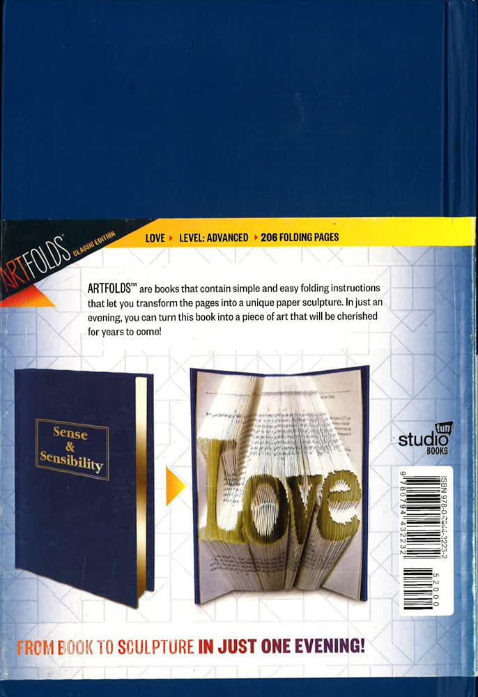 This version of Sense & Sensibilities is more than just a book! Inside are simple instructions that show readers how to fold pages to transform this book into a beautiful, personal, and long-lasting work of art as the pages evolve into an amazing sculpture displaying the word LOVE. An ArtFolds book is a hardcover book that is transformed into a unique paper sculpture merely by folding pages, based on our exclusive, patent-pending instructions. The process is fun and easy and takes surprisingly little time, making it as appropriate for children as it is for adults. Each Classic Edition, with its embossed cover and foil-edged pages, is based on a much-loved classic work of fiction. In ArtFolds: LOVE, readers will find the complete text of Jane Austen's Sense & Sensibility, the cherished story of the Dashwood sisters and their search for love. With 206 pages to fold, this ArtFolds is at Advanced level.