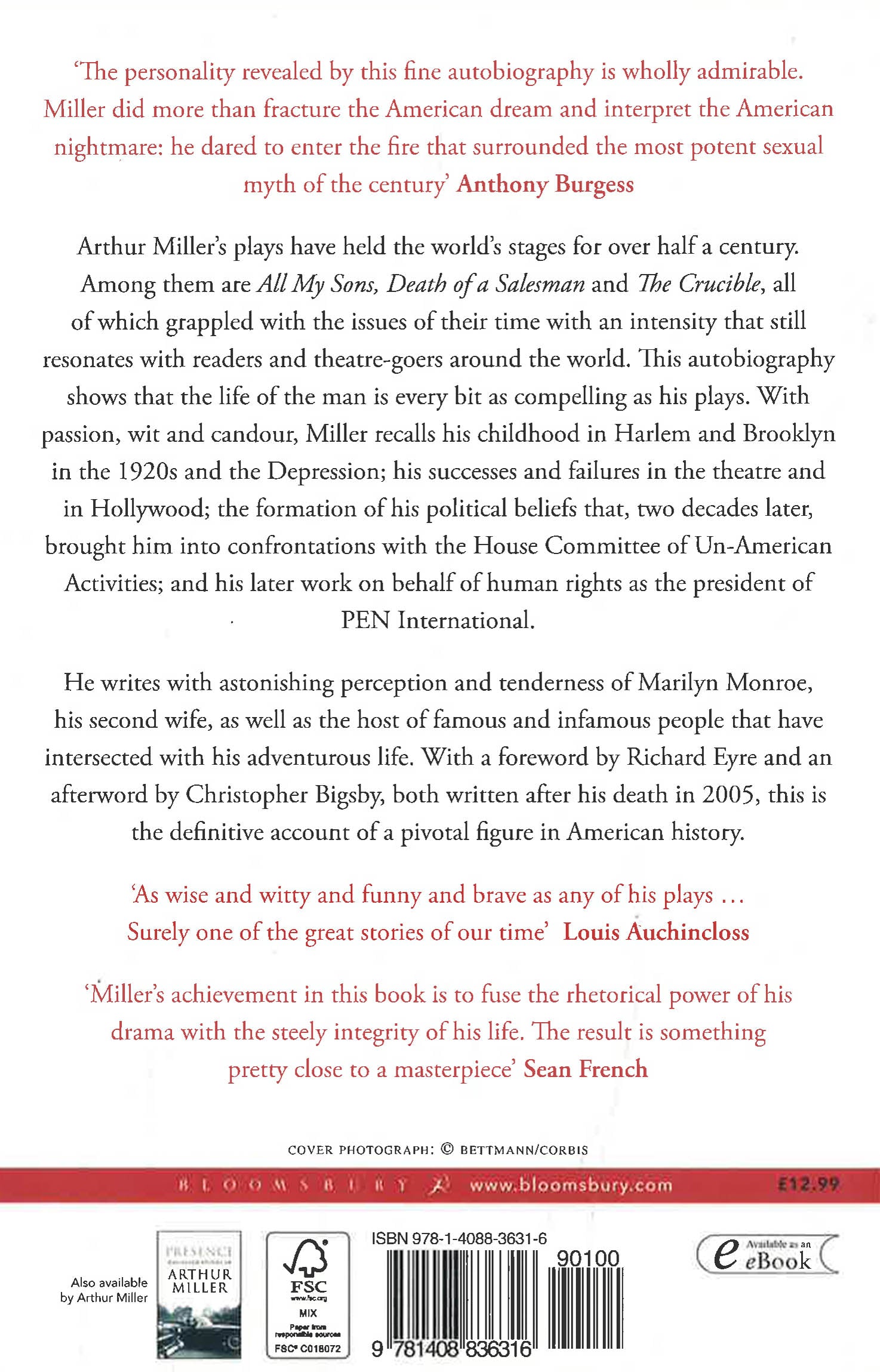 Arthur Miller's plays have held the world's stages for almost half a century. Among them are Death of a Salesman, The Crucible, and All My Sons, which have been read and performed countless times across the world. His memoir, Timebends, shows that the life of the man is as compelling as his plays. With passion, wit and candour, Miller recalls his childhood in Harlem and Brooklyn in the 1920s and the Depression; his successes and failures in the theatre and in Hollywood; the formation of his political beliefs that, two decades later, brought him into confrontations with the House Committee of Un-American Activities; and his later work on behalf of human rights as the president of PEN International.