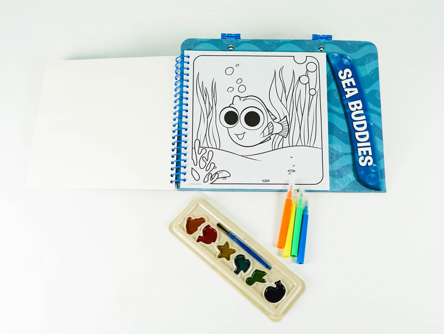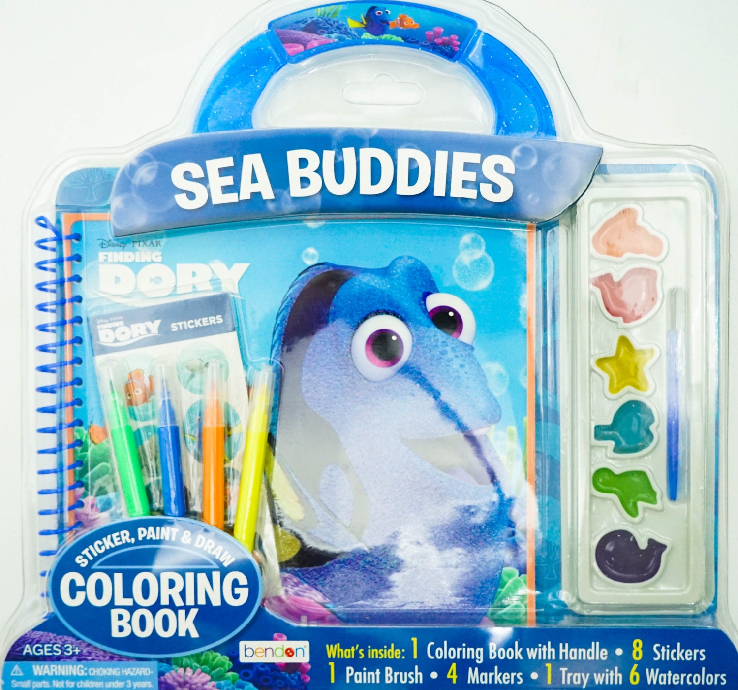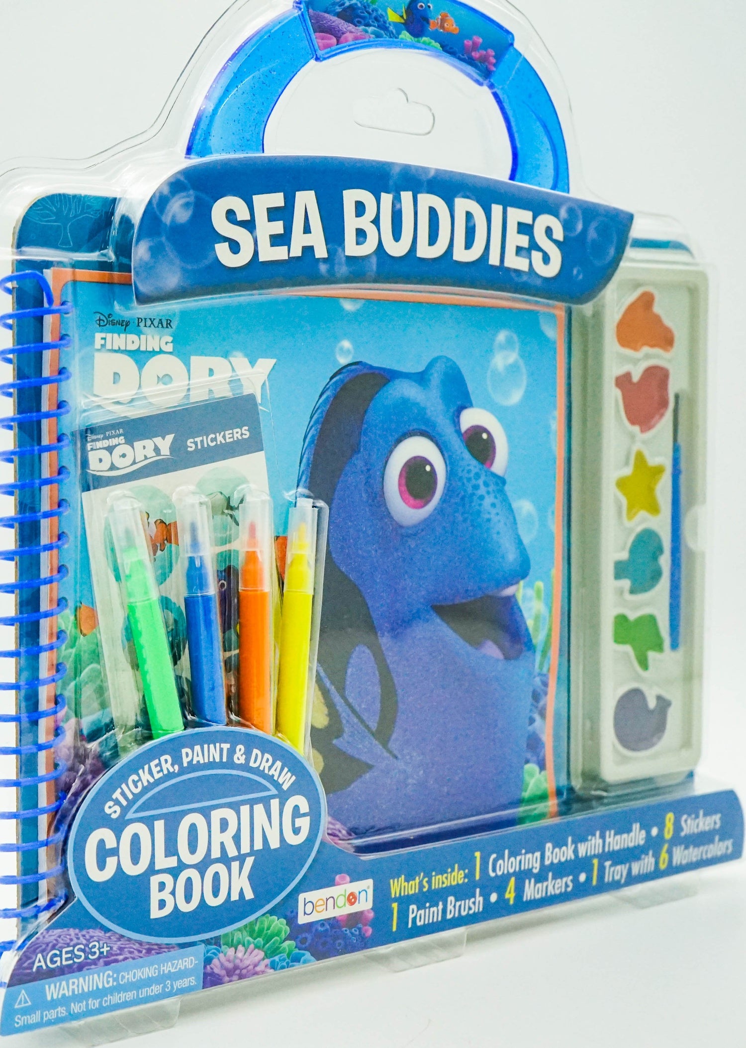 Give your little artist a kit worthy of his or her potential with bendon's Finding Dory paint and color set! use the mini gel pens, paintbrush, and watercolors to doodle and decorate the handled activity book, then, as an added bonus, bedazzle each page with a sticker!.