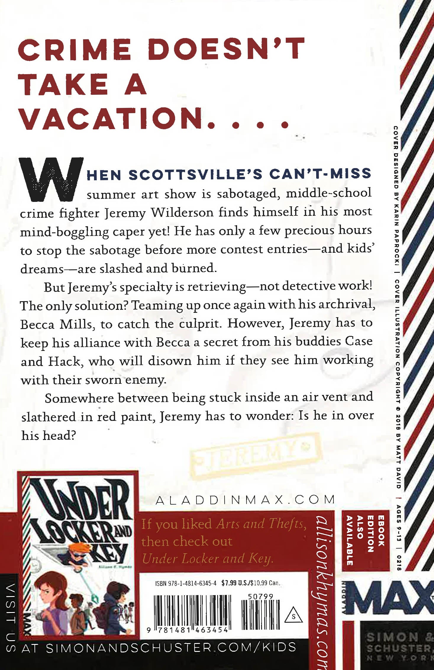 Middle school retrieval specialist Jeremy Wilderson must team up with preteen private detective Becca Mills once again to solve his most mind-boggling case yet in this action-packed MAX novel. Ahh, summer vacation! Jeremy Wilderson, Scottsville Middle School's first (and only) retrieval specialist, is enjoying a slower-than-usual season of retrieving (NOT stealing) lost objects in order to help the under thirteen population of Scottsville. But crime doesn't take a vacation! And when sabotage strikes Scottsville's event of the year--the Summer Art Show--threatening to ruin the burgeoning painting career of Jeremy's best friend, Case, it's up to Jeremy to figure out what's going on. Of course, his archrival Becca Mills, who just happens to think Jeremy, Case, and their friend Hack are involved in the crime, is also looking into it. Jeremy has only a few precious hours to stop the sabotage before more contest entries--and kids' dreams--are slashed and burned. But Jeremy's specialty is retrieval...not detective work! The only solution is to team up with Becca to solve the case, something Jeremy's not exactly thrilled to do. Not to mention, he has to keep his alliance with Becca a secret from Case and Hack, who will disown him if they see him working with the enemy. Somewhere between being stuck inside an air vent and slathered in red paint, Jeremy has to wonder: is he in over his head?
