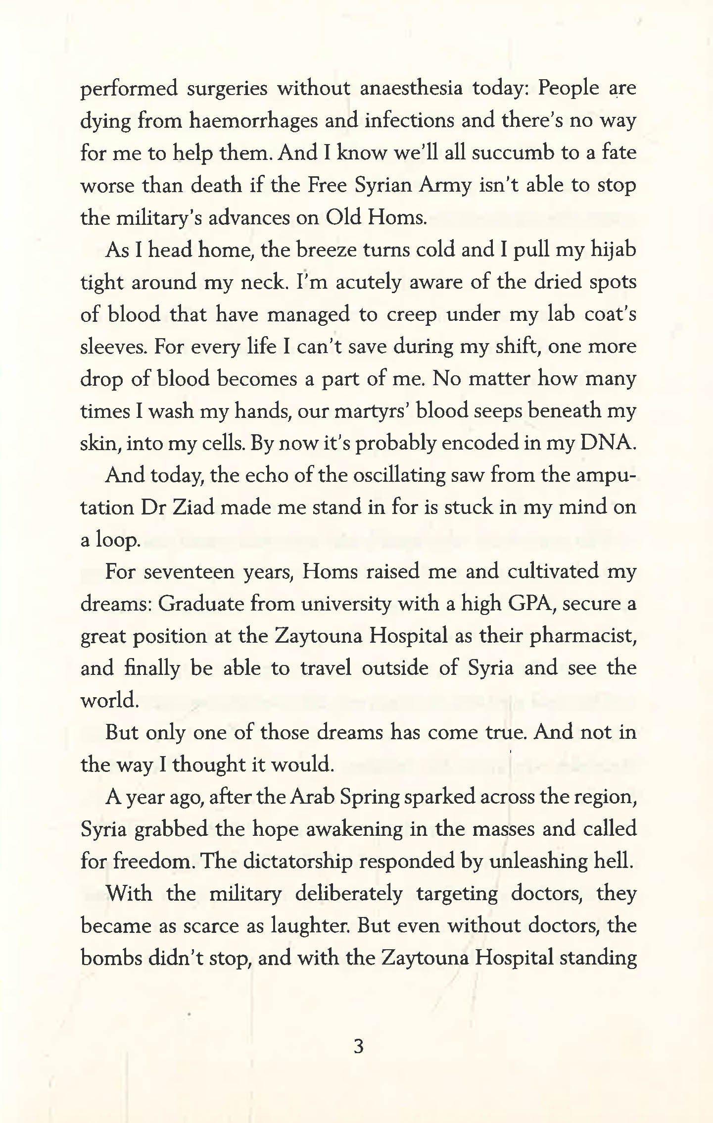 But even with Khawf pressing her to leave, when she crosses paths with Kenan, the boy she was supposed to meet on that fateful day, she starts to doubt her resolve in leaving home at all. Soon, Salama must learn to see the events around her for what they truly are not a war, but a revolution and decide how she, too, will cry for Syria's freedom.