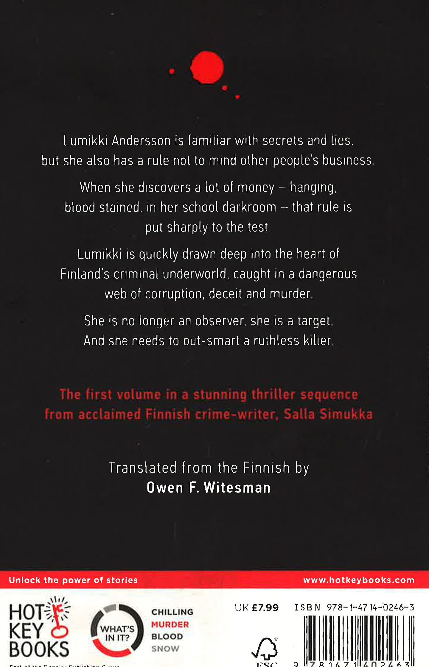 The streets of Finland are frozen and white with snow. And nothing is as red against snow as blood ...Seventeen-year-old Lumikki Andersson is hardly your average teenager. She lives by herself in the city of Tampere, Finland, and has a firm rule to mind nobody's business but her own. But that rule is put to the test when she happens upon five hundred washed euro notes hanging up to dry in her school's darkroom, and it is shattered once Lumikki realises who owns them. Caught in an increasingly tangled web of deception, corruption and danger, Lumikki finds herself navigating Tampere's dark underbelly in her quest to expose its shocking connection to the international drugs trade. Lumikki is smart, but is she smarter than a master criminal? Can she bring down the infamous 'Polar Bear' - or will she become another one of his victims?