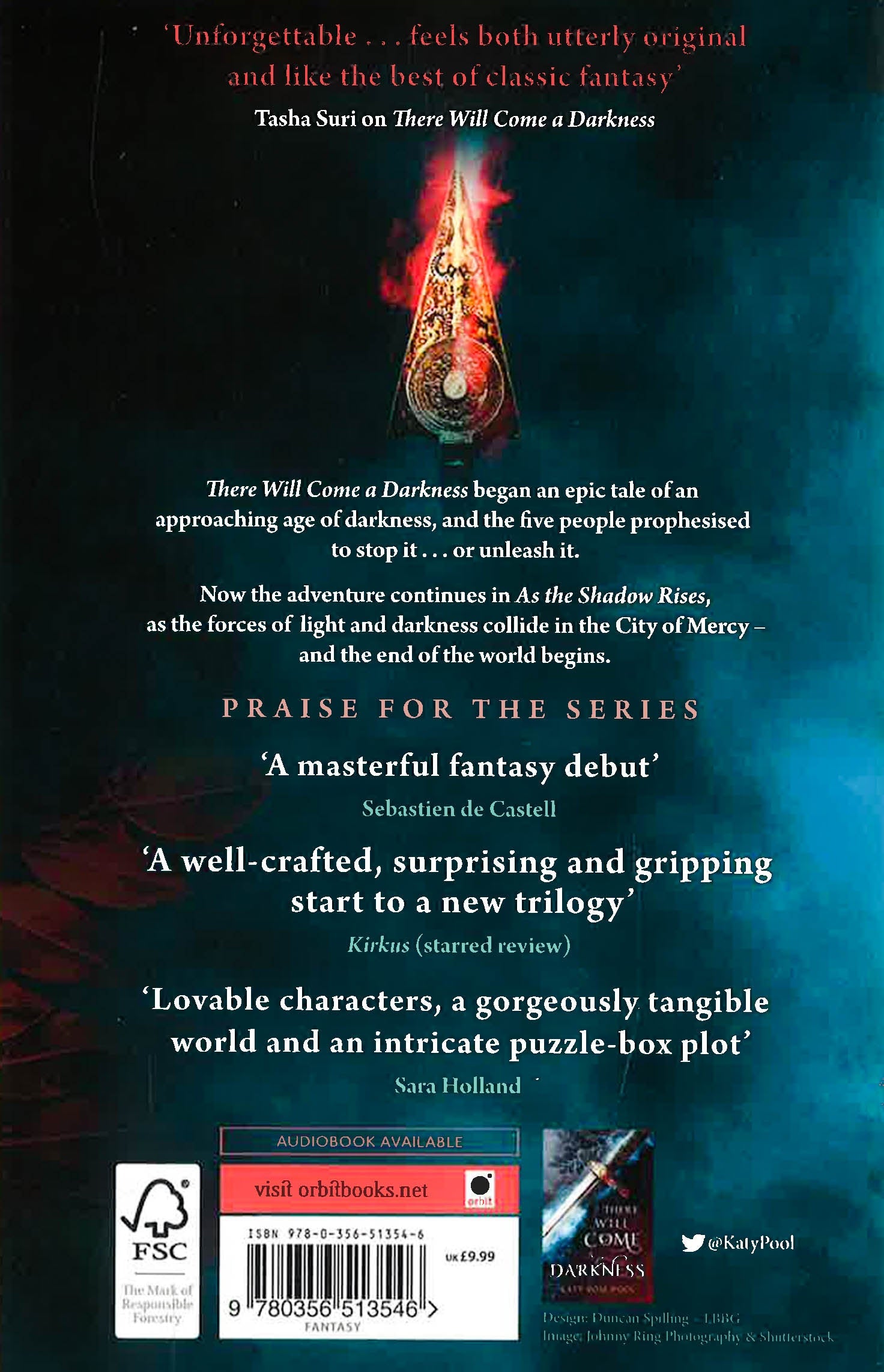 As the Shadow Rises is the spectacular second novel in Katy Rose Pool's Age of Darkness trilogy - a YA fantasy blockbuster packed with magic, prophecy and adventure. Katy Rose Pool 's showstopping fantasy debut There Will Come a Darkness began an epic tale of thrilling magic, ancient prophecy and five lives who could stop the approaching Age of Darkness - or unleash it.Now the adventure continues in As the Shadow Rises, as the forces of light and darkness collide - and the end of the world begins.Praise for There Will Come a Darkness'Katy Rose Pool is a writer to watch' Sebastien De Castell'A can't-miss debut from an exciting new talent' Kiersten White'Unforgettable . . . feels both utterly original and like the best of classic fantasy' Tasha Suri'Katy Rose Pool combines lovable characters, a gorgeously tangible world and an intricate puzzle-box plot to create a story that will pull you inexorably toward the explosive end' Sarah Holland