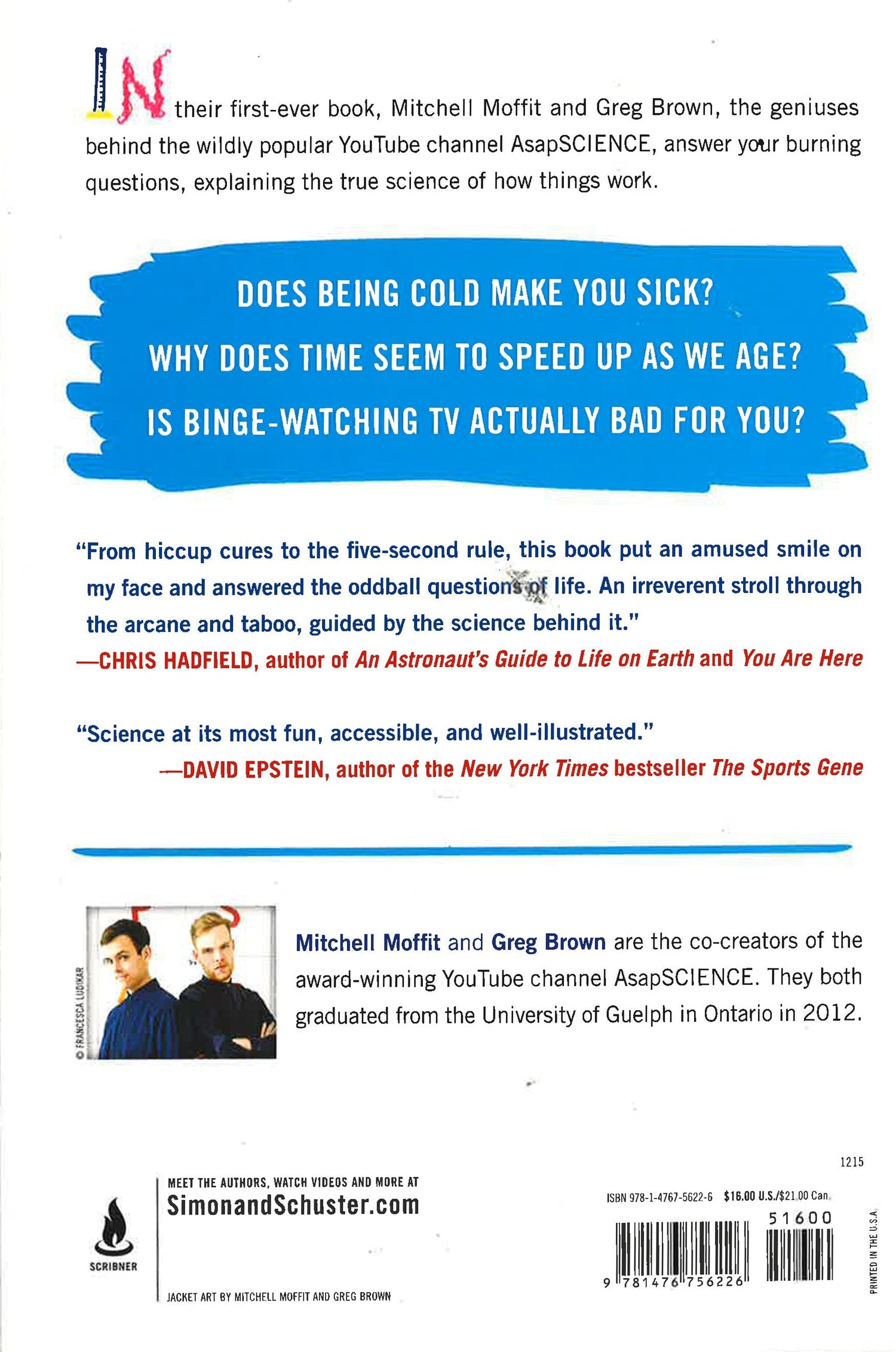 The instant New York Times bestselling book of entertaining, irreverent, and totally accessible illustrated answers to the scientific "questions you had no idea were bugging you all your life" (Fast Company), from the creators of the wildly popular YouTube channel AsapSCIENCE. Why do we get hung over? What would happen if you stopped sleeping? Is binge-watching TV actually bad for you? Why should I take a power nap? In their first-ever book, Mitchell Moffit and Greg Brown, the geniuses behind the YouTube channel AsapSCIENCE, explain the true science of how things work in their trademark hilarious and fascinating fashion. Applying the fun, illustrated format of their addictive videos to topics ranging from brain freeze to hiccups to the science of the snooze button, AsapSCIENCE takes the underpinnings of biology, chemistry, physics, and other hard sciences and applies them to everyday life through quirky and relatable examples that will appeal to both science nerds and those who didn't exactly ace chemistry. This is the science that people actually want to learn, shared in a friendly, engaging style. "Science is big fun. The ASAP guys get that, and they'll show you--they'll even draw you a diagram" (Bill Nye, "The Science Guy"). And amid the humor is great information and cocktail conversation fodder, all thoughtfully presented. Whether you're a total newbie or the next Albert Einstein, this guide is sure to educate and entertain...ASAP.