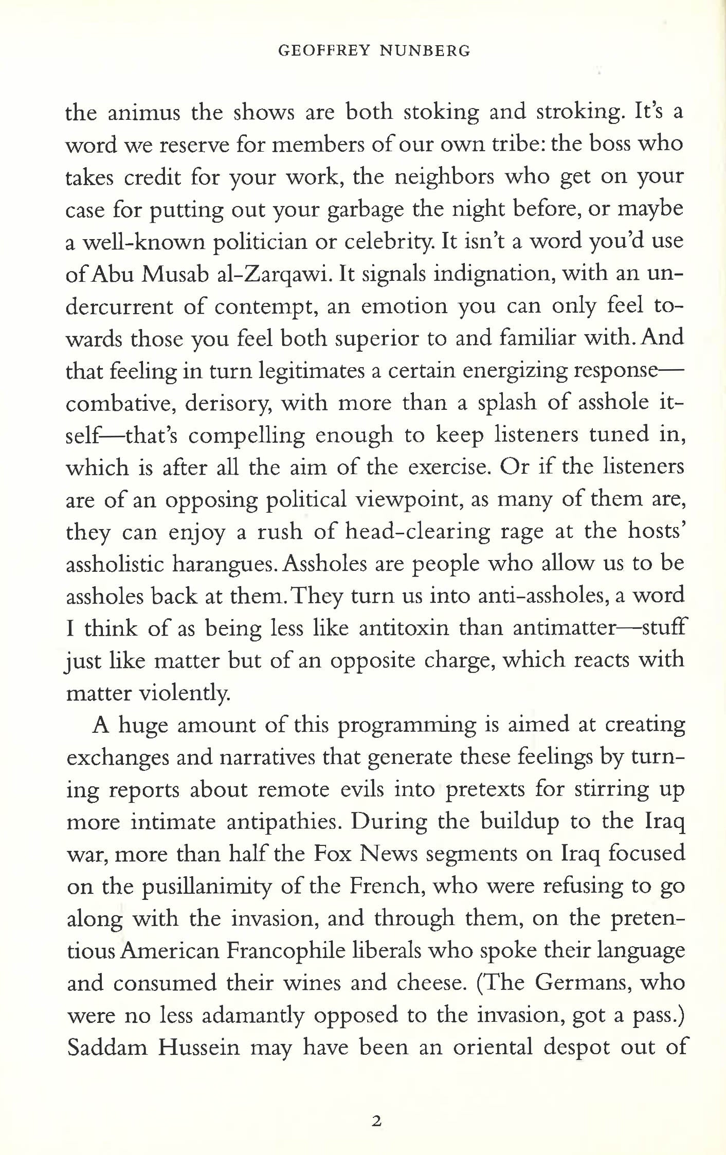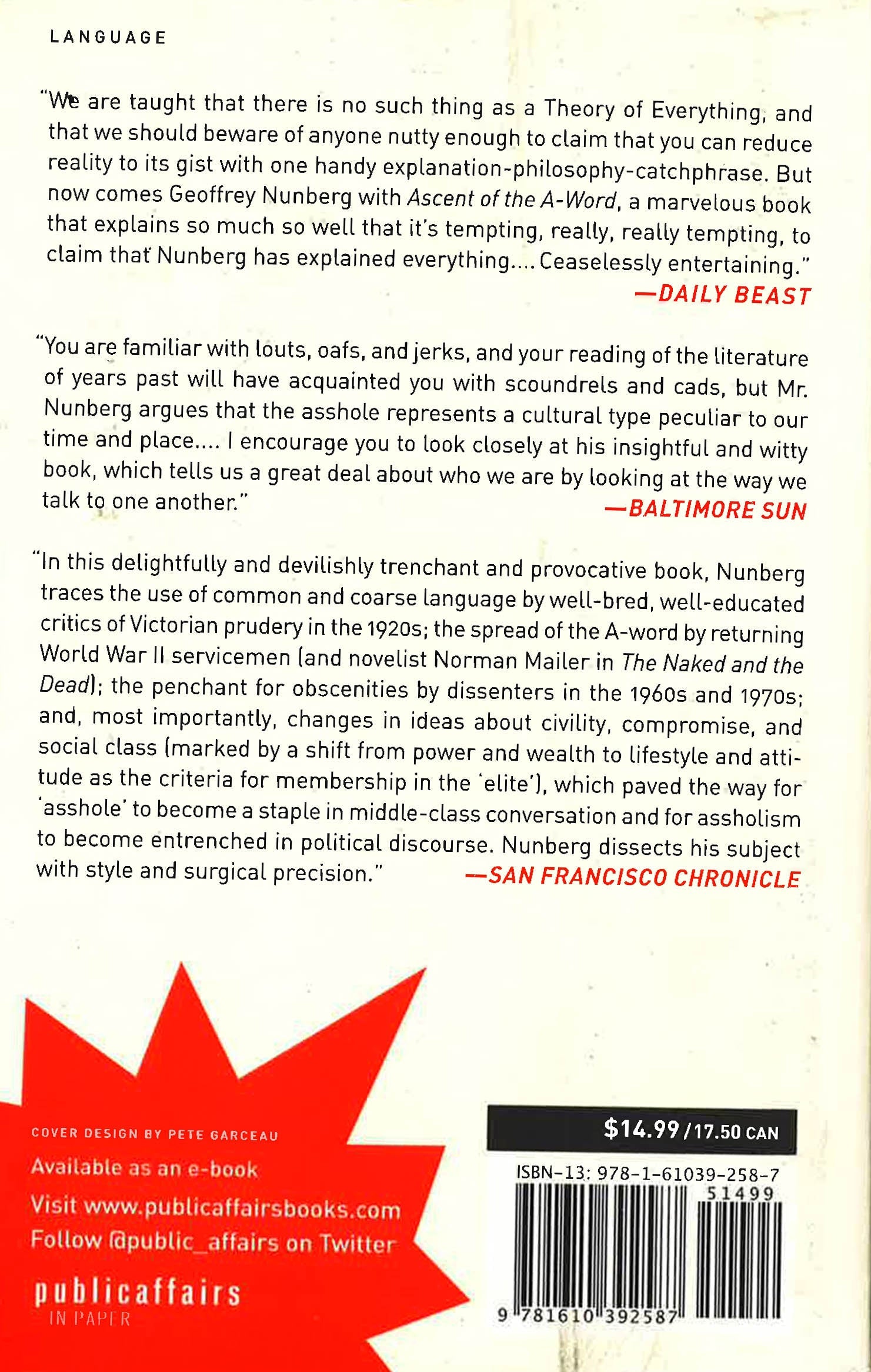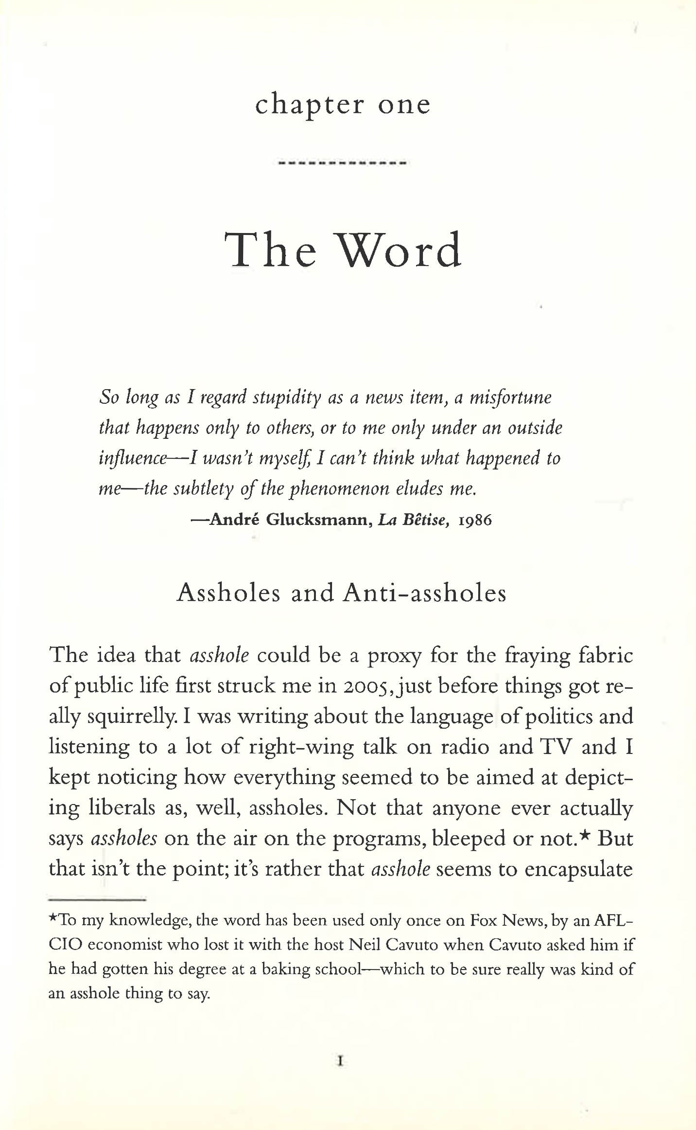 It first surfaced in the gripes of GIs during World War II and was captured early on by the typewriter of a young Norman Mailer. Within a generation it had become a basic notion of our everyday moral life, replacing older reproaches like lout and heel with a single inclusive category--a staple of country outlaw songs, Neil Simon plays, and Woody Allen movies. Feminists made it their stock rebuke for male insensitivity, the est movement used it for those who didn't"get it," and Dirty Harry applied it evenhandedly to both his officious superiors and the punks he manhandled. The asshole has become a focus of collective fascination for us, just as the phony was for Holden Caulfield and the cad was for Anthony Trollope. From Donald Trump to Ann Coulter, from Mel Gibson to Anthony Weiner, from the reality TV prima donnas to the internet trolls and flamers, assholism has become the characteristic form of modern incivility, which implicitly expresses our deepest values about class, relationships, authenticity, and fairness. We have conflicting attitudes about the A-word--when a presidential candidate unwittingly uttered it on a live mic in 2000, it confirmed to some that he was a man of the people and to others that he was a boor. But considering how much the word does for us, and to us, it hasn't gotten nearly the attention it deserves--at least until now.