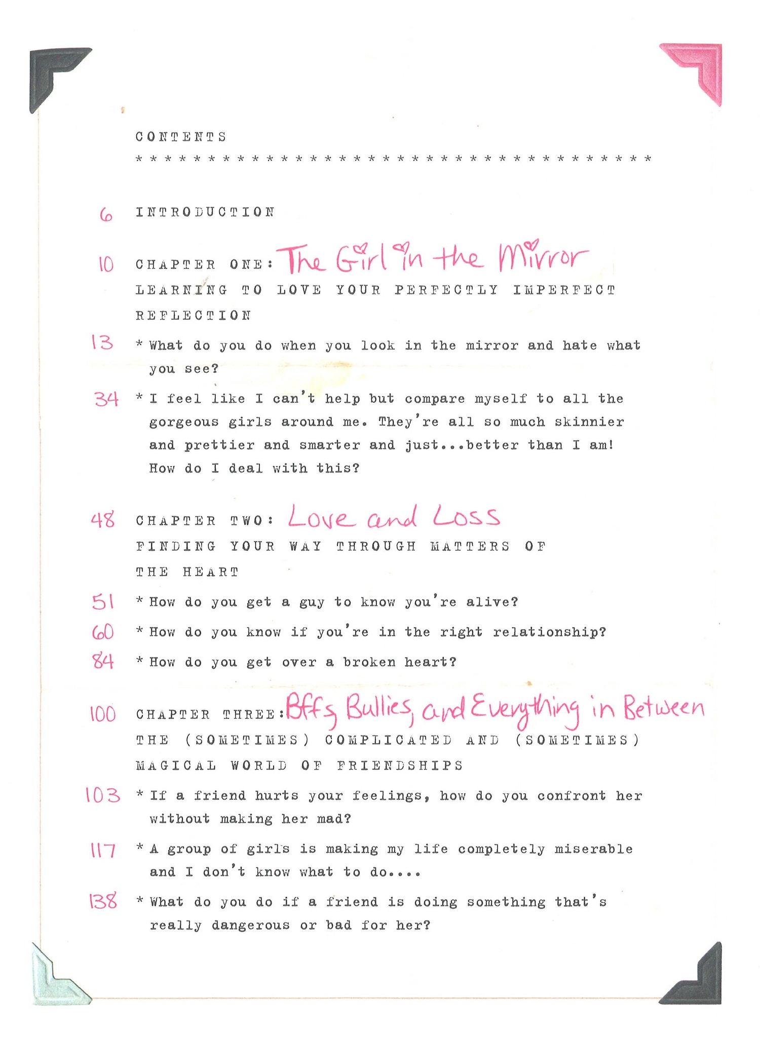 Much like a private diary, the book is a personal resource that girls can turn to when they seek answers to teen life's toughest questions. It contains real and practical advice, anecdotes, and Elizabeth's own life lessons in answer to frequently asked questions from Elizabeth's workshop, such as: "What do you do when you look in the mirror and don't like what you see? or How do you get a guy to know you're alive?"