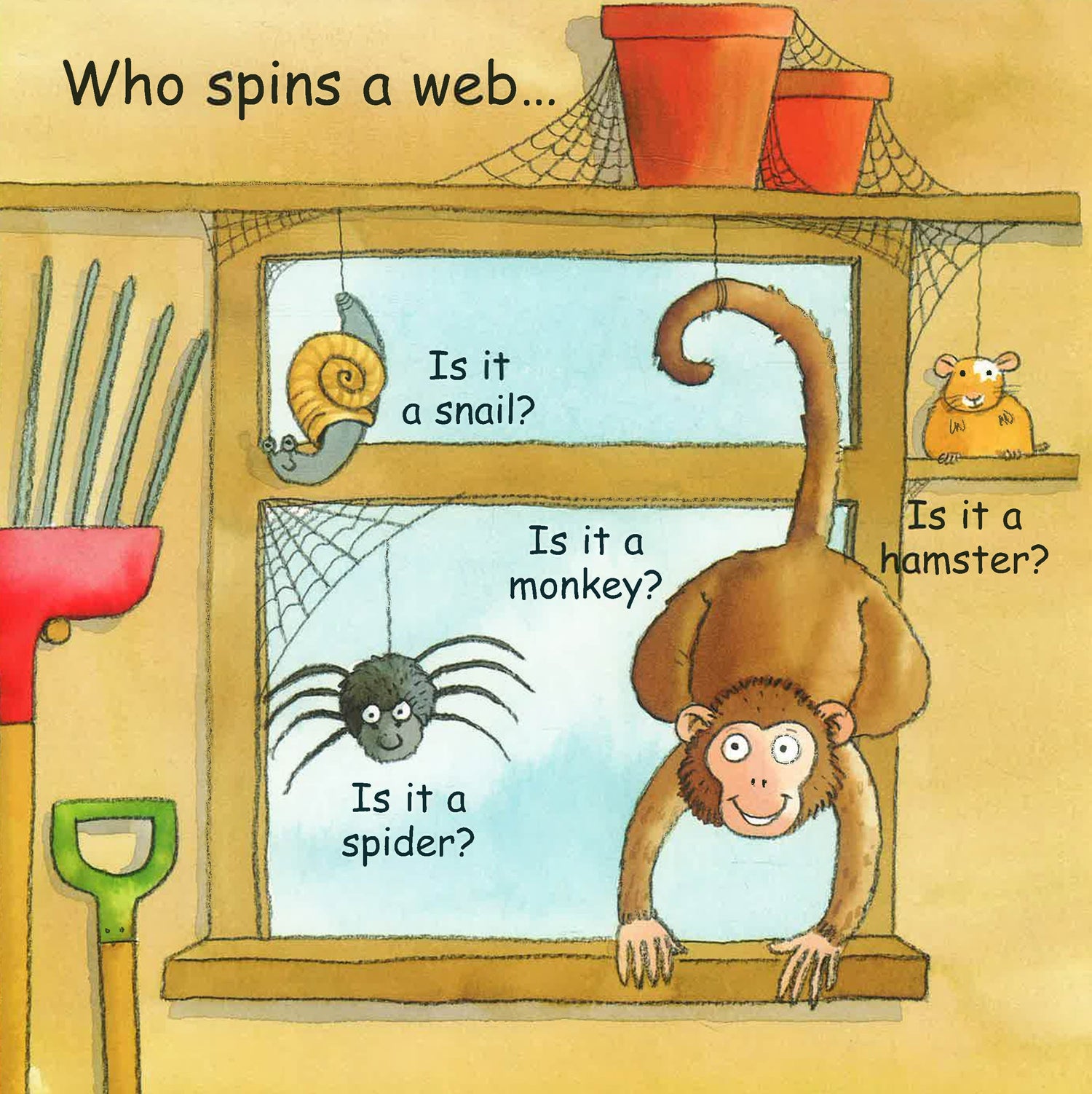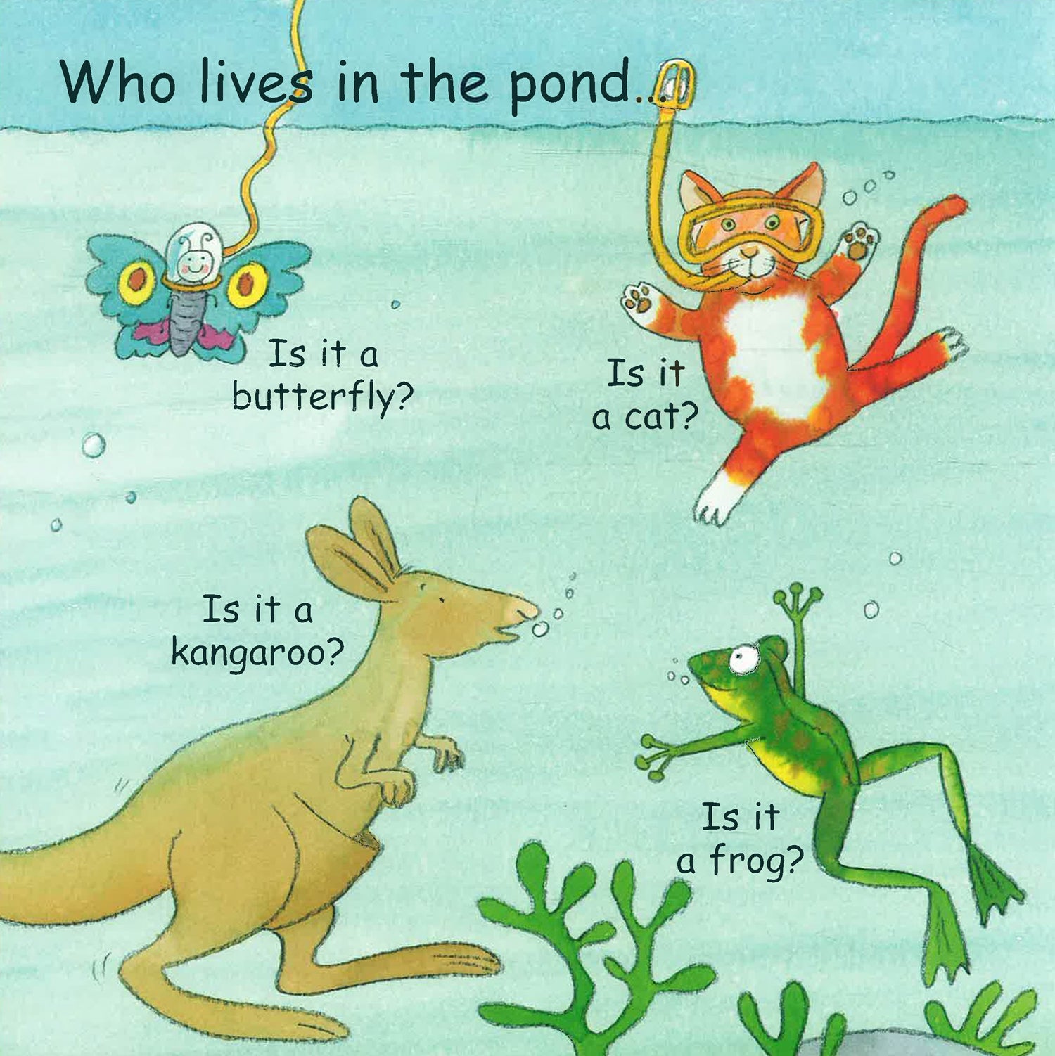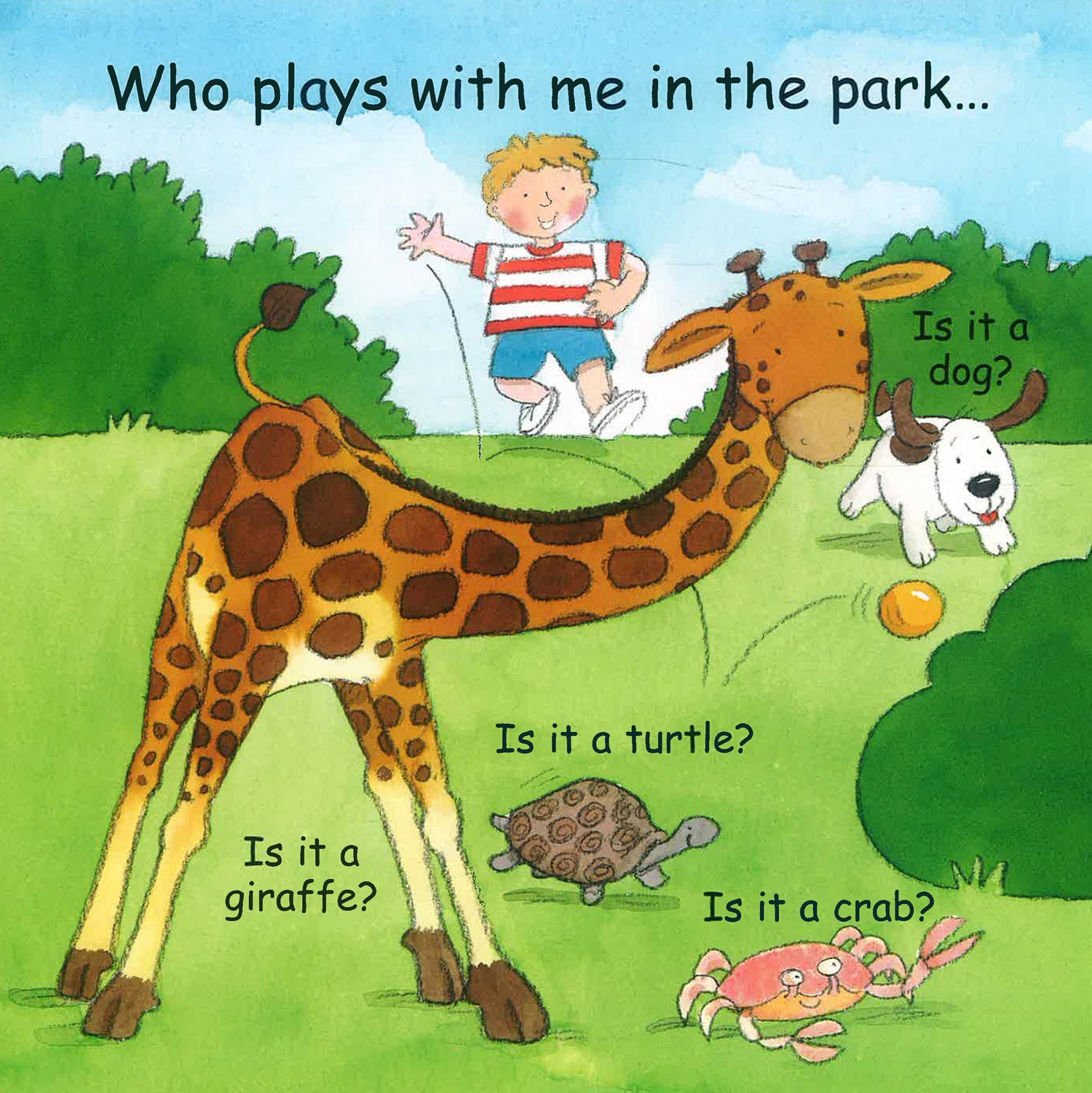 Who lives in the pond? Is it a butterfly, a cat, a kangaroo or a frog? Dive beneath the ripples of water to find out! Who spins a web? Is it a snail, a spider, a monkey or a hamster? Peek under the flower pot and see! Who builds a nest? Is it an elephant, a fish, a bird or a dog? Lift up the leaf and all will be revealed! Who flies from plant to plant? Is it a pig, a bee, a snake or a penguin? Pick a flower and take a look underneath! Who plays with the boy in the park? Is it a giraffe, a turtle, a dog or a crab? Look behind the bush to discover the answer! Who rests under the ground? Is it a sheep, a duck, a fish or a rabbit? Dig up the soil and see! With exciting flaps to lift, cute animals to look at and something to laugh at and talk about on every page, this interactive question and answer book combines fun and learning for the very young.